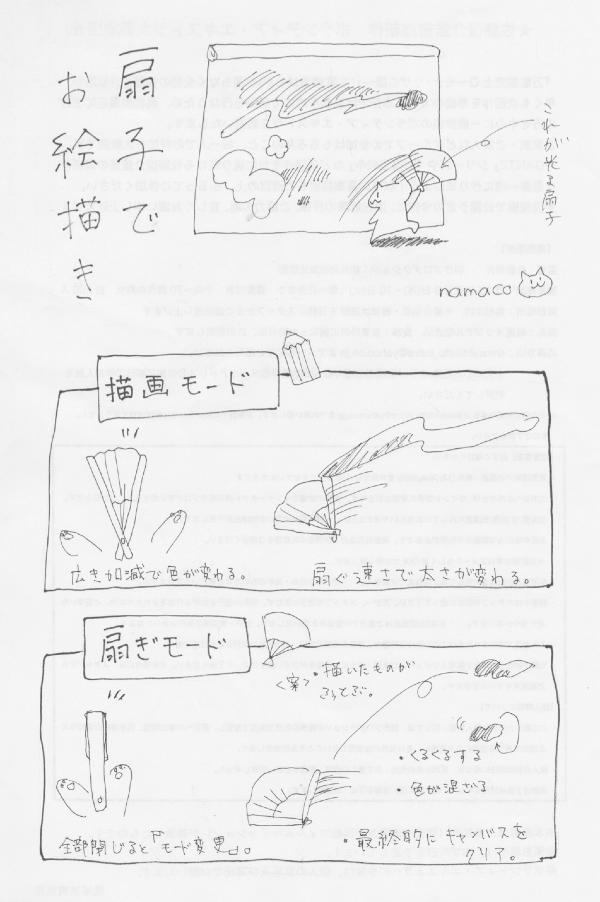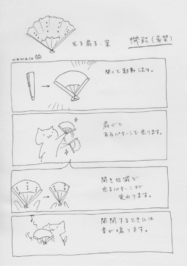 光る扇子の方向で進めていきたいと考えています。 音の鳴り方(タイミング、音色、音程など)は未定。(類似作品) ★