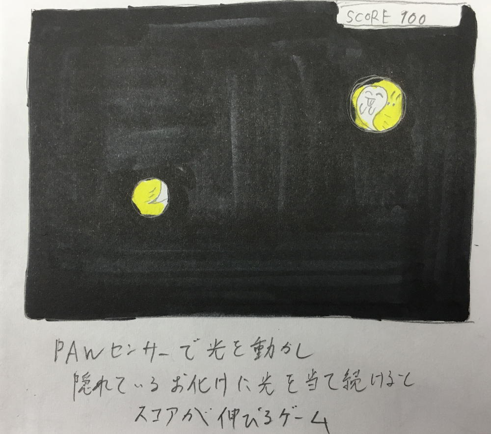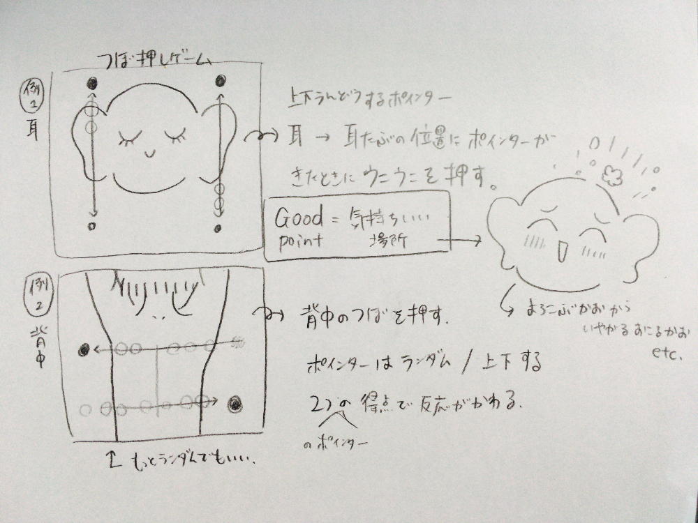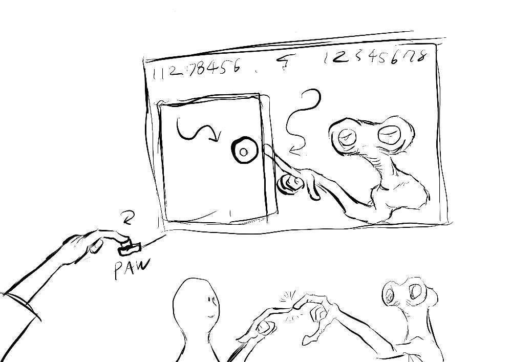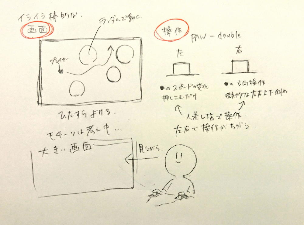 ETの友好の証に人差し指を合わせるシーンから発想(一度も見たことありませんが) 画面上で不規則に動く宇宙人の指になるべく長い時間カーソルを合わせるゲーム。 目標時間を達成するとこちらに都合のいい友好条約を結べる。失敗すると戦争。 PAWセンサーで肉体的楽しさ・不規則な指の動きで偶然性の楽しさ・スコアが積みあがっていく楽しさ 宇宙人のビジュアル的なおもしろさ- 「PAW-double」を使いつつあれこれ考えてみよう(シーズ指向) ★