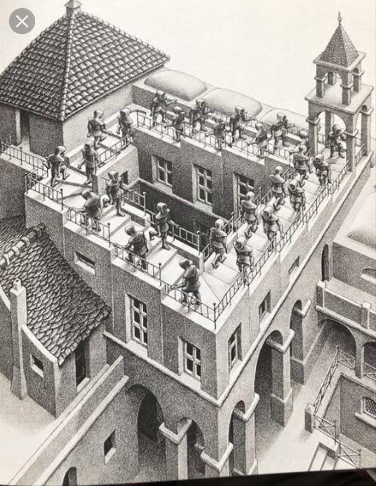 ペンローズの階段(エッシャー) 上っている人も降りている人もいるのが面白い。 アニメーションしてるやつ (過去の先輩作品)がもっと面白くて好きです