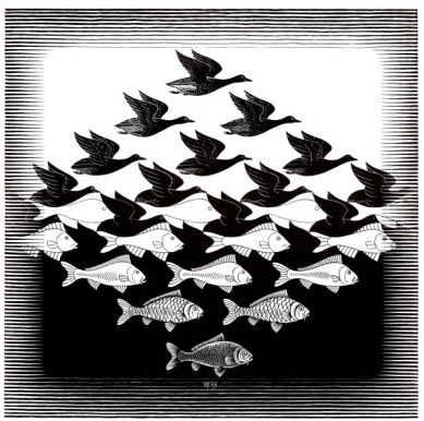 空と水(エッシャー) 図と地の関係が真ん中あたりで反転する。どこから鳥が見えてくるのか…