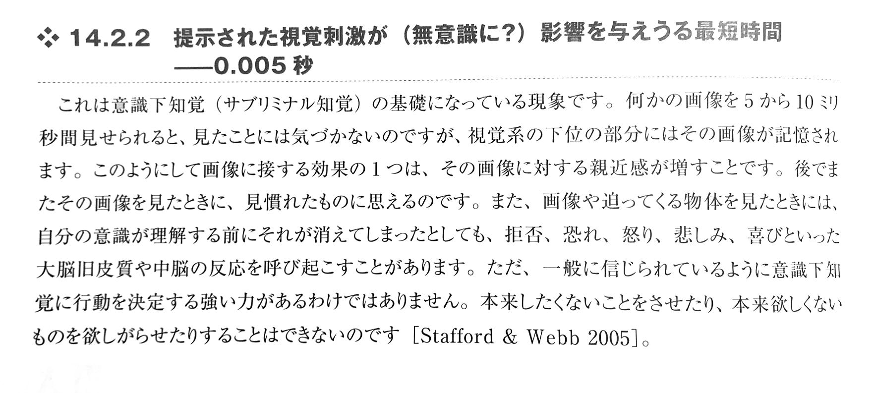 波の錯視 静止画なのにうねって見える持田侑菜 サブリミナル知覚 前回の授業前に送った通りです。何かの画像を5ミリから10ミリ秒間見せられると、見たことには気づかないが、視覚系の下位の部分にはその画像が記憶され、その画像に対する親近感が湧く