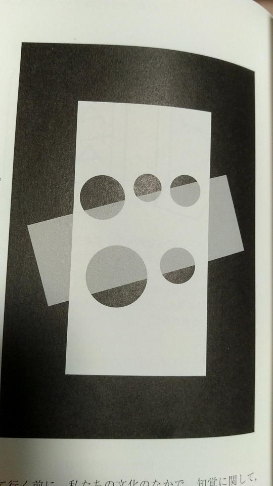 氏名 お気に入りの錯覚 梅田那菜 (タイトル) 見方によって、「穴の開いた白い四角の奥にグレーの四角が見える状態」と「黒い円の手前に半透明のグレーがある状態」の二通りに見える