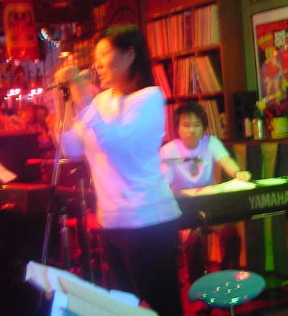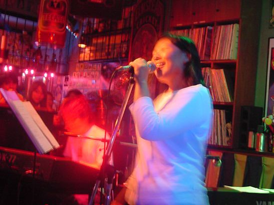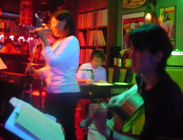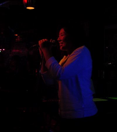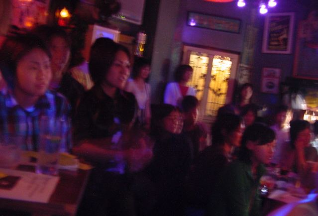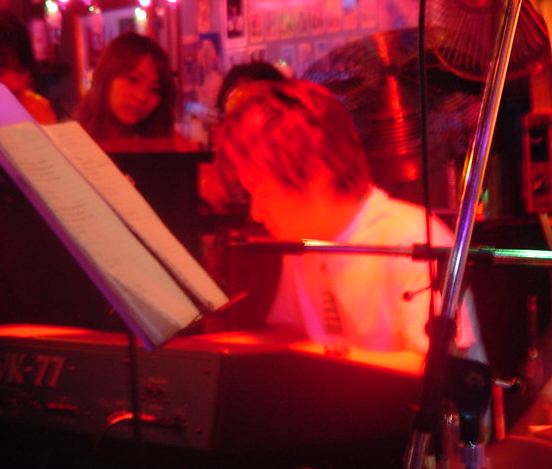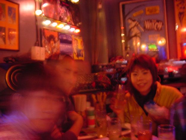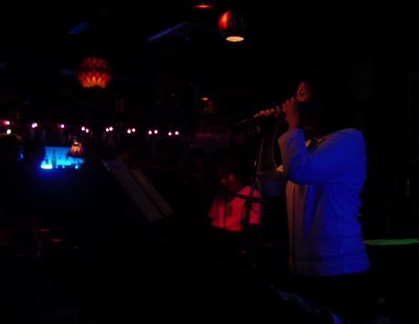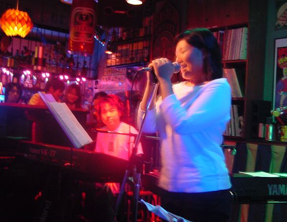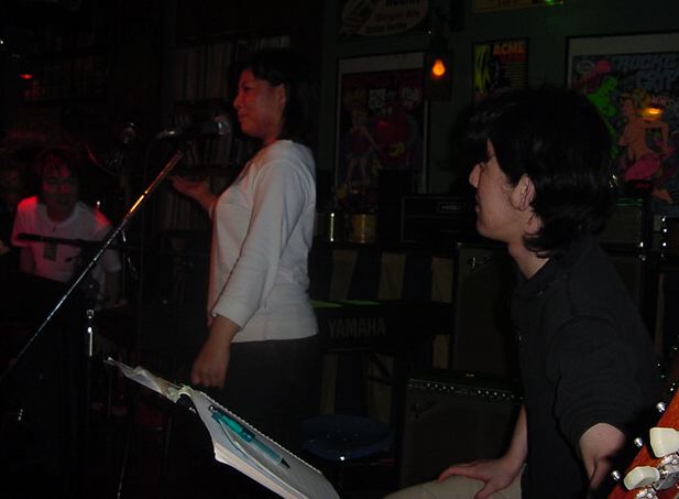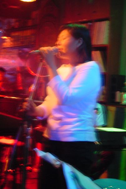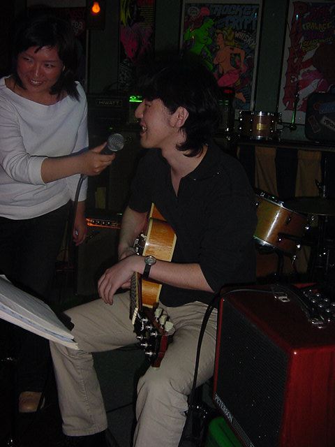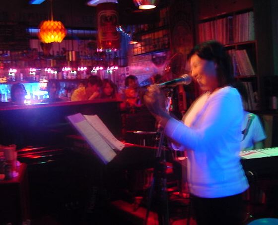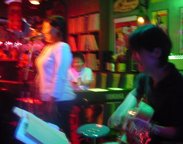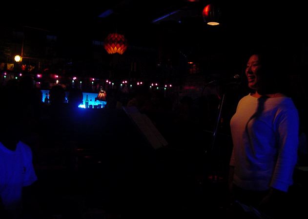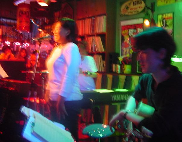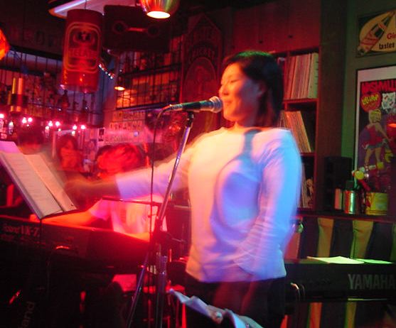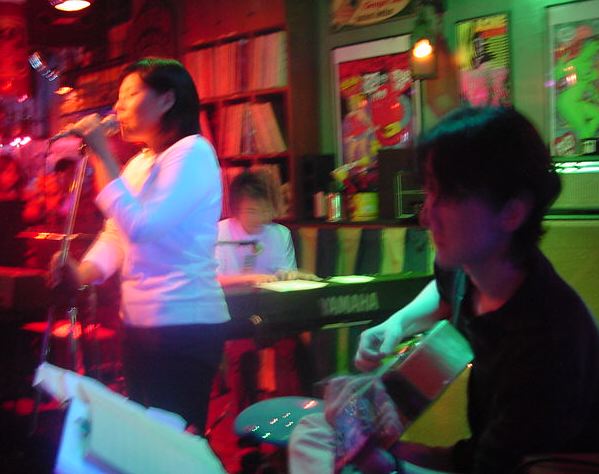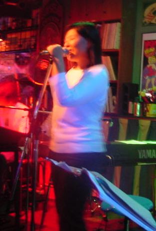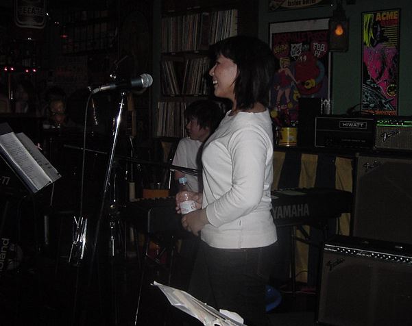 そして、いよいよ「りっきーライブ」の現場です。 心霊写真のように(^_^;)流れているのは、暗い会場で ストロボを焚かずに長時間露光したためですが、 けっこういいカンジに撮れました。 りっきーもなかなか頑張りました。(^_^)