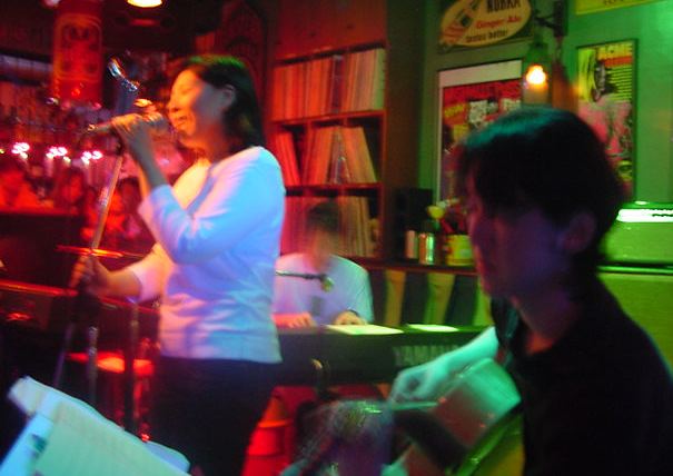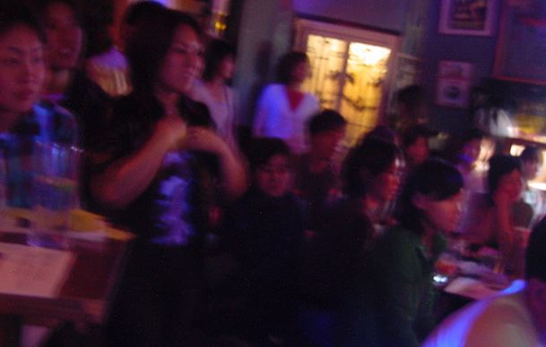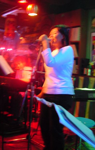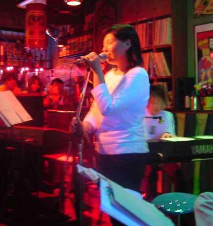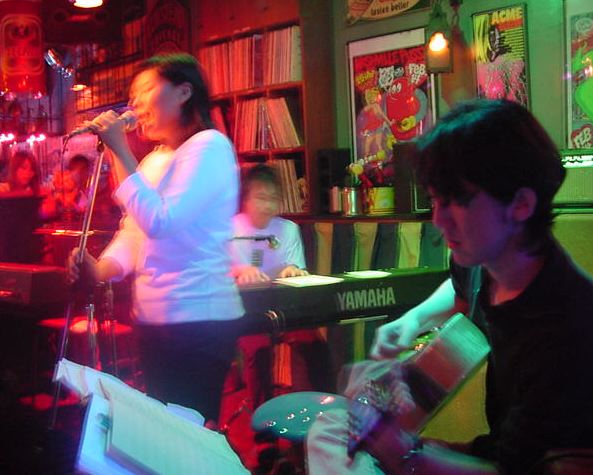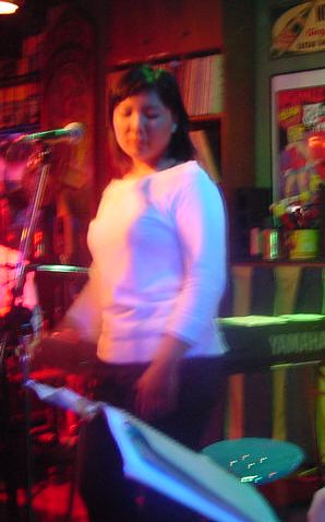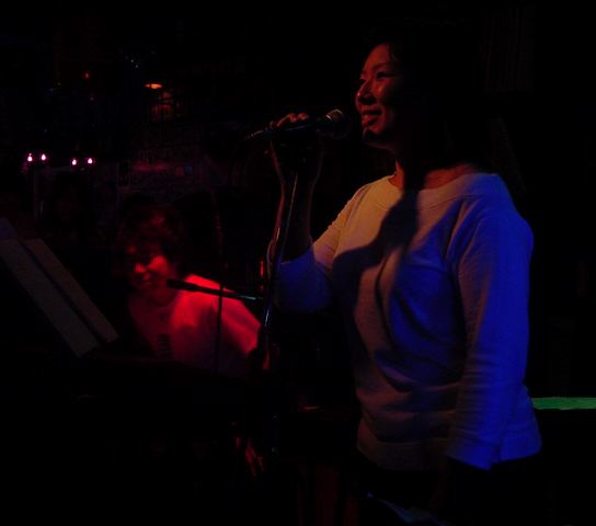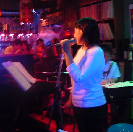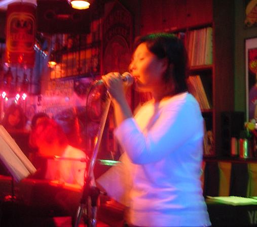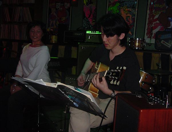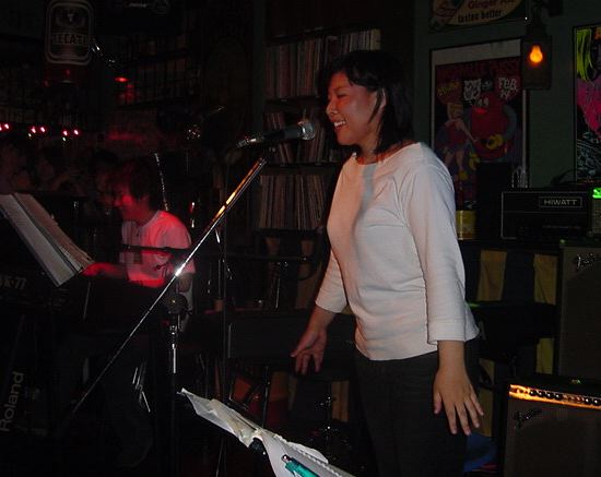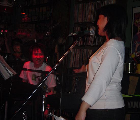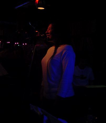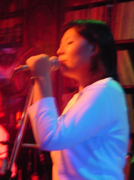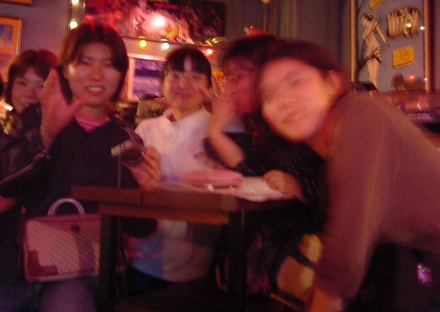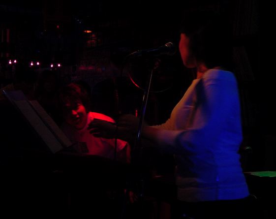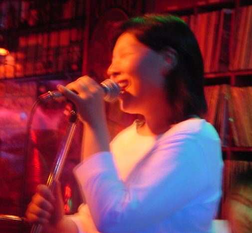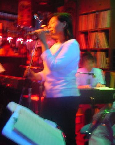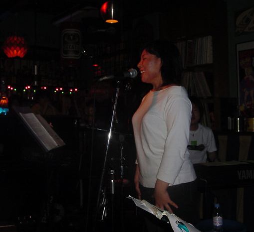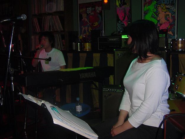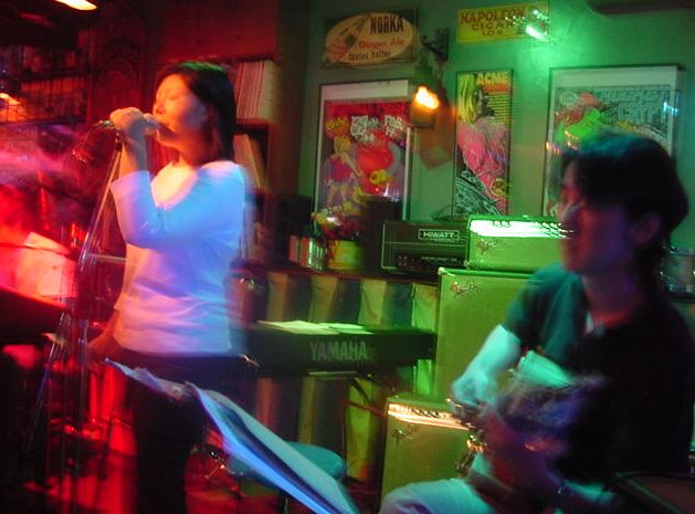 そして、いよいよ「りっきーライブ」の現場です。 心霊写真のように(^_^;)流れているのは、暗い会場で ストロボを焚かずに長時間露光したためですが、 けっこういいカンジに撮れました。 りっきーもなかなか頑張りました。(^_^)