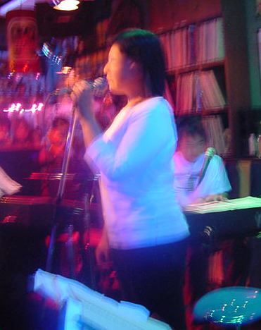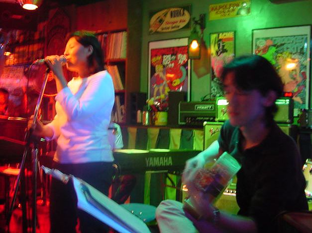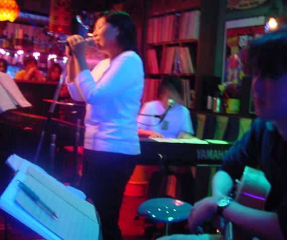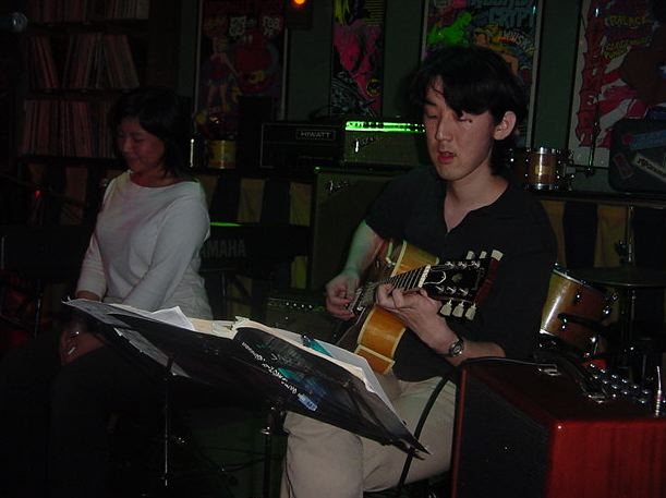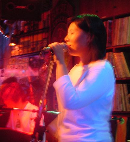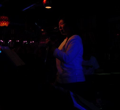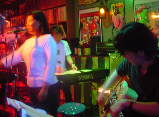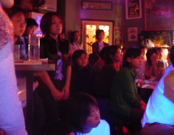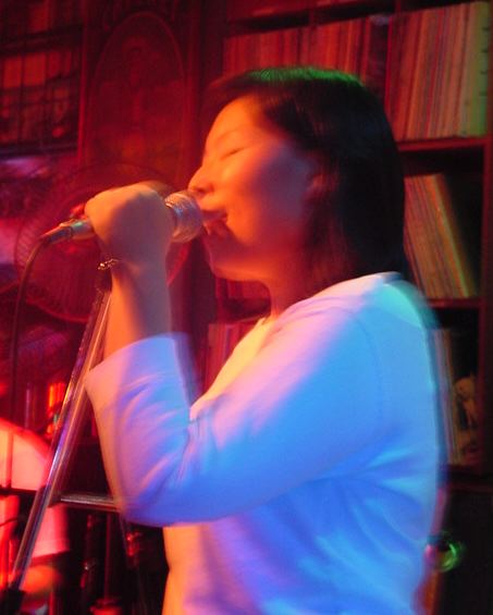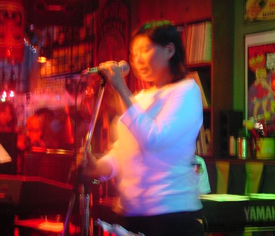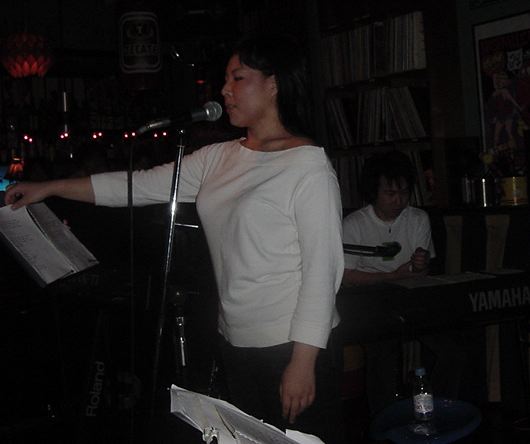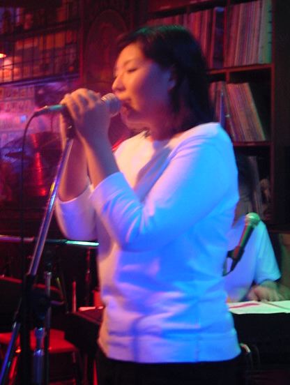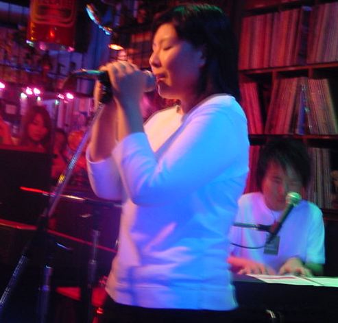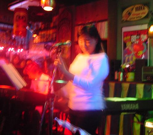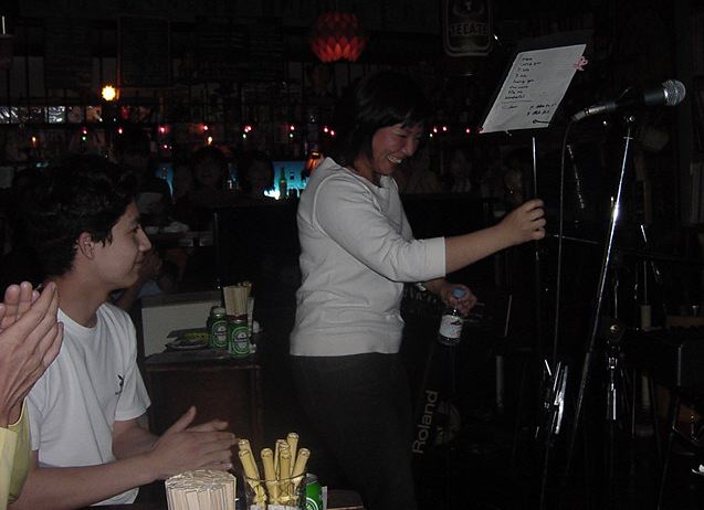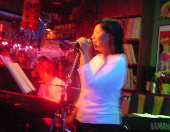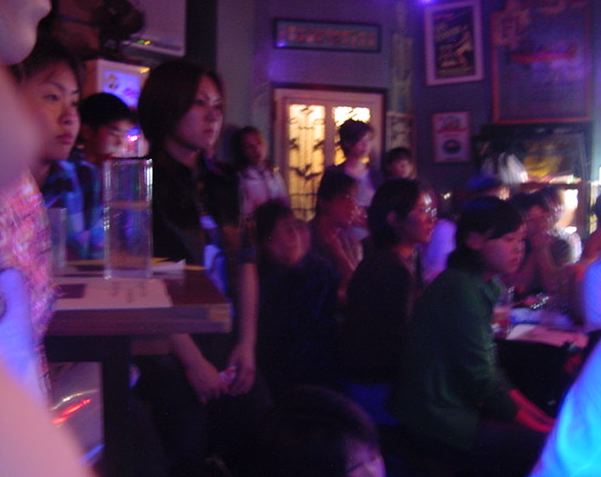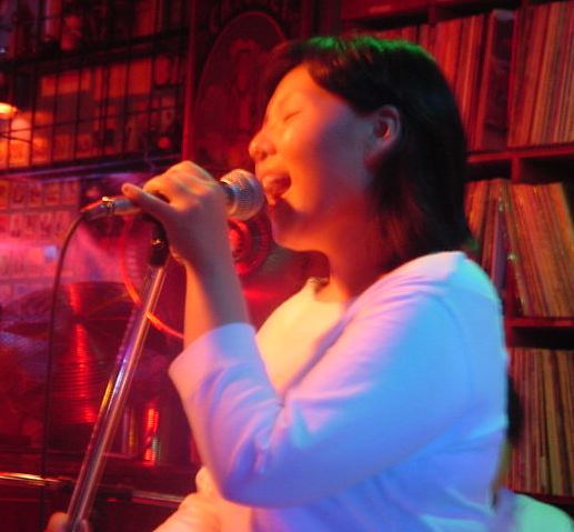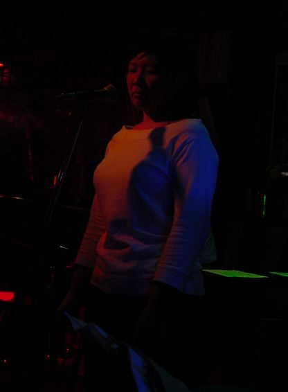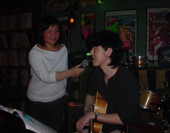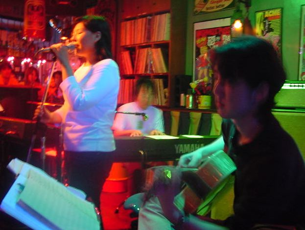 そして、いよいよ「りっきーライブ」の現場です。 心霊写真のように(^_^;)流れているのは、暗い会場で ストロボを焚かずに長時間露光したためですが、 けっこういいカンジに撮れました。 りっきーもなかなか頑張りました。(^_^)