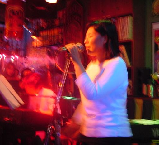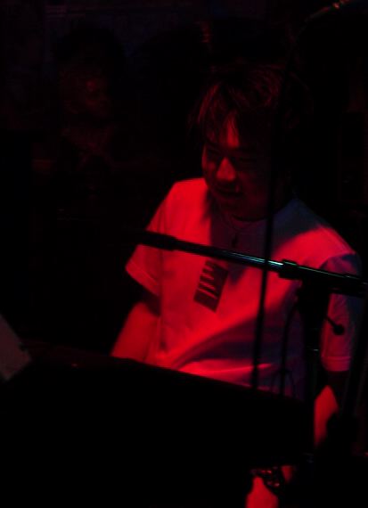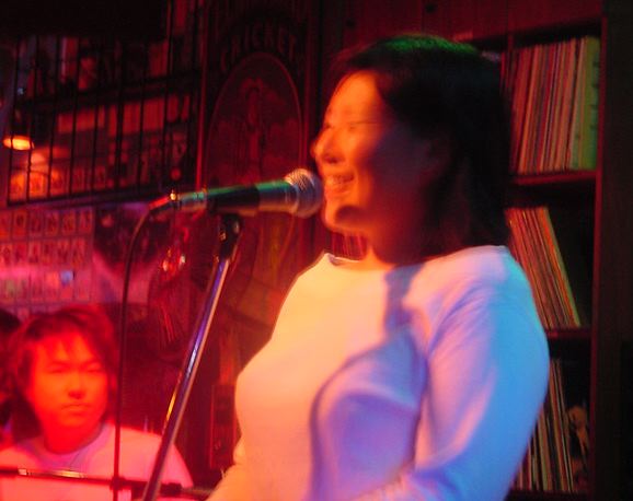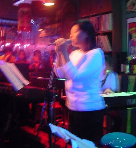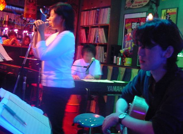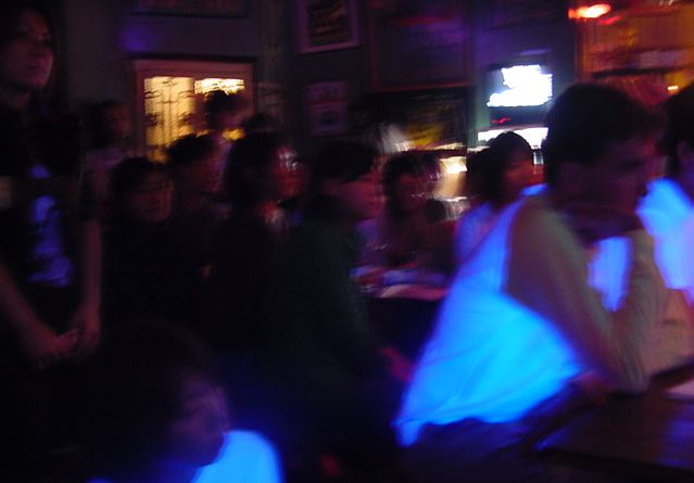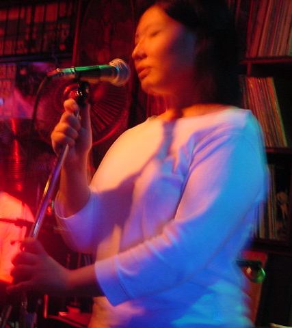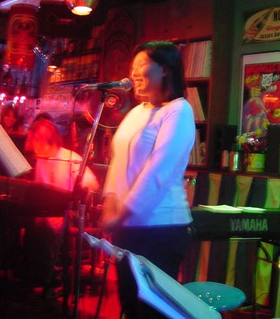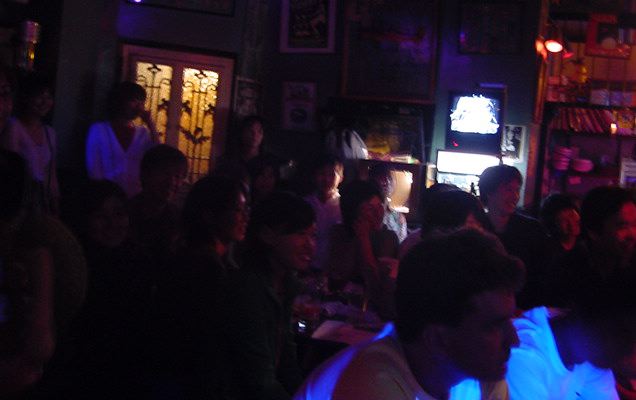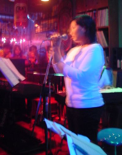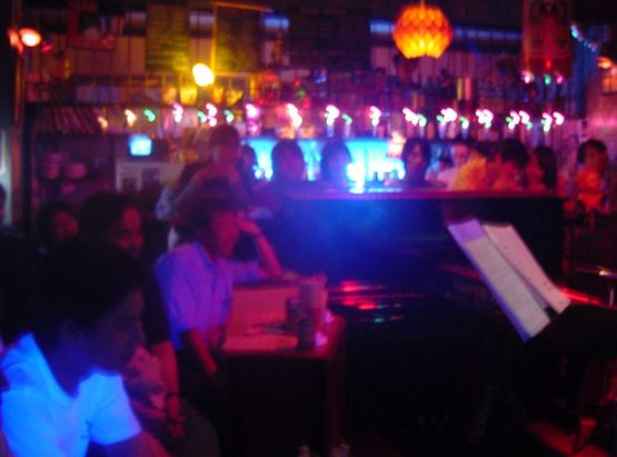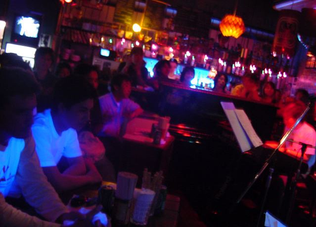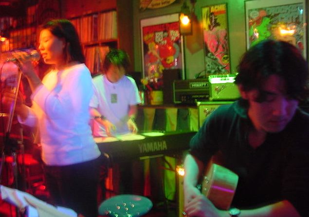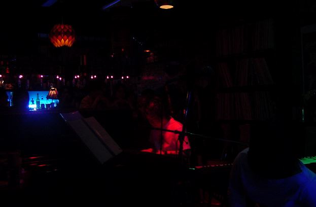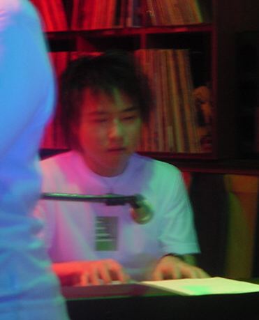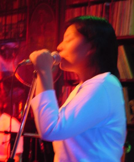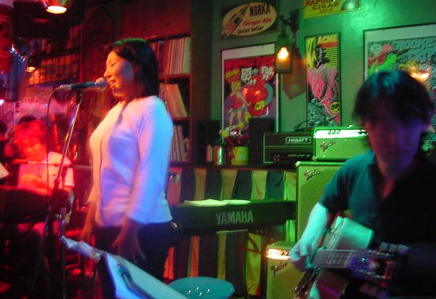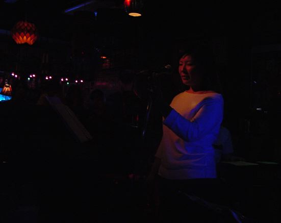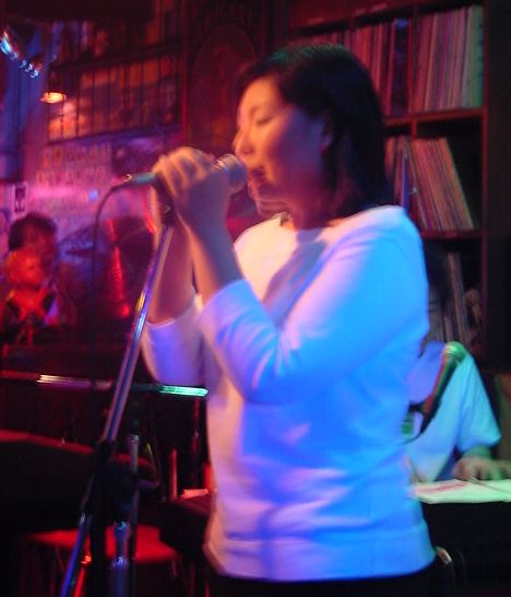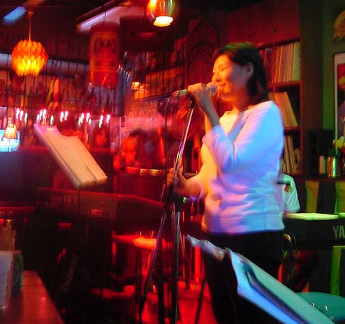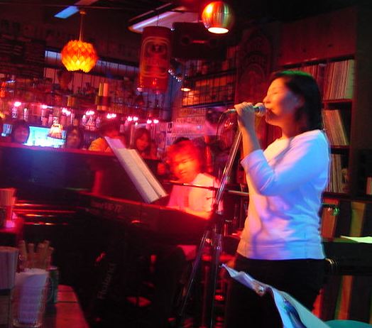 そして、いよいよ「りっきーライブ」の現場です。 心霊写真のように(^_^;)流れているのは、暗い会場で ストロボを焚かずに長時間露光したためですが、 けっこういいカンジに撮れました。 りっきーもなかなか頑張りました。(^_^)
