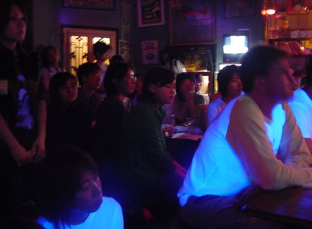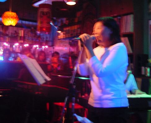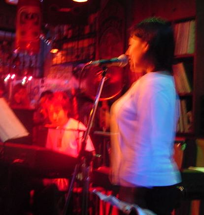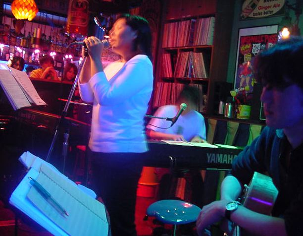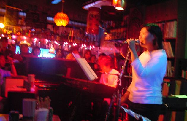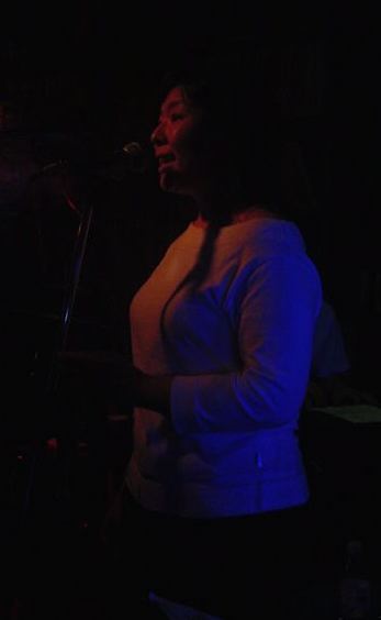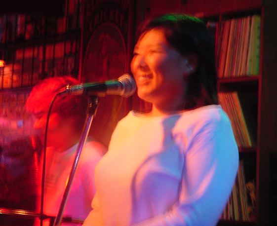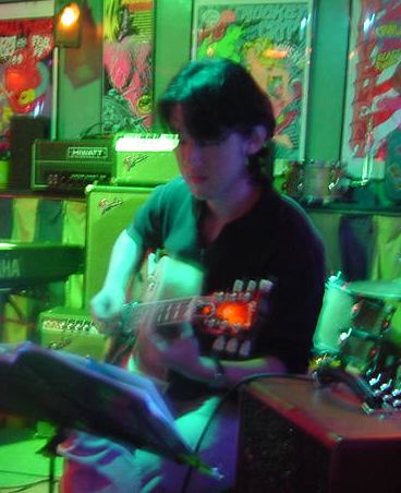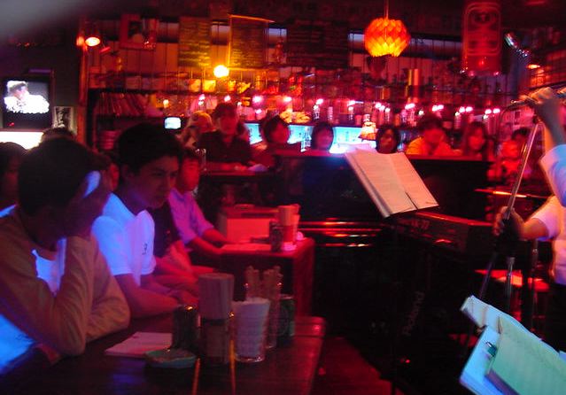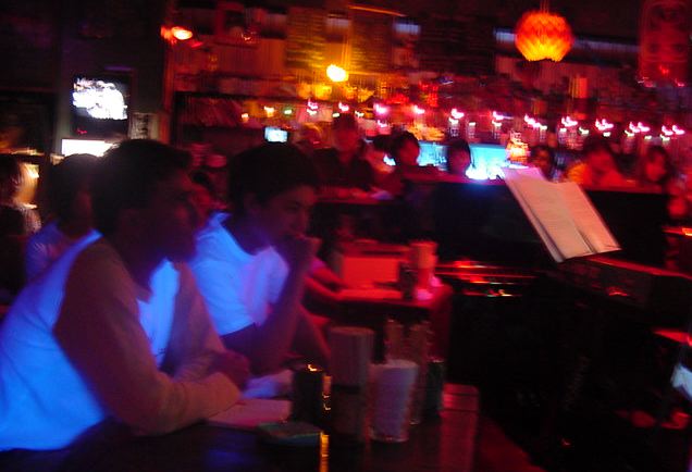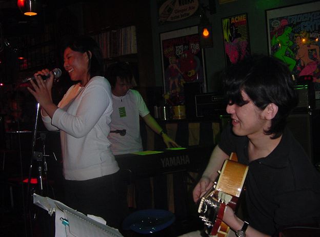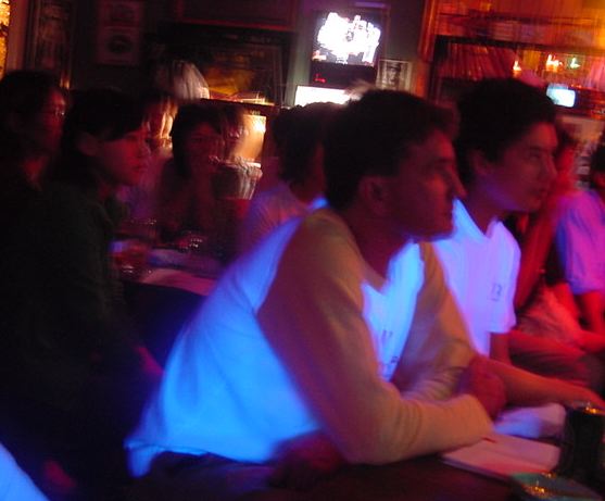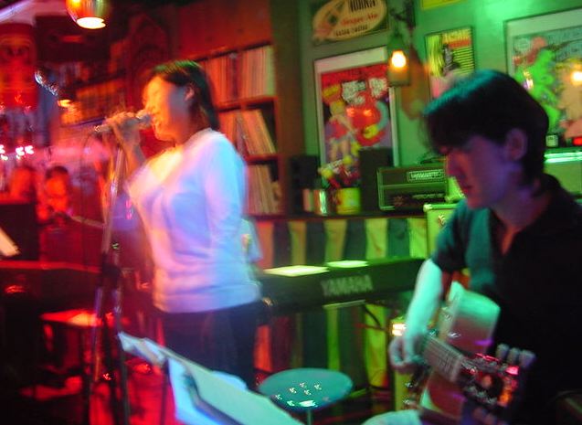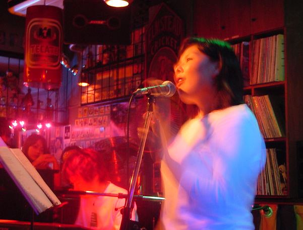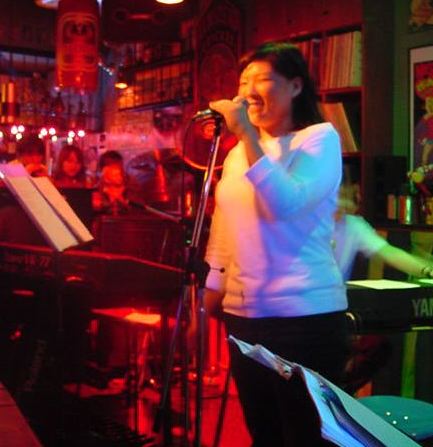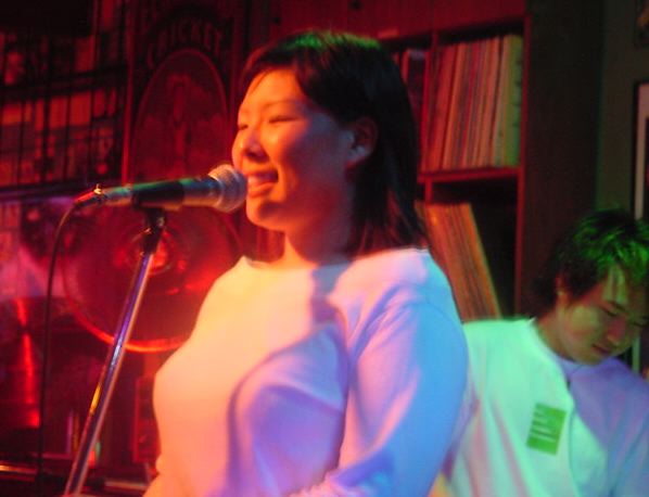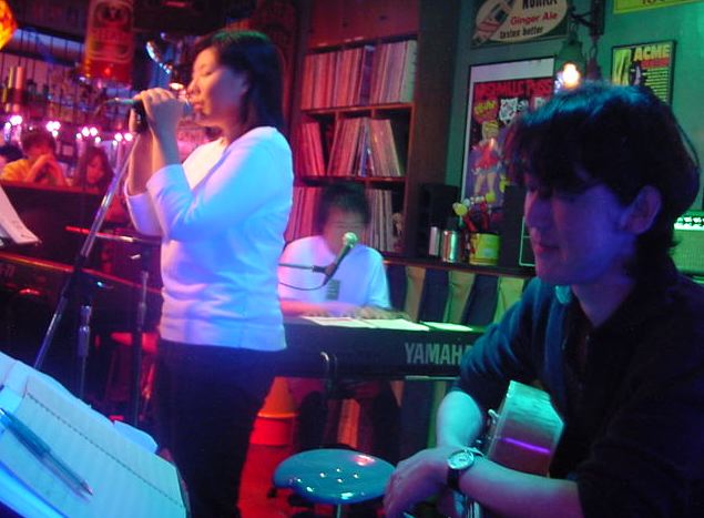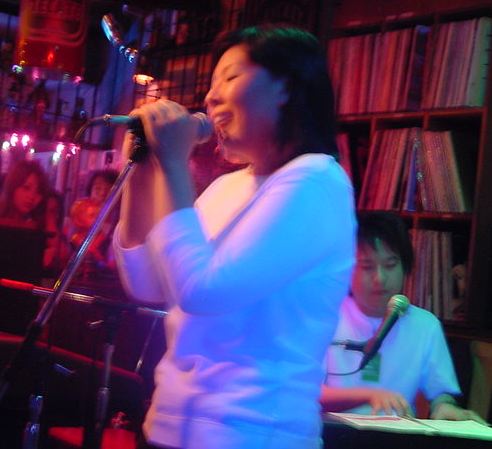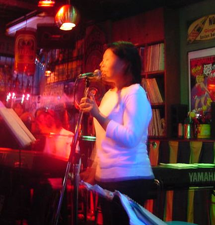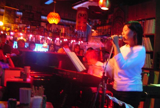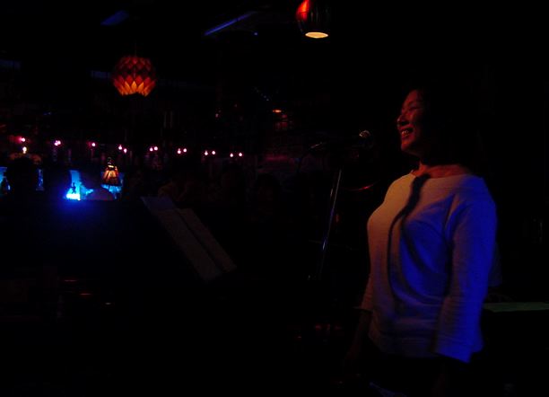 そして、いよいよ「りっきーライブ」の現場です。 心霊写真のように(^_^;)流れているのは、暗い会場で ストロボを焚かずに長時間露光したためですが、 けっこういいカンジに撮れました。 りっきーもなかなか頑張りました。(^_^)