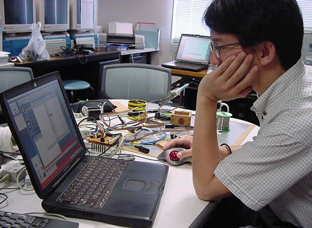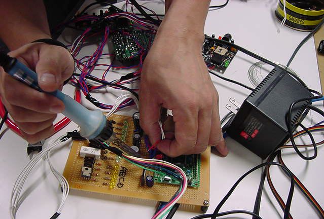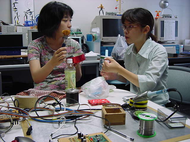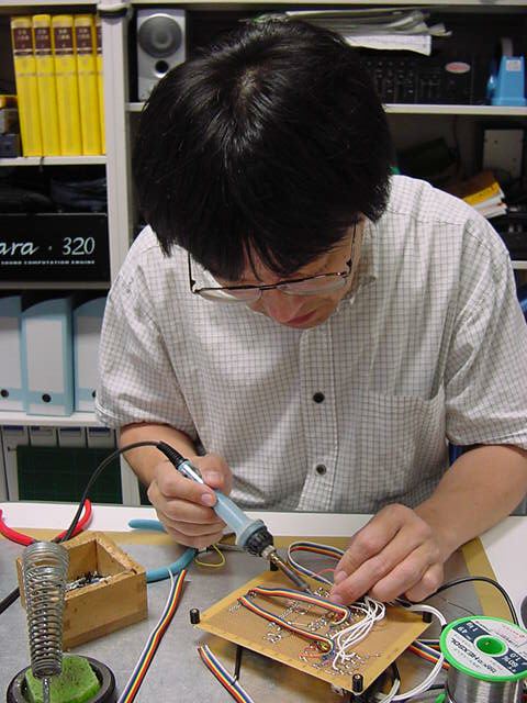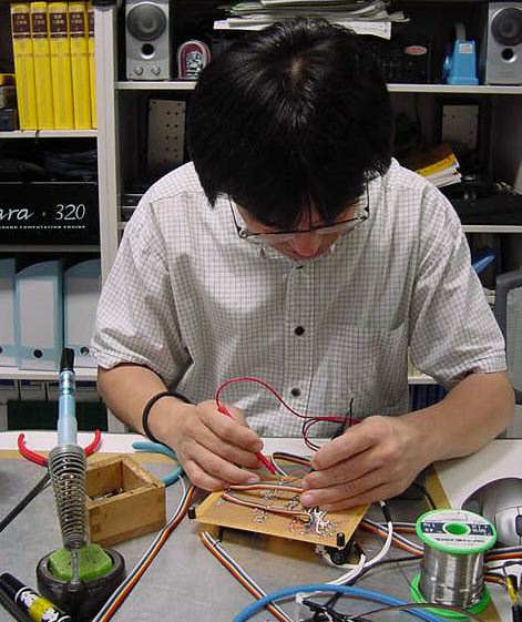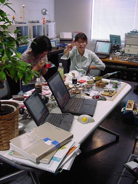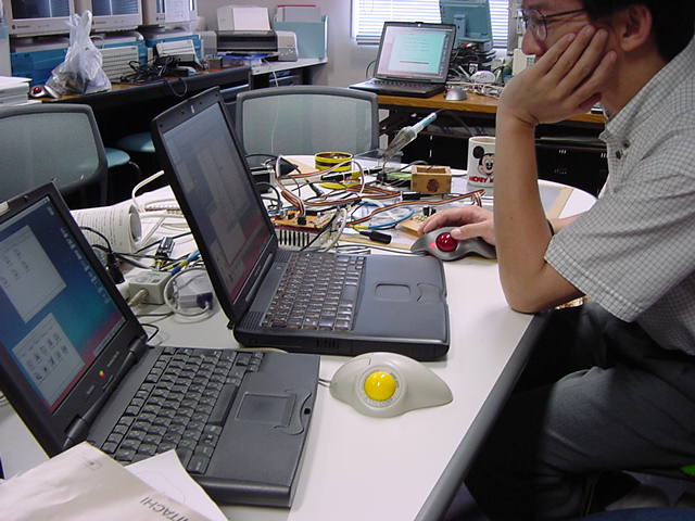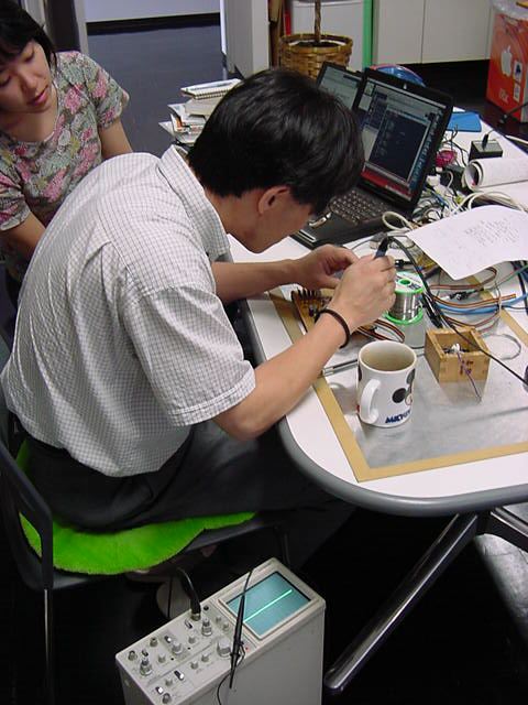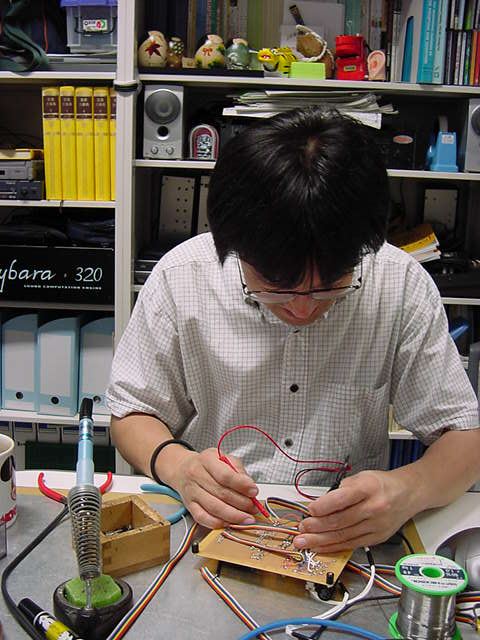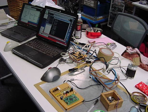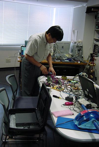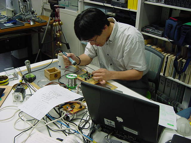 2002年7月18日 SUAC1106研究室の風景 長嶋洋一 メディアアートフェスティバル2002(MAF2002)に出展する「Gun★Min」のインスタレーション作品のための、AKI-H8ステッピングモータ制御マシンを 制作しているところを、古虎の川崎真澄さんに激写してもらいました。 いつもは自分が一人で孤独に制作しているので、作業中の自分の写真は撮れず、制作したブツの写真ばかりでした。 僕が実際に制作している風景というのは初めてかもしれません。(^_^)