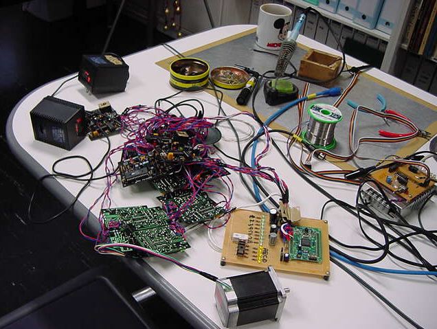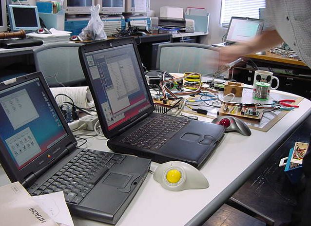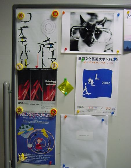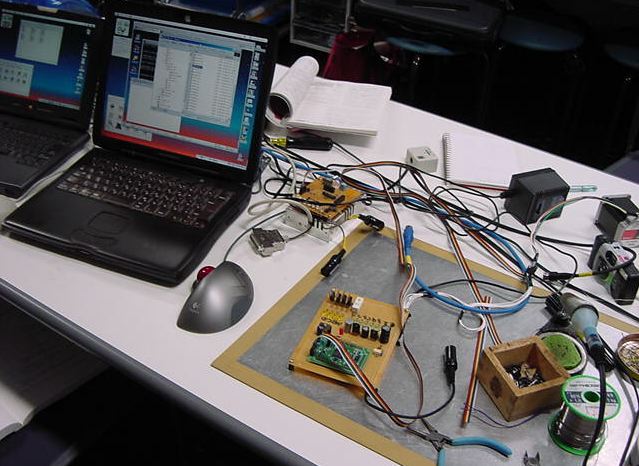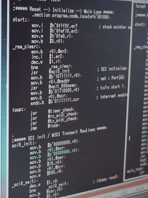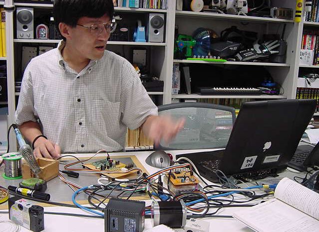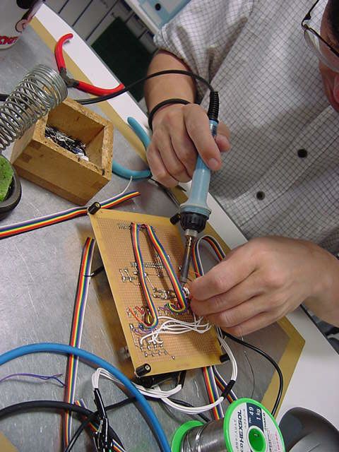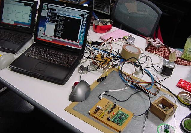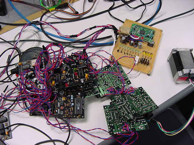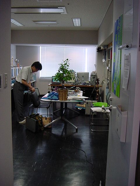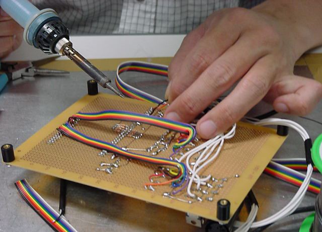 2002年7月18日 SUAC1106研究室の風景 長嶋洋一 メディアアートフェスティバル2002(MAF2002)に出展する「Gun★Min」のインスタレーション作品のための、AKI-H8ステッピングモータ制御マシンを 制作しているところを、古虎の川崎真澄さんに激写してもらいました。 いつもは自分が一人で孤独に制作しているので、作業中の自分の写真は撮れず、制作したブツの写真ばかりでした。 僕が実際に制作している風景というのは初めてかもしれません。(^_^)