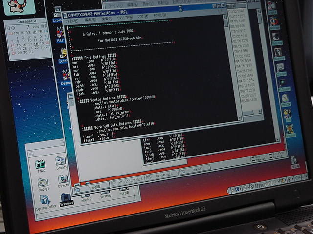 メディアアートフェスティバル2002(MAF2002)に出展する「Gun★Min」のインスタレーション作品のための、AKI-H8ステッピングモータ制御マシンを 制作しているところを、古虎の川崎真澄さんに激写してもらいました。 いつもは自分が一人で孤独に制作しているので、作業中の自分の写真は撮れず、制作したブツの写真ばかりでした。 僕が実際に制作している風景というのは初めてかもしれません。(^_^)