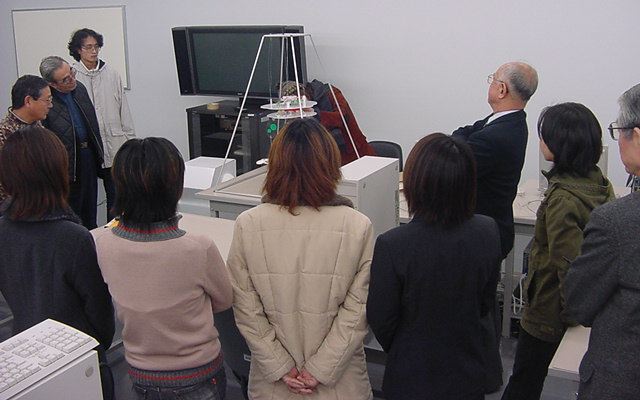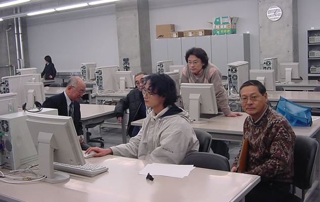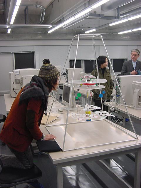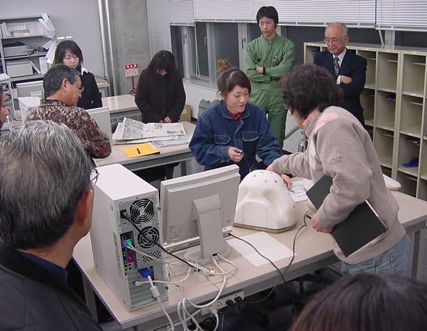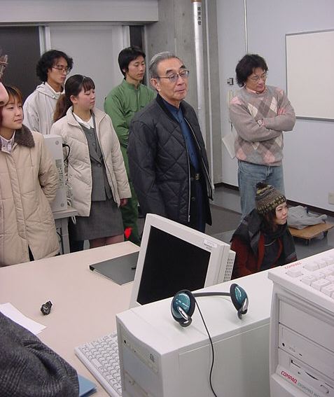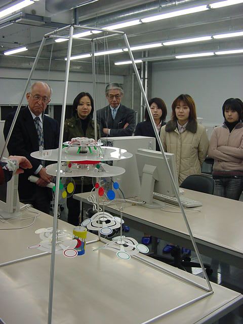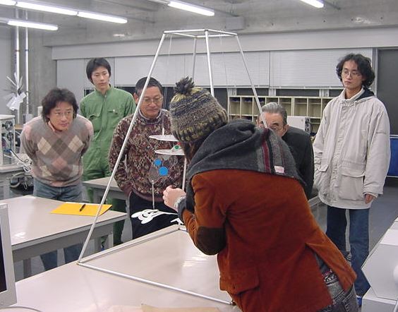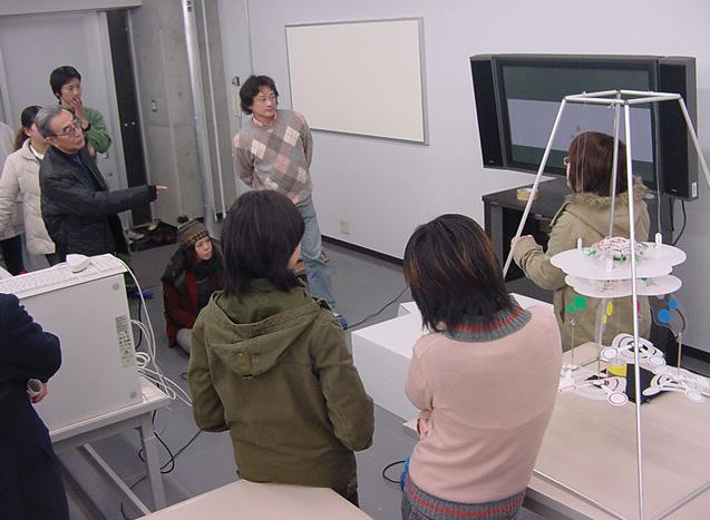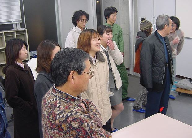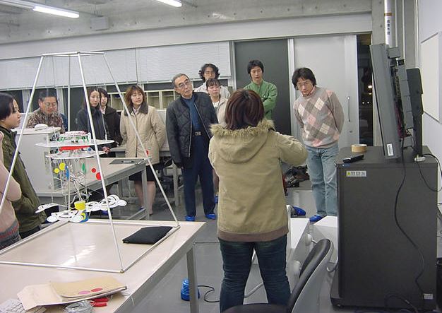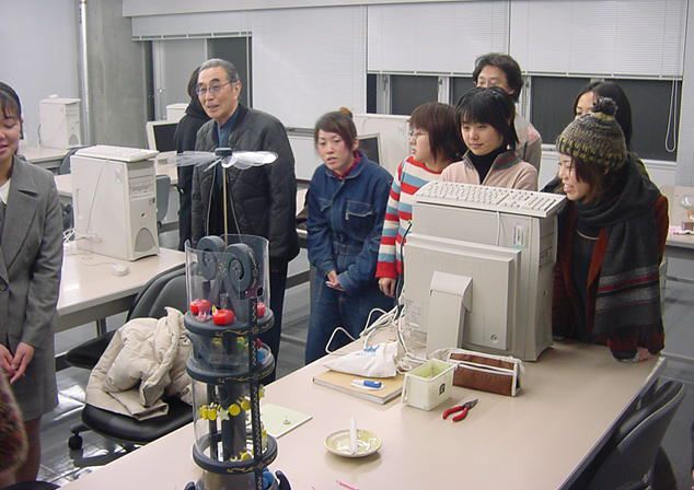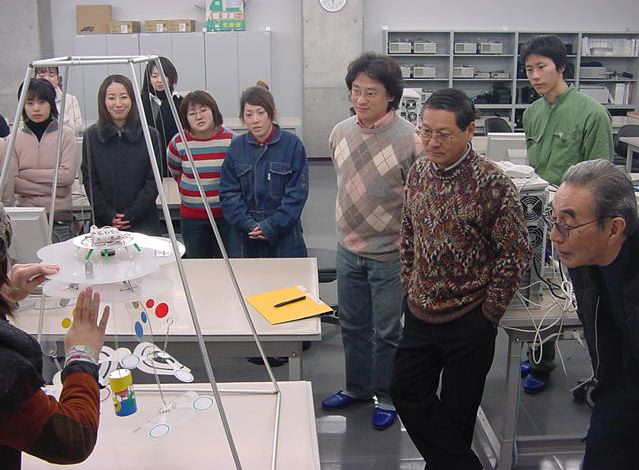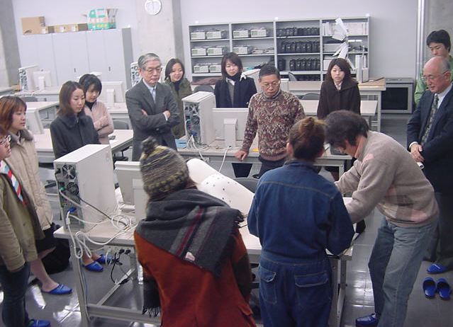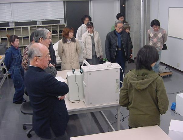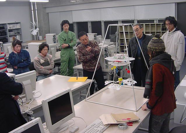 総合演習I・リベンジ合評 2003年2月 長嶋洋一 技術造形学科3回生後期の「技術造形総合演習I」の合評では 未完成だった作品(非展示)を、2月6日の17時から再度、追評価 しました。リベンジを宣言した学生数名の数日間の努力をたたえて、 その成果を参考のために記録しました。 場所は電子制御機器制作室、出張で不在の望月先生を除く 全教員が集まりました。既に合評を済ませた一部の学生も 応援に駆け付けて参加してくれました。