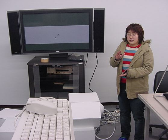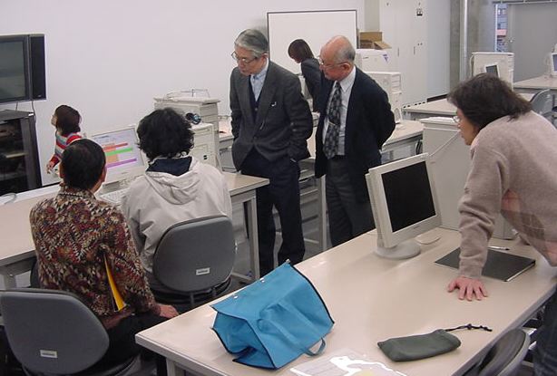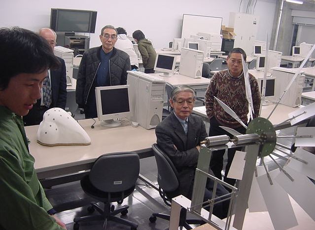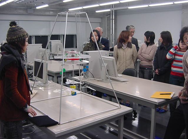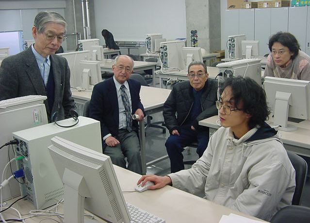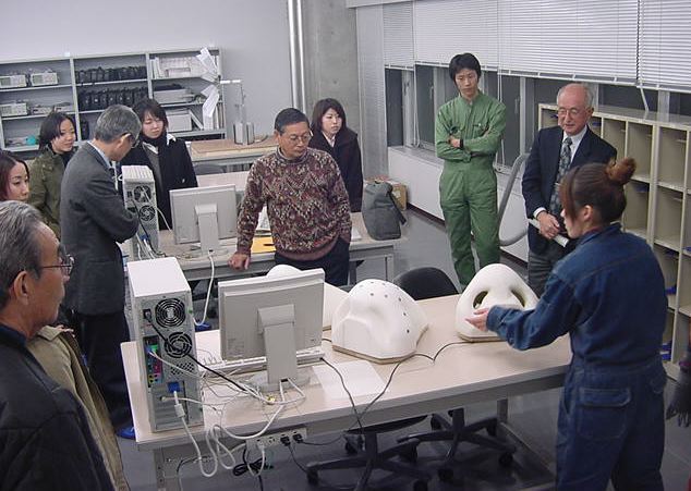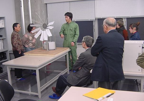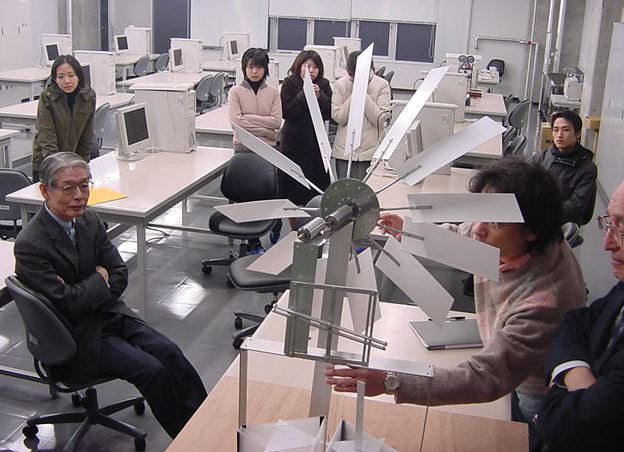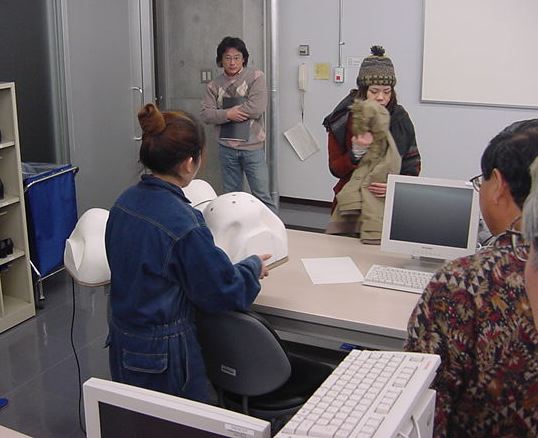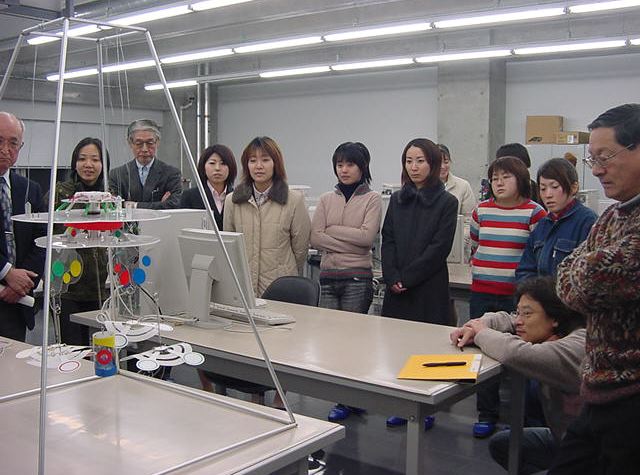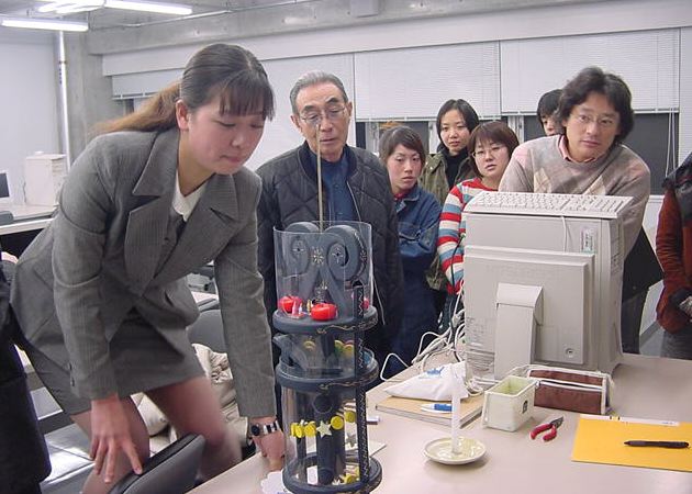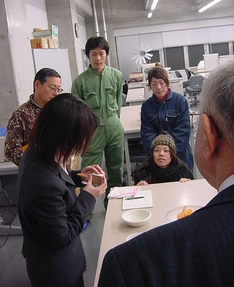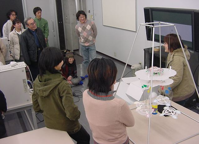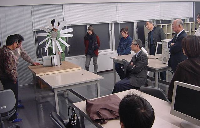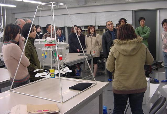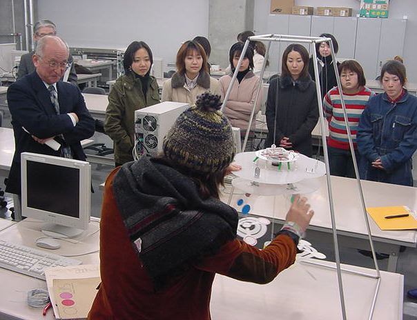 総合演習I・リベンジ合評 2003年2月 長嶋洋一 技術造形学科3回生後期の「技術造形総合演習I」の合評では 未完成だった作品(非展示)を、2月6日の17時から再度、追評価 しました。リベンジを宣言した学生数名の数日間の努力をたたえて、 その成果を参考のために記録しました。 場所は電子制御機器制作室、出張で不在の望月先生を除く 全教員が集まりました。既に合評を済ませた一部の学生も 応援に駆け付けて参加してくれました。