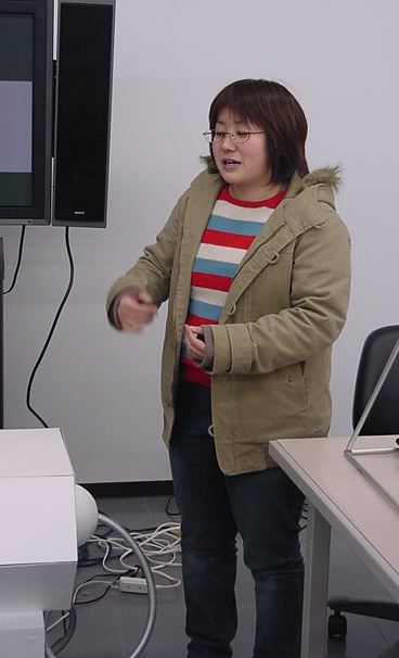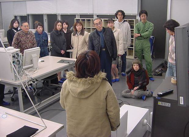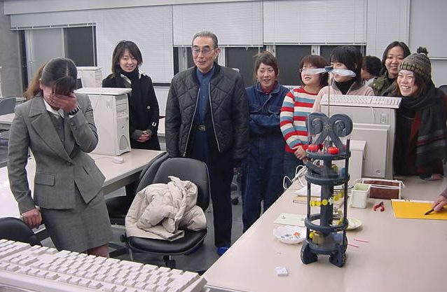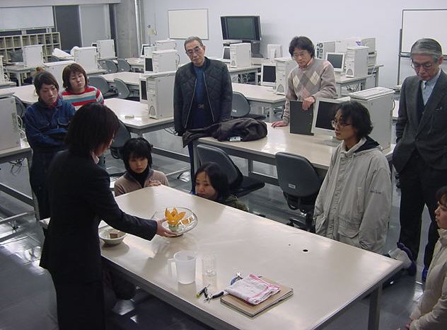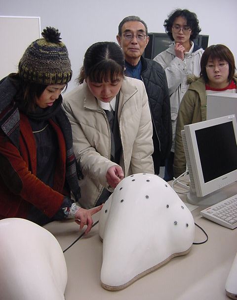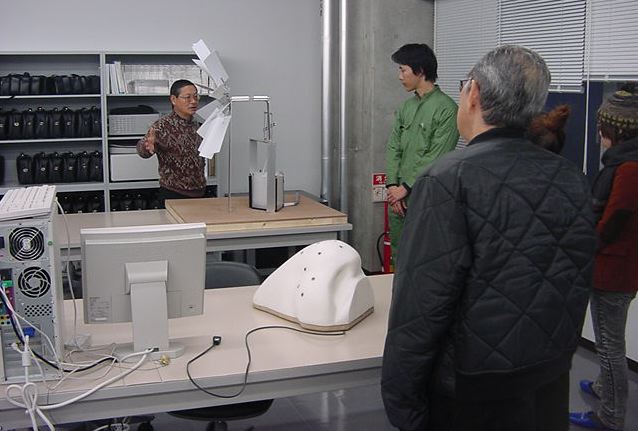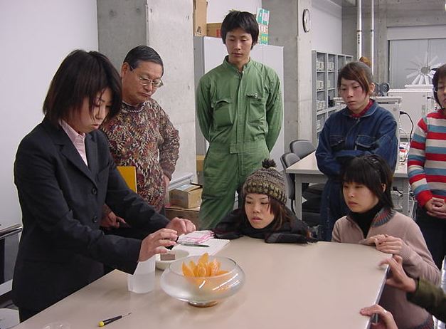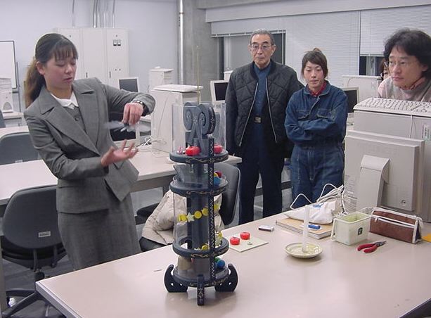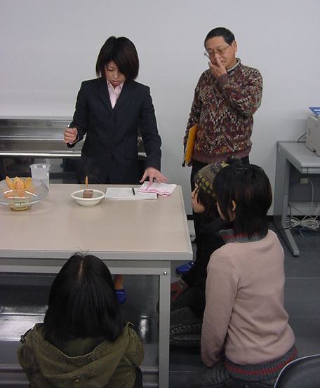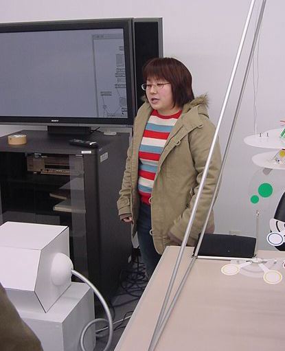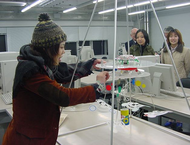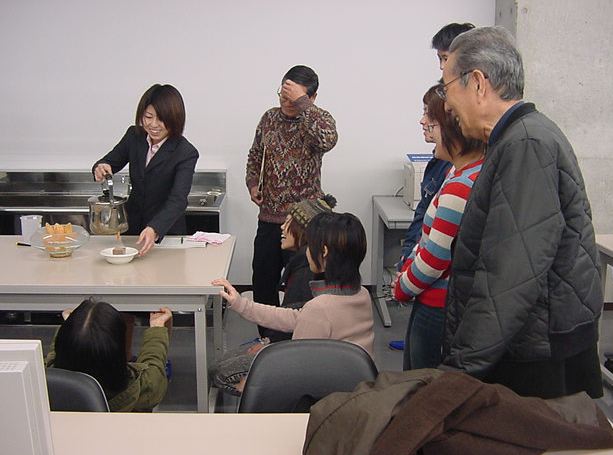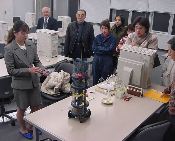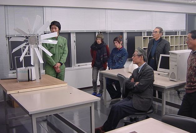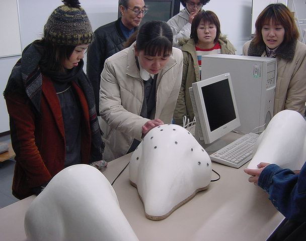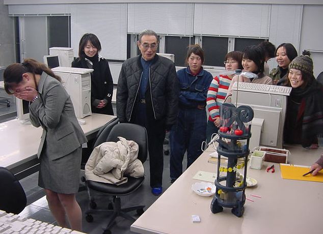 総合演習I・リベンジ合評 2003年2月 長嶋洋一 技術造形学科3回生後期の「技術造形総合演習I」の合評では 未完成だった作品(非展示)を、2月6日の17時から再度、追評価 しました。リベンジを宣言した学生数名の数日間の努力をたたえて、 その成果を参考のために記録しました。 場所は電子制御機器制作室、出張で不在の望月先生を除く 全教員が集まりました。既に合評を済ませた一部の学生も 応援に駆け付けて参加してくれました。