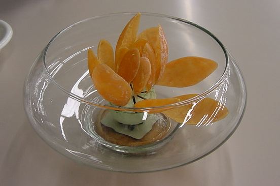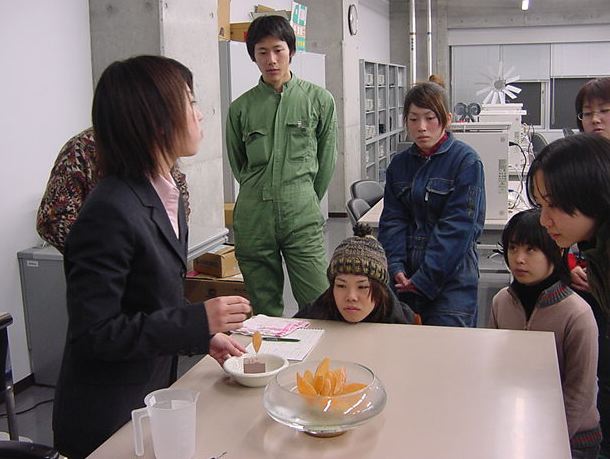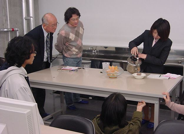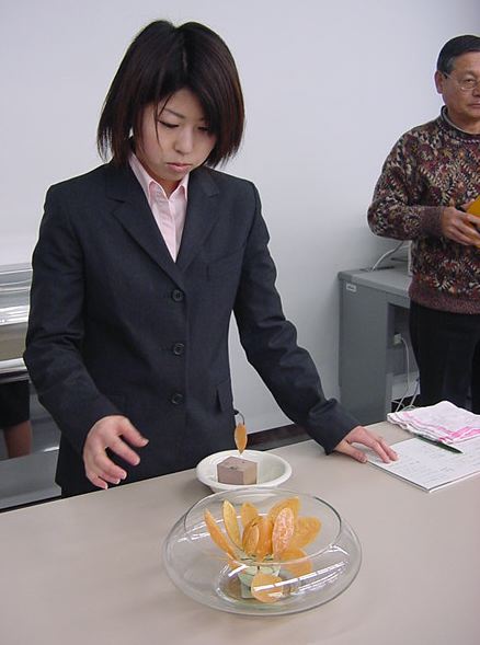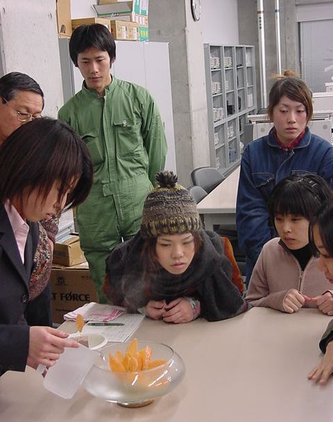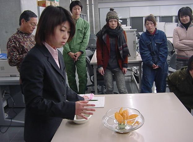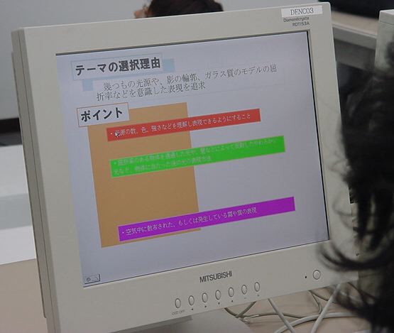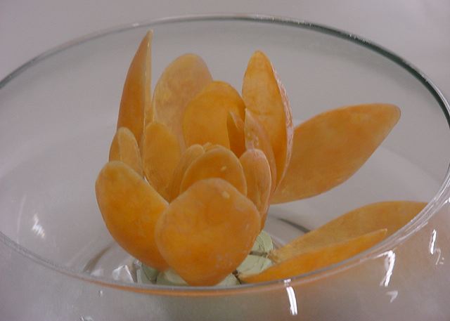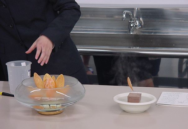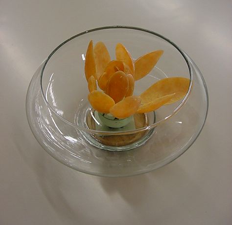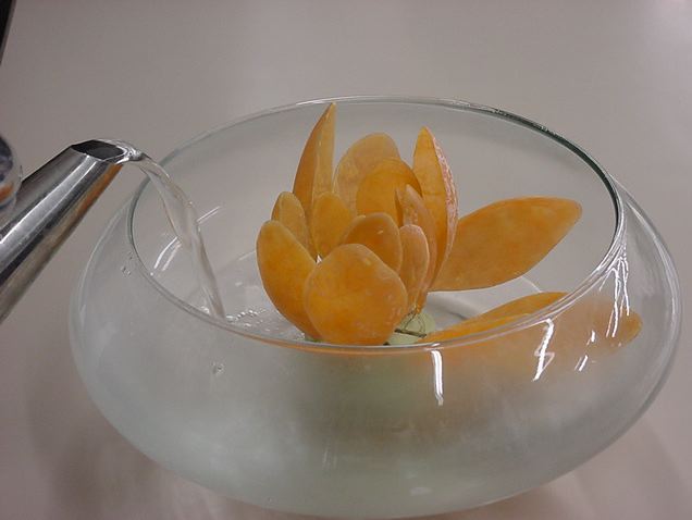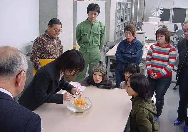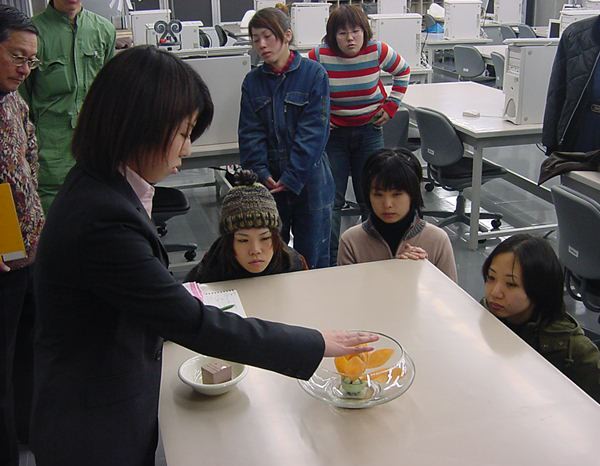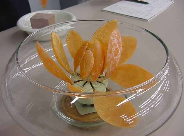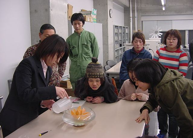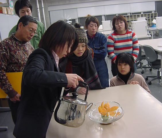 上野佳代さんは、お湯を入れると花が開く、という紅茶の一種を 造形として再現したい、という挑戦でした。形状記憶合金の ばねを使って、和紙と樹脂を重ねて作った花びらを動かそうと したのですが、なかなか思うようにいかず、これも予備的な実験 や制作スケジュールの課題を残しました。