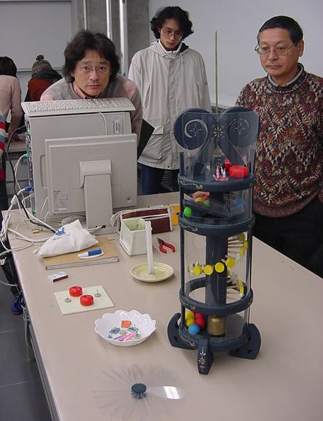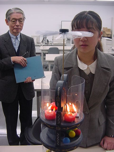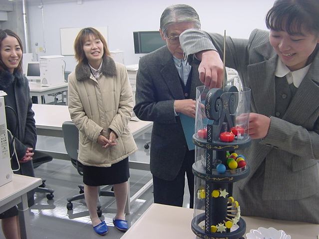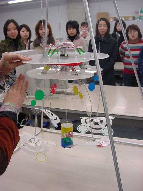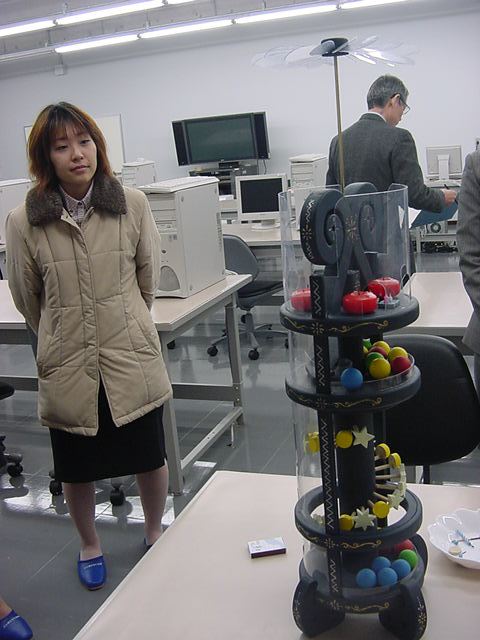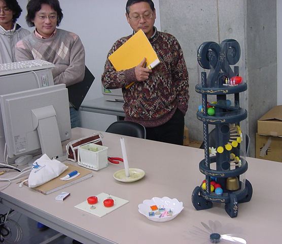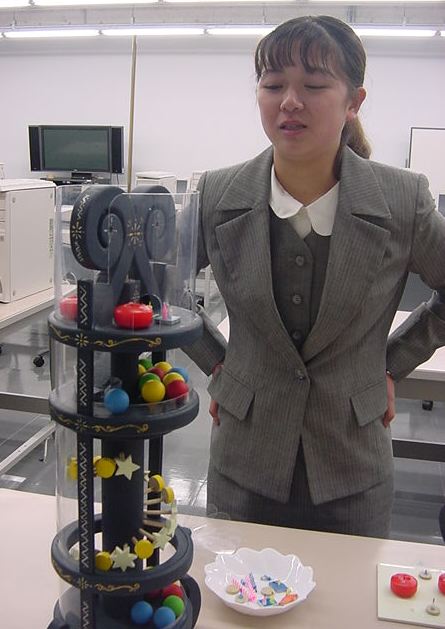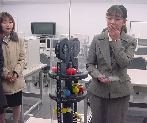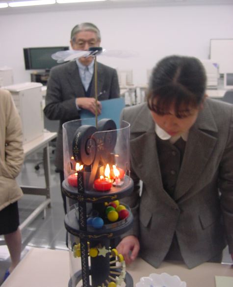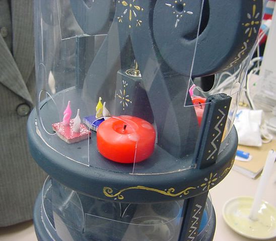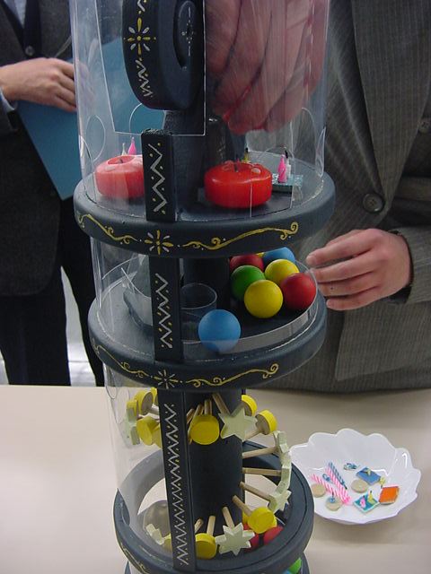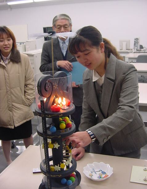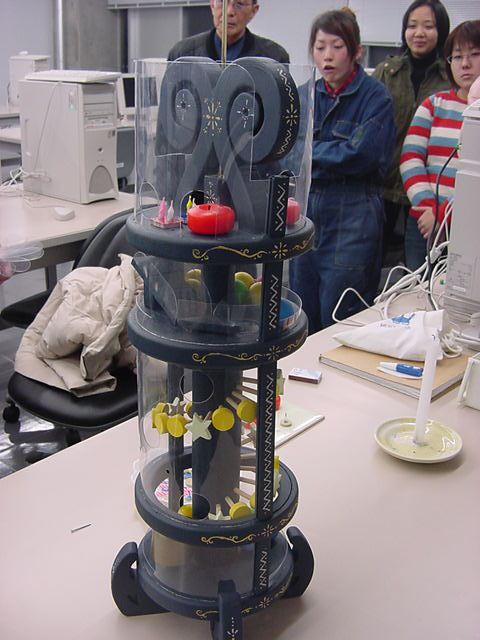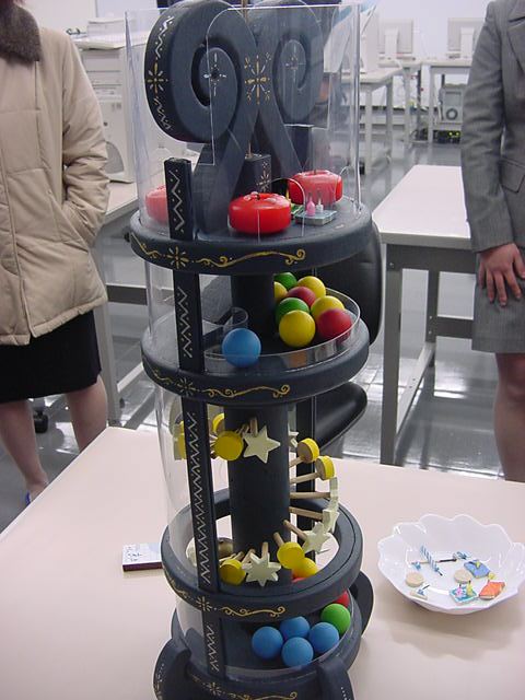 坂田久美子さんは、「蝋燭を灯してプロペラを回し、その動力で ボールのゲートが開いてボールが階段を鳴らしながら落ちてくる」 という可愛い造形に挑戦しました。まずは写真を見て、さらに 翌日に撮影したムービーを見て下さい。坂田さんの涙は別に 教員がイジメたのではなくて(^_^;)、無事にうまく落ちてくれて の感涙です。なお、このビデオ撮影をもってプラスチックの プロペラは壊れて(溶けて曲って)しまいました。