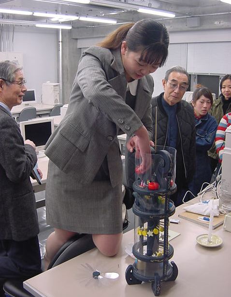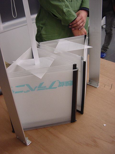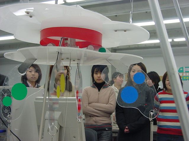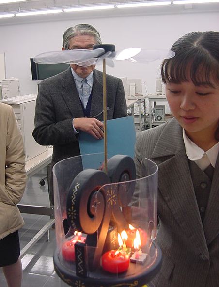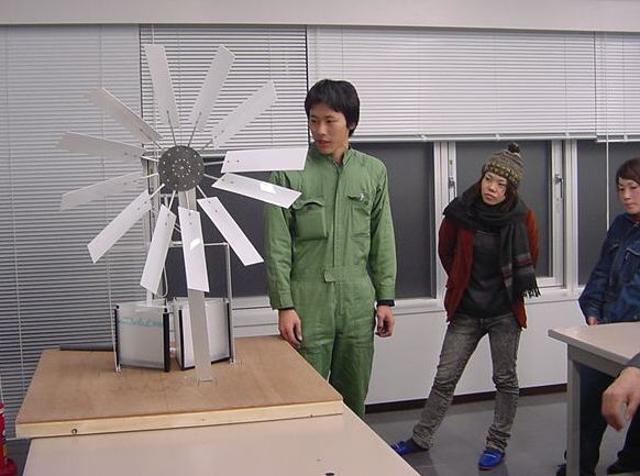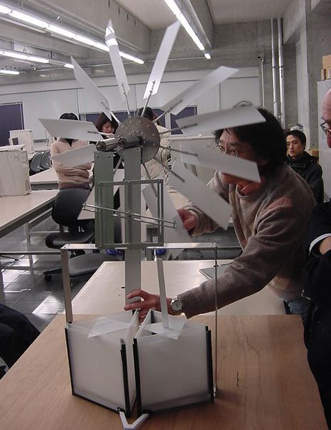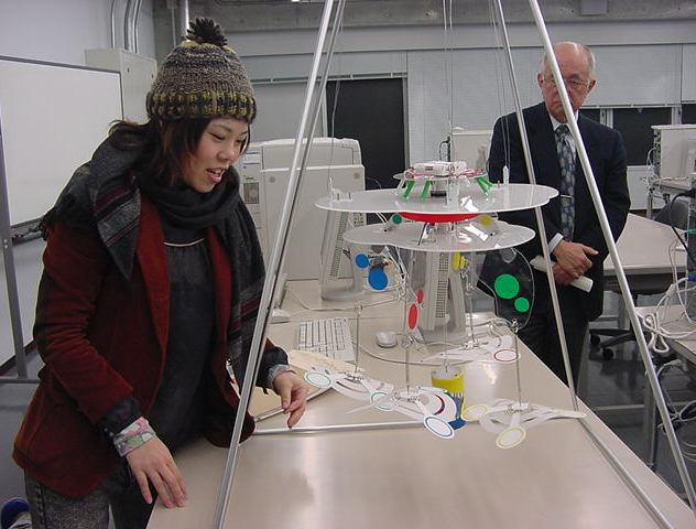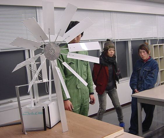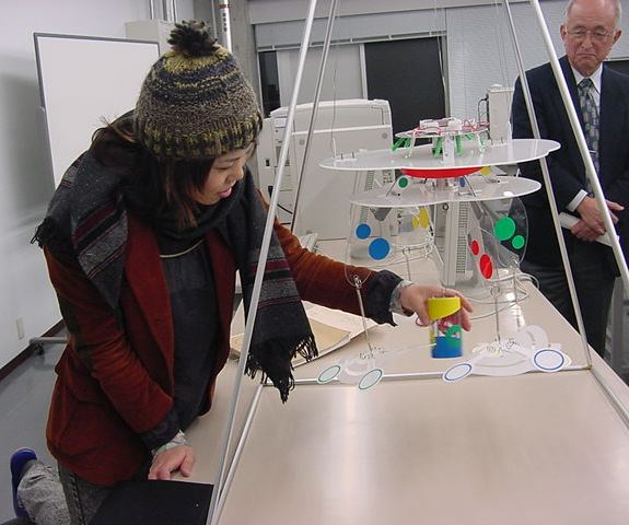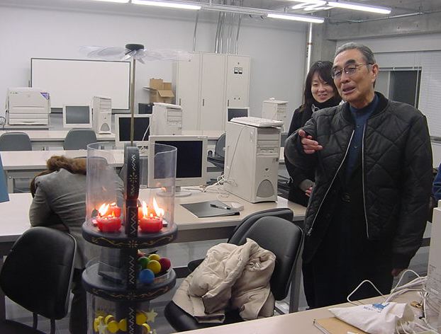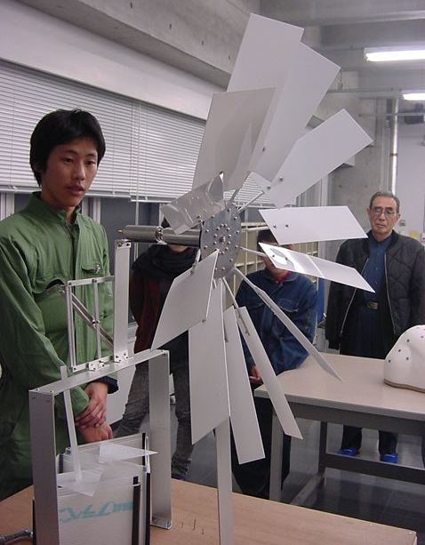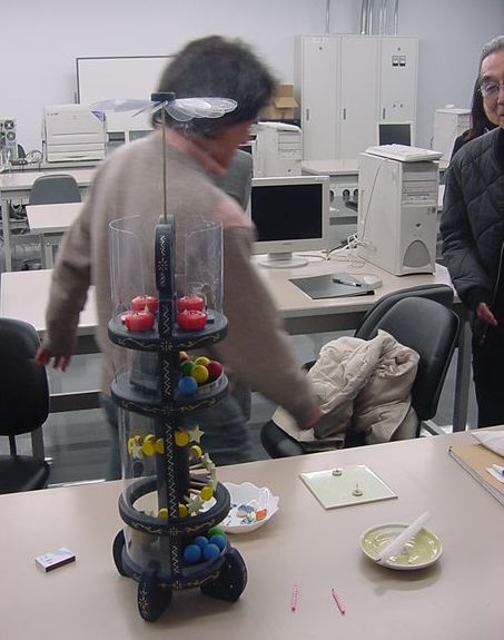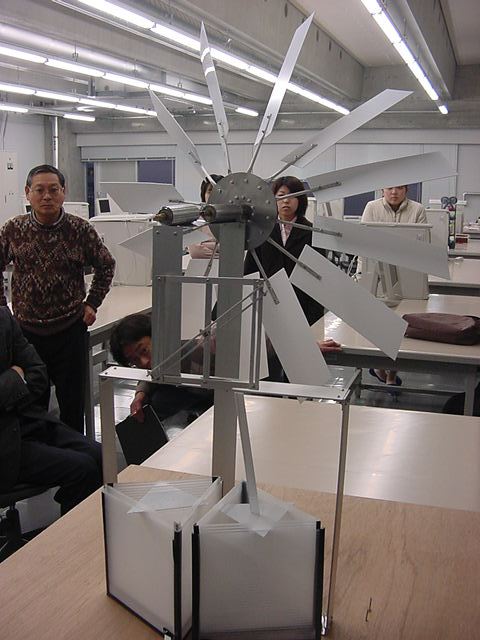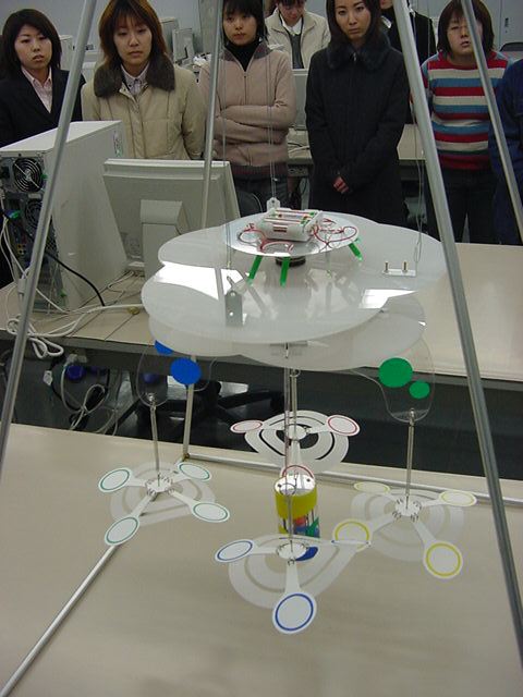 坂田久美子さんは、「蝋燭を灯してプロペラを回し、その動力で ボールのゲートが開いてボールが階段を鳴らしながら落ちてくる」 という可愛い造形に挑戦しました。まずは写真を見て、さらに 翌日に撮影したムービーを見て下さい。坂田さんの涙は別に 教員がイジメたのではなくて(^_^;)、無事にうまく落ちてくれて の感涙です。なお、このビデオ撮影をもってプラスチックの プロペラは壊れて(溶けて曲って)しまいました。