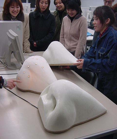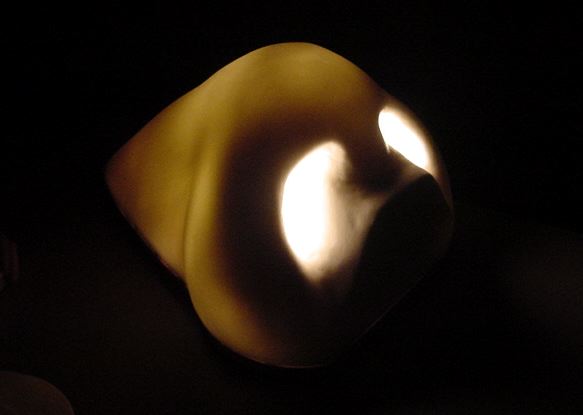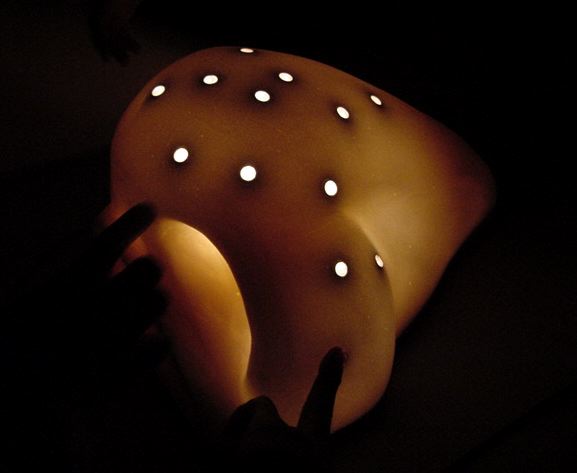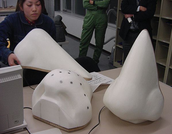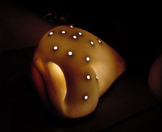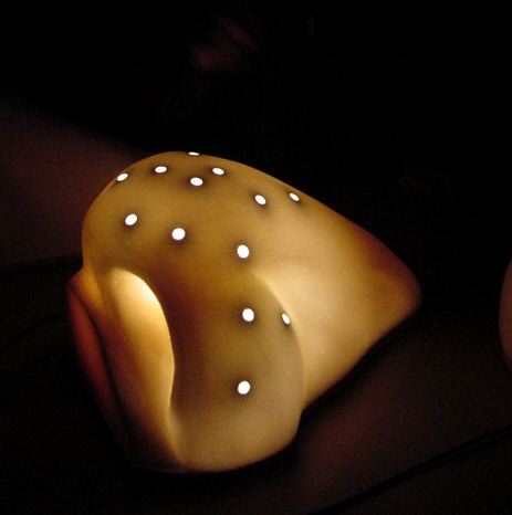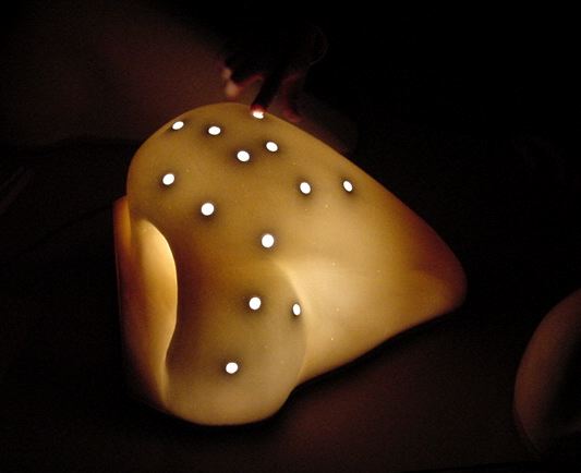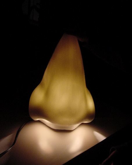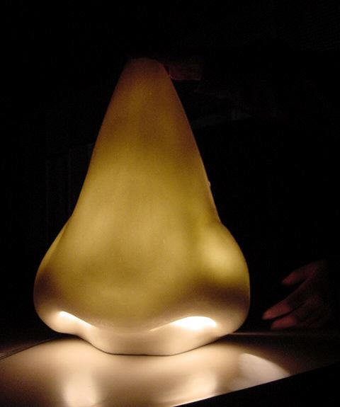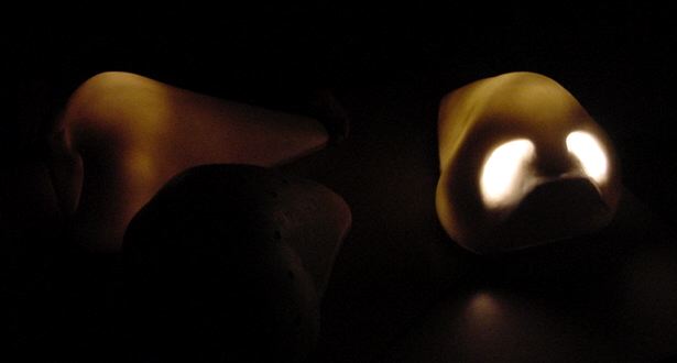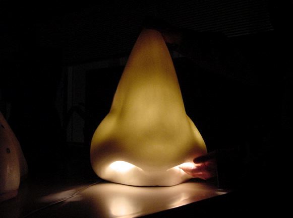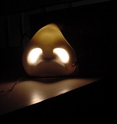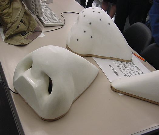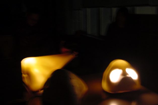 田森聖乃さんは、「鼻」の造形に取り組みました。それぞれ実在の モデルのいる巨大な「鼻」であり、内部の電球が、(1)ずっと光る、 (2)傾けるとぼーっと光りだす、(3)表面の金属に触れるとやがて 光る、という振舞いをします。これはインテリアとしてもなかなか 無気味系で楽しい造形です。