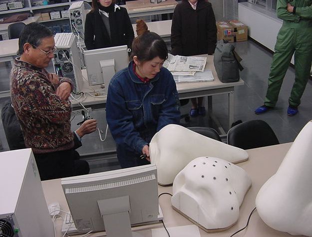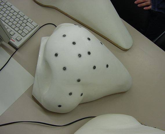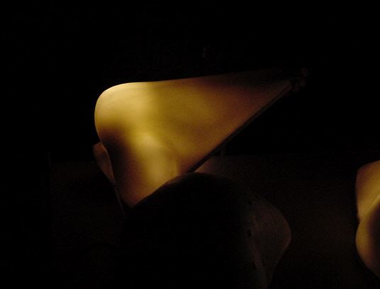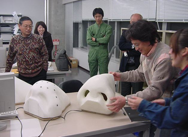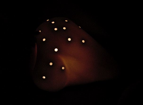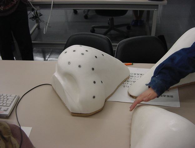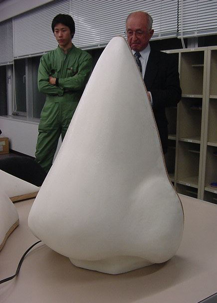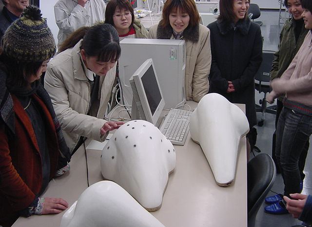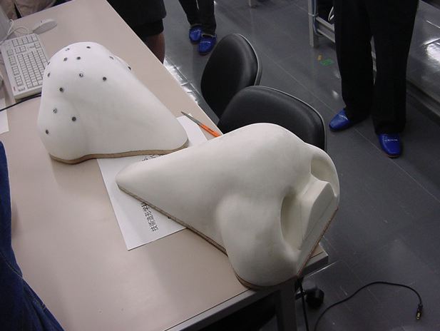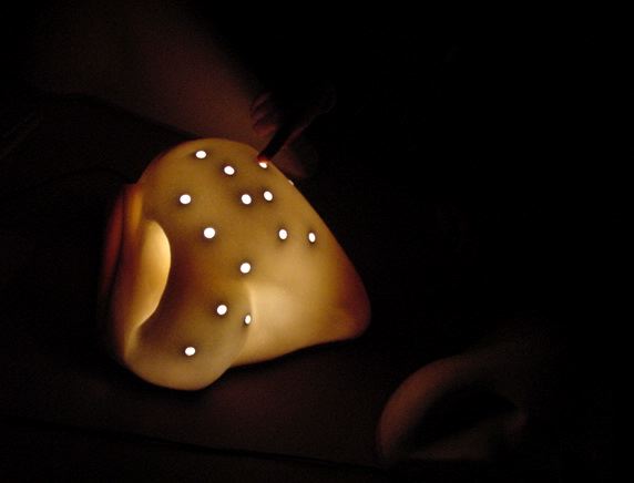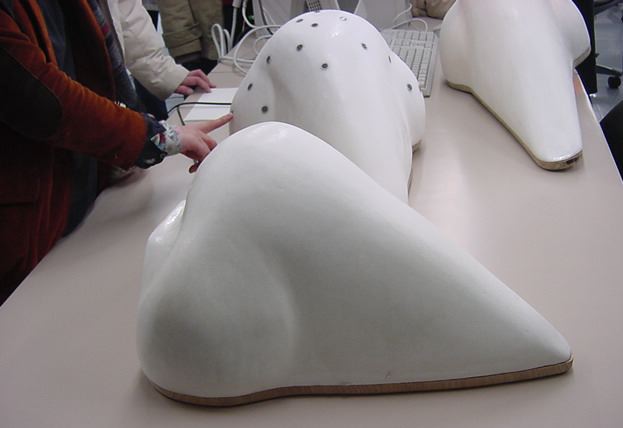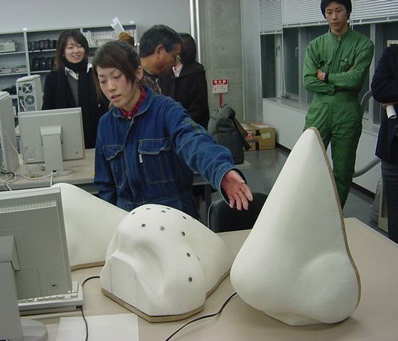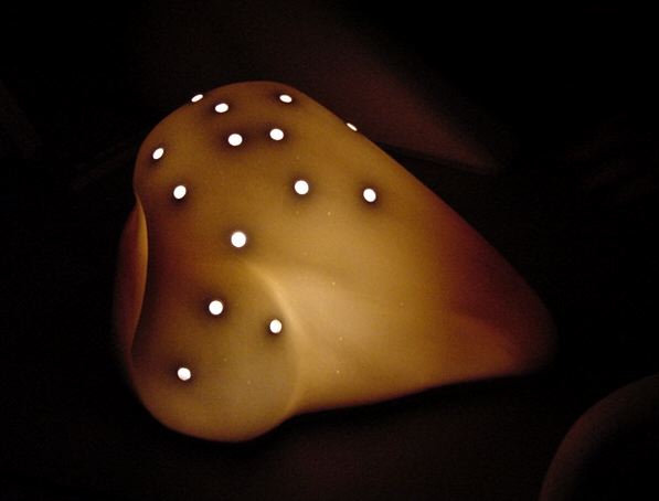 田森聖乃さんは、「鼻」の造形に取り組みました。それぞれ実在の モデルのいる巨大な「鼻」であり、内部の電球が、(1)ずっと光る、 (2)傾けるとぼーっと光りだす、(3)表面の金属に触れるとやがて 光る、という振舞いをします。これはインテリアとしてもなかなか 無気味系で楽しい造形です。