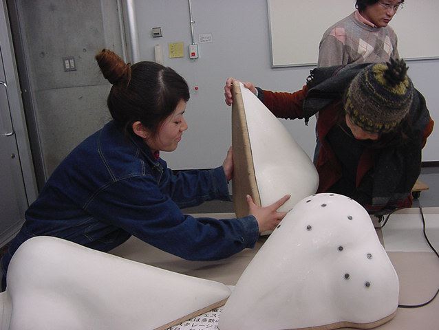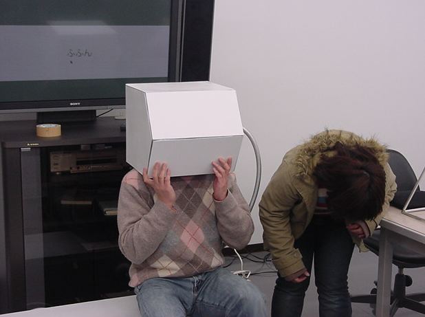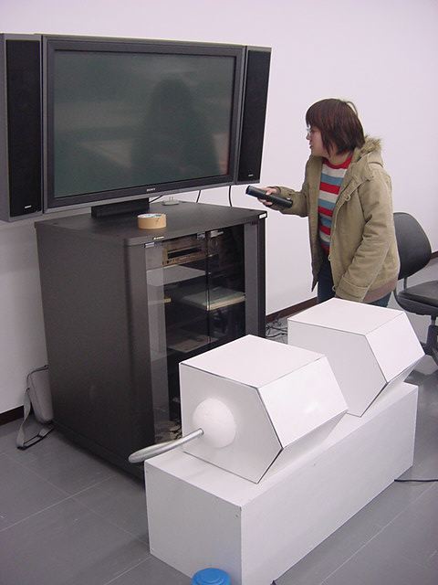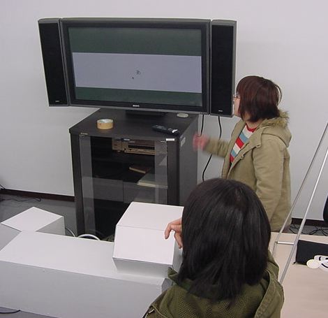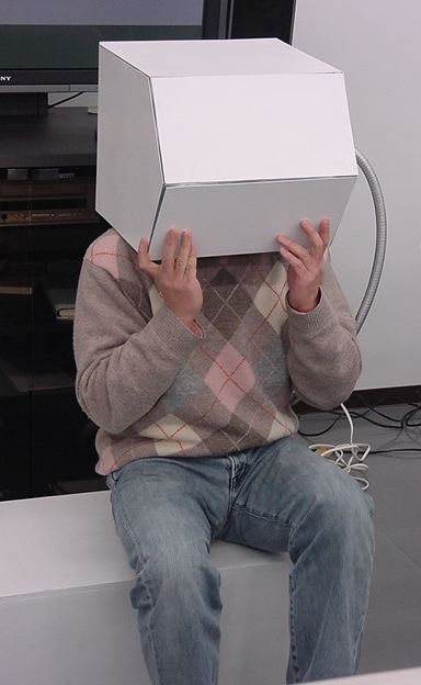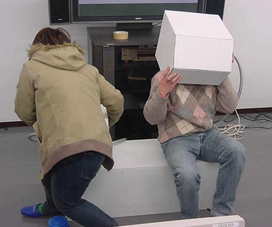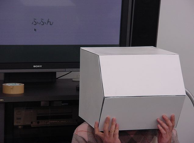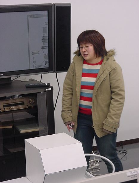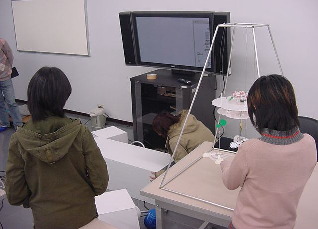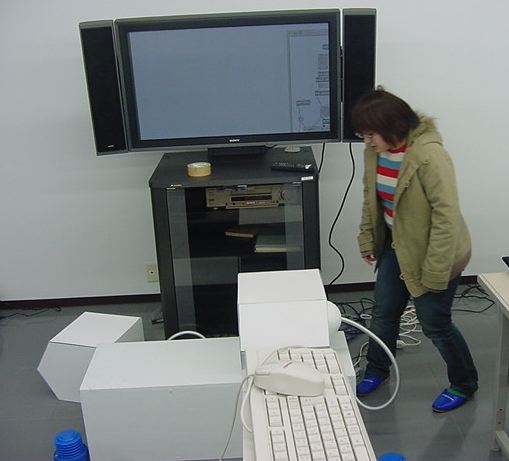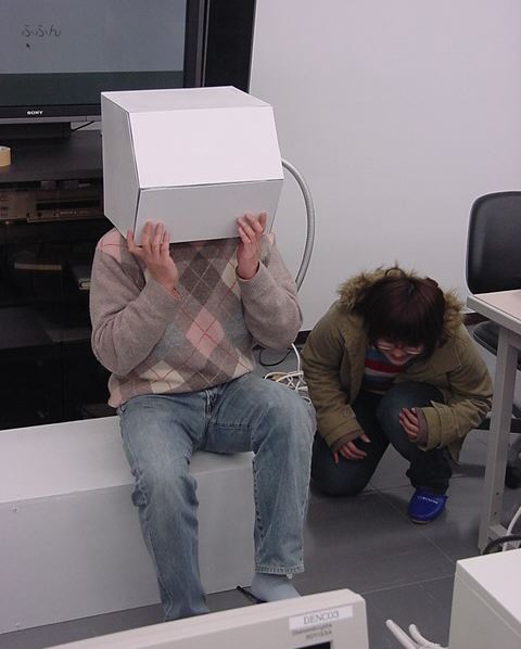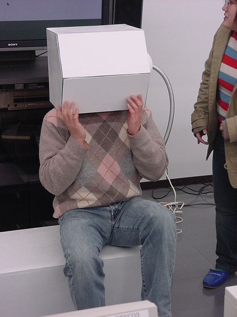 高木慶子さんは、インターカレッジに出展した形態から 大きく変化させて、「かぶりもの」を二人用にしました。 そして、サウンドとともに画像も出し、コミュニケーション というテーマを強調したのですが、これも時間との戦いで だいぶ苦しいことになりました。