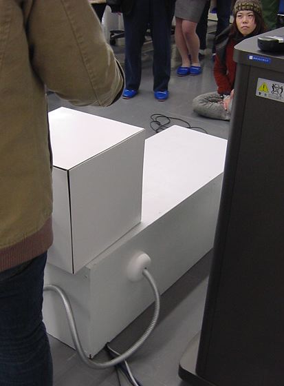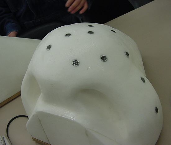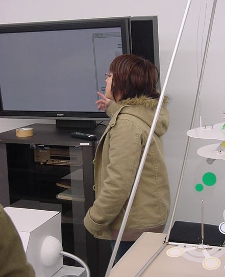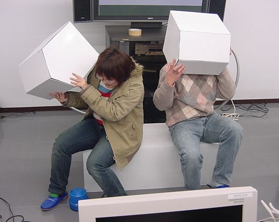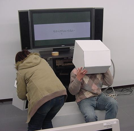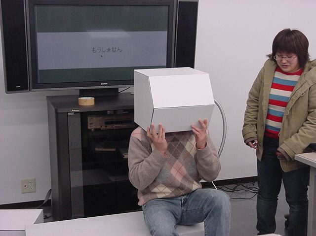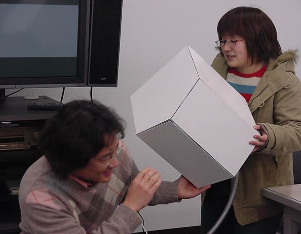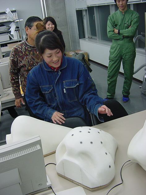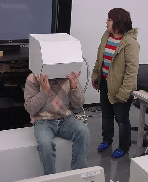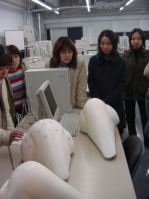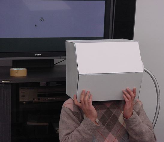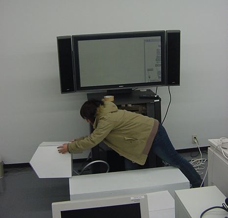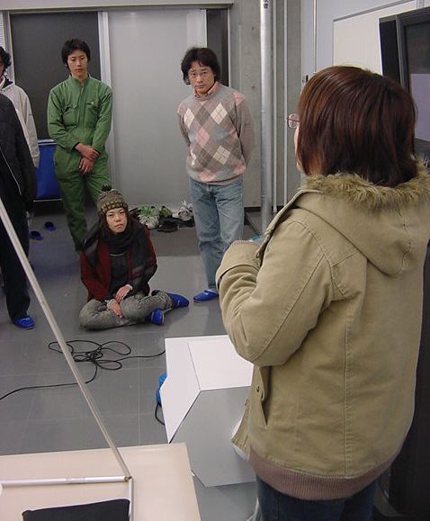 高木慶子さんは、インターカレッジに出展した形態から 大きく変化させて、「かぶりもの」を二人用にしました。 そして、サウンドとともに画像も出し、コミュニケーション というテーマを強調したのですが、これも時間との戦いで だいぶ苦しいことになりました。