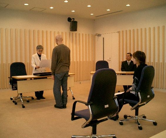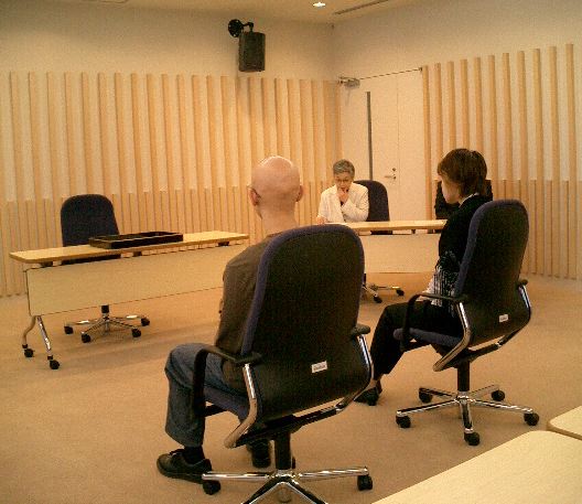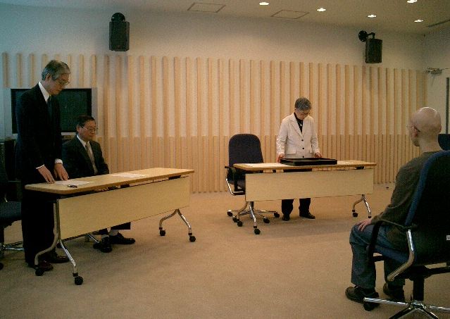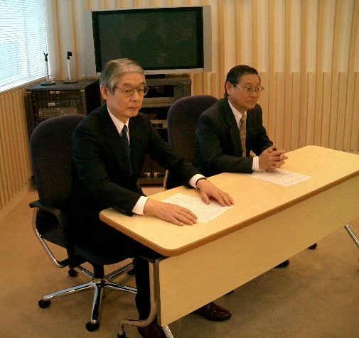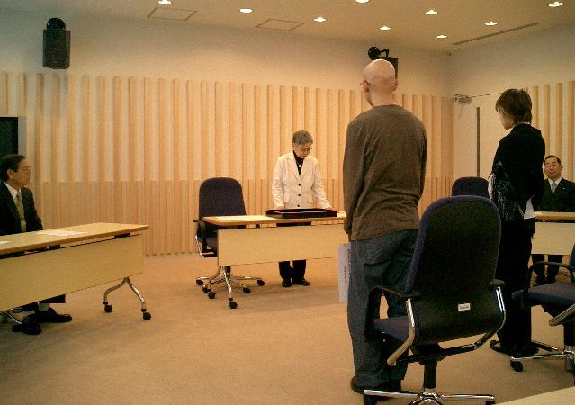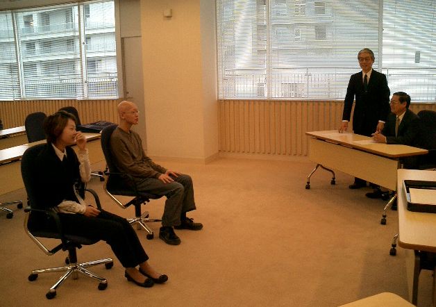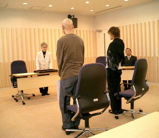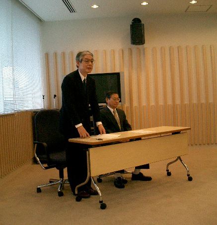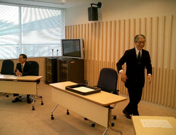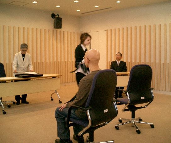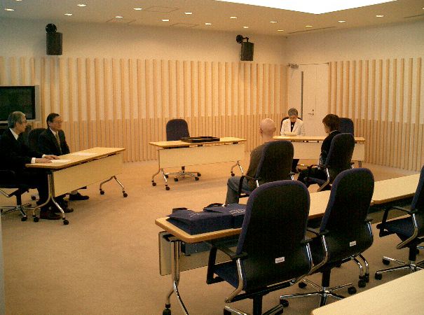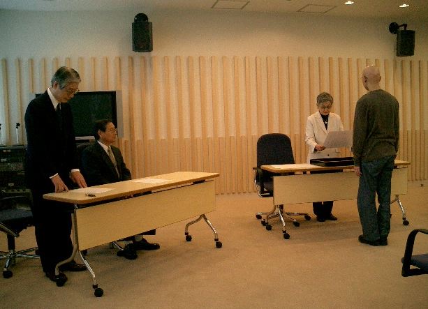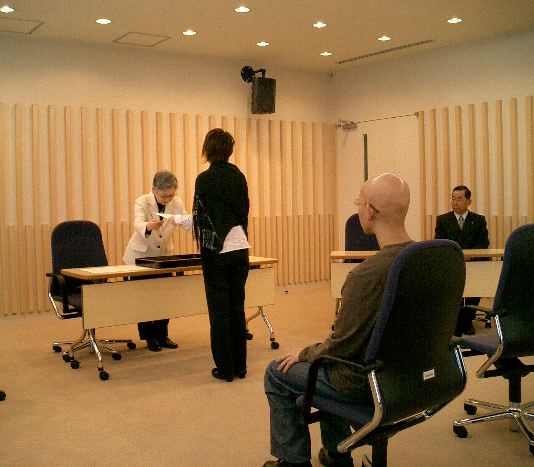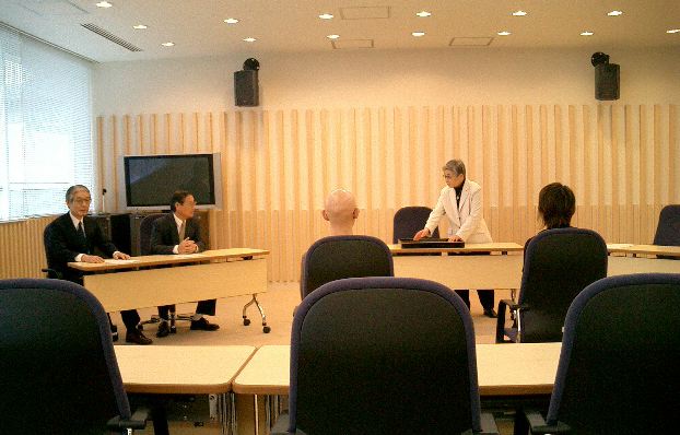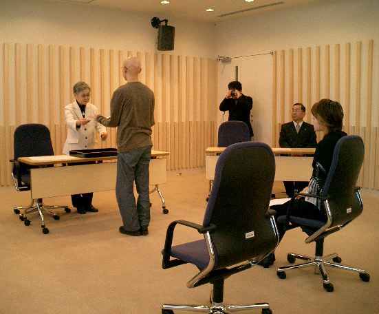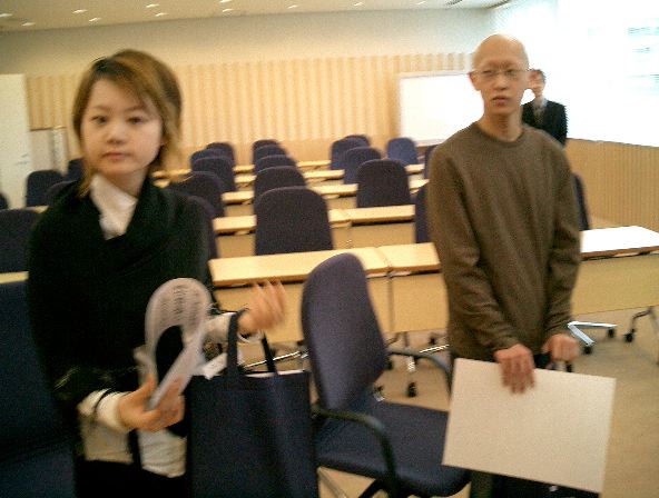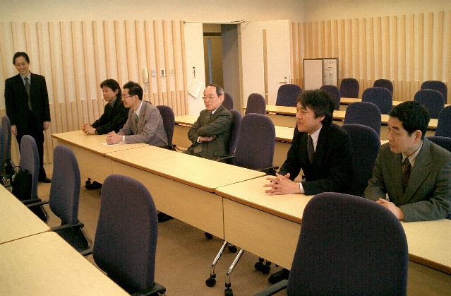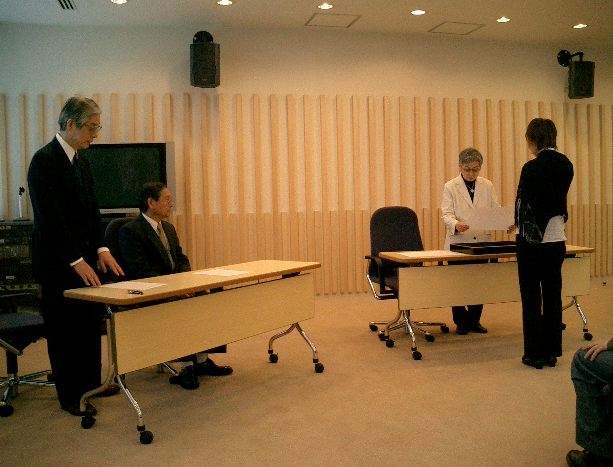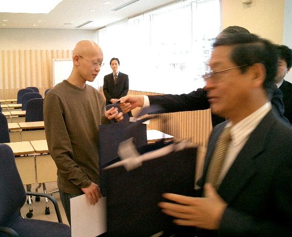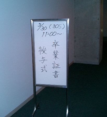 普段、学生が入ることもないデザイン学部教授会用の会議室で、ちょっとした 事情(^_^;)で3/17より遅れた卒業式が挙行され、2004年3月30日、 技術造形学科からさらに2人が卒業していきました。
