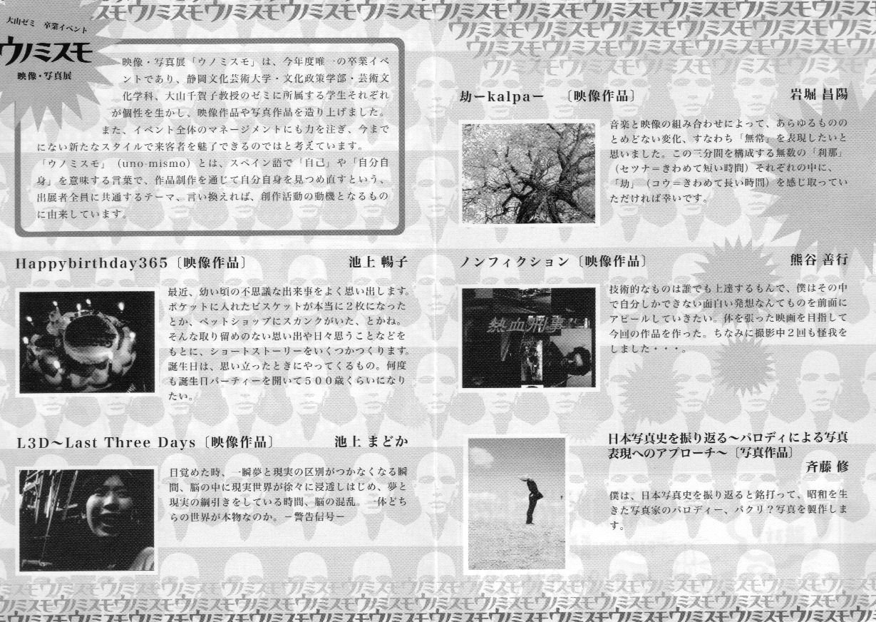 2004年10月14日 2004年10月14日、大山ゼミの学生による卒業イベントが ありました。 僕は大山先生の個展に 協力 したこともあり、大山ゼミの学生を日頃から応援しているので、 レセプションからフル参加しました。 皆んな頑張っていました。 一部の学生の作品をインカレに参加させる方向です。(^_^)