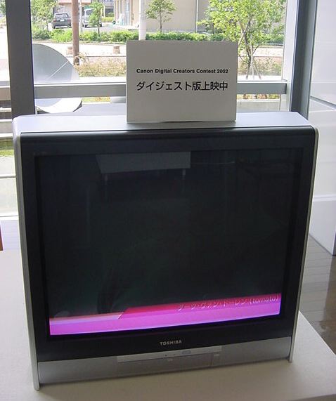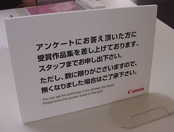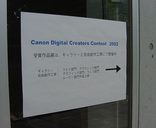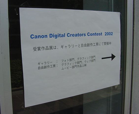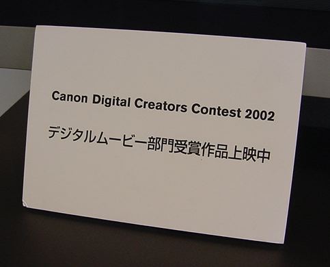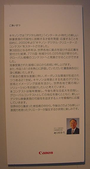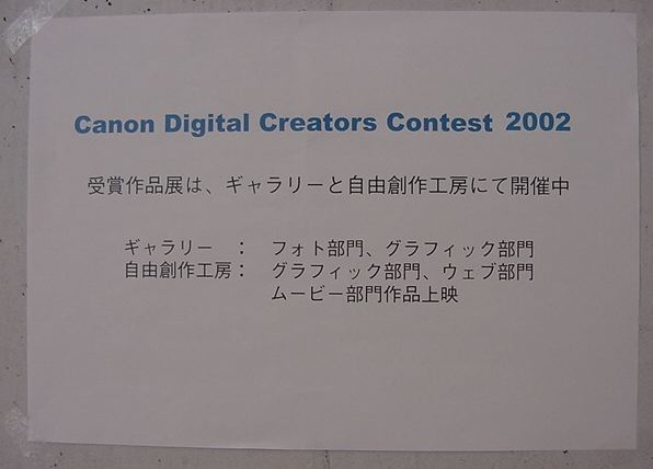 「キャノン・デジタルクリエイターズ・コンテスト2002」入賞作品展が、いよいよSUACで開催されました。以下はその初日、オープンの時の模様です。さすがに優秀作品展として水準も高く、圧巻です。多くの学生に刺激となれば嬉しいと思います。