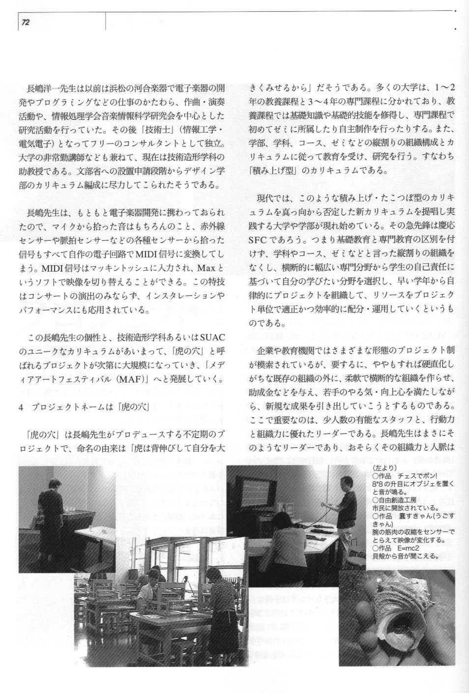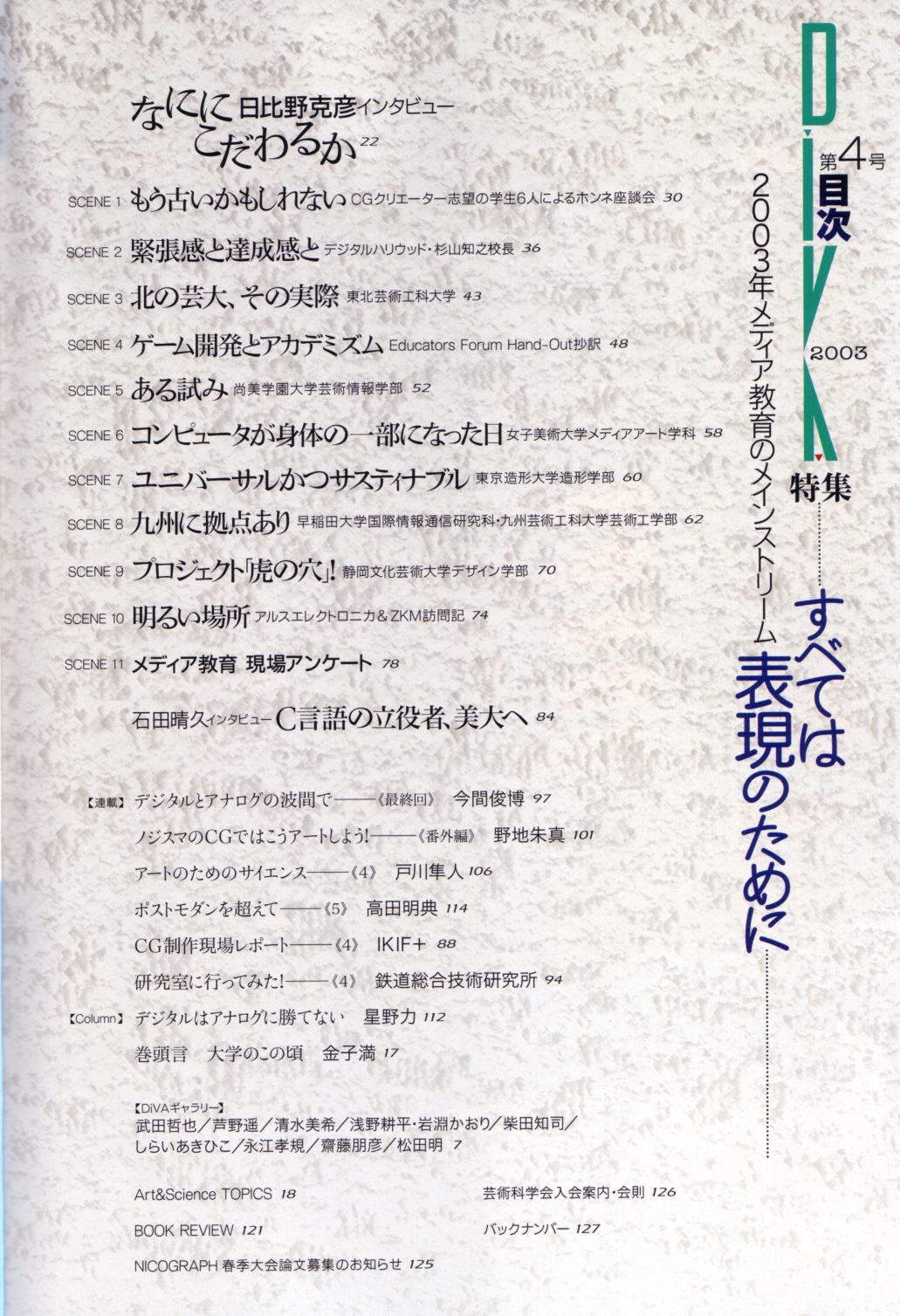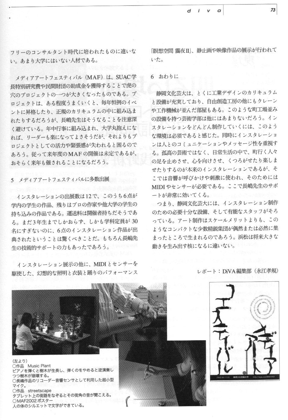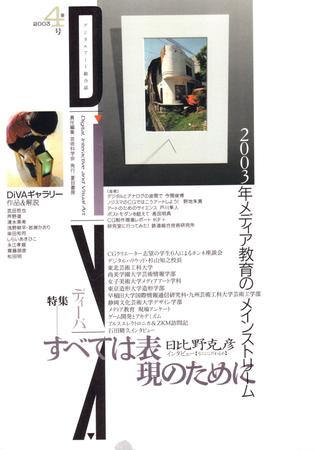 芸術科学会の学会誌でもある、夏目書房のデジタルアート総合誌「ディーバ」4号に載りました。 もう忘れていた、8ヶ月前のMAF2002の時に取材されたもので、本文中には「たぶんMAF2003 も開催されるであろう」などと書かれていますが、実際には今年は助成されなかったので開催されません。(;_;) 2003年4月15日発行、ということで発売はたしか4/25あたりだそうです。 ISBN4-86062-008-9以下は購入を検討される方のための資料としてごく一部を紹介しますが、 転載などは御遠慮下さい。