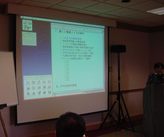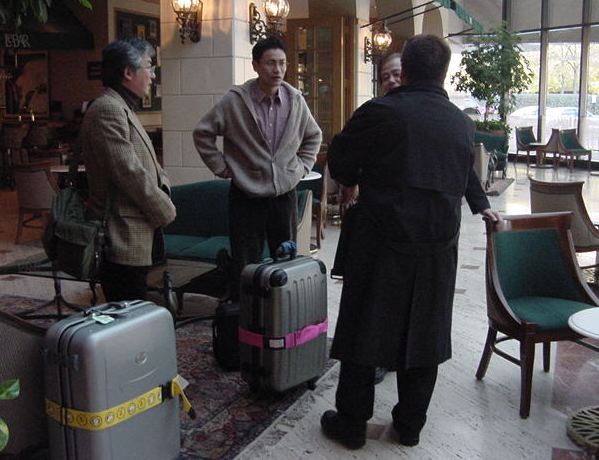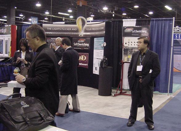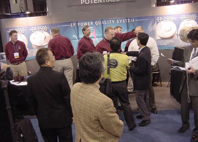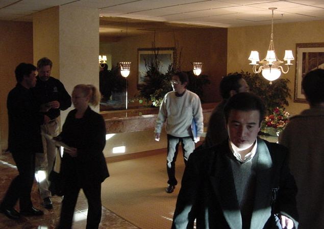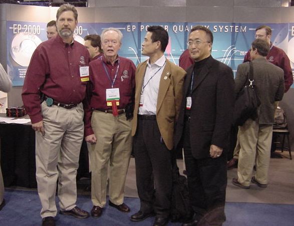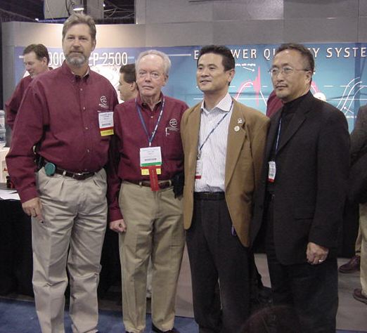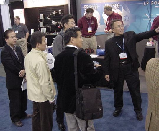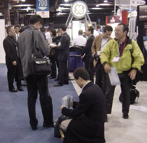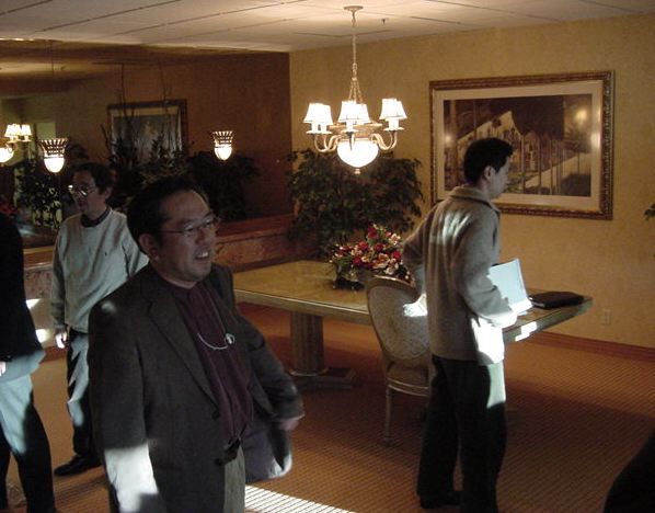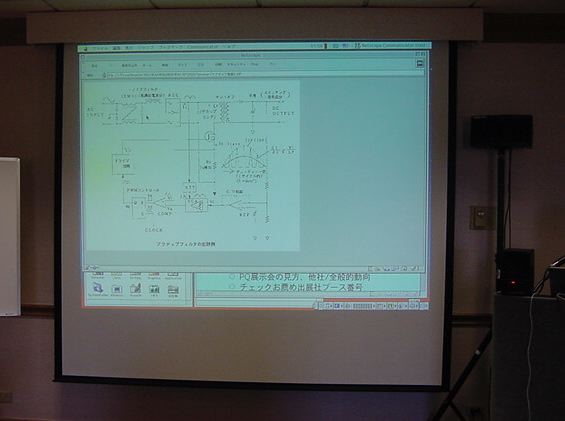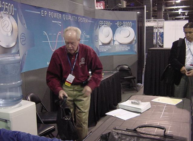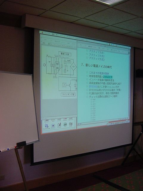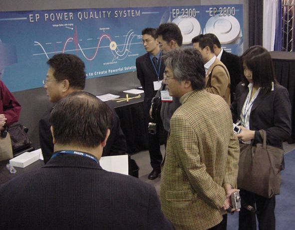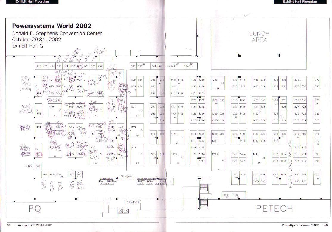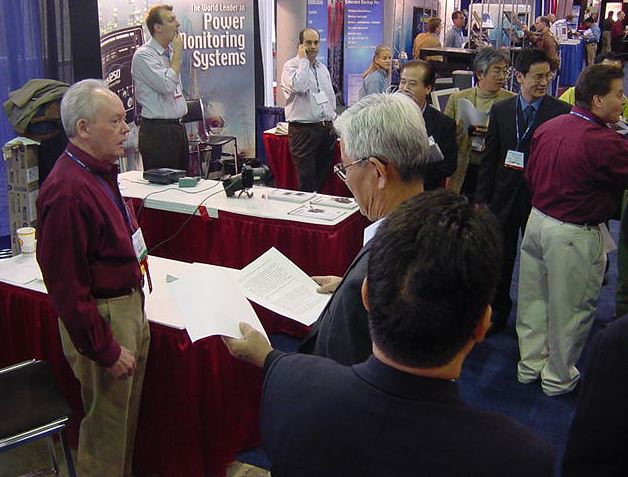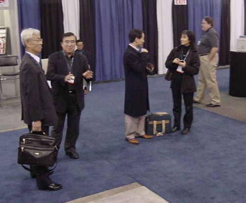 2002年10月30日(水)2日目の10/30はいよいよシカゴでの実質的な初日ということで、 まずは3泊滞在したホテルの自室の様子からスタートです。なかなかに豪華でした。 事前にプロバイダで設定していた海外ローミングサービスも無事に 機能していて、ホテルから近距離電話によって地元のアクセスポイントに ログインして、メイルのチェックもYAHOOのニュースも見ることが できました。セミナー資料の制作などのお仕事もしたので、朝食は ルームサービスをとってエコパル社に負担してもらいました。 朝起きてから出かける時なので、ちらかっているのは目をつぶって下さい。(^_^;)★ ★ ★ ★ ★ ★ ★ ★ ★ ★ ★ ★ ★ ★ ★ ★ ★ ★ ★ ★ 集合時間になり、ロビーに下りて、まずはこれも定番のホテルの 風景いろいろです。個々にはまだ名前と顔が一致していない人もいるので 紹介省略ですが、メンバーもぼちぼち集合して、隣にあるコンベンションセンターで 開催されている、 Power Systems Worldという展示会に向かいました。 この展示会は、Power Technologyカンファレンス/エキシビジョン、つまり 電力技術に関するアメリカ最大の展示会がメインですが、我々の本命は 同時開催されている Power Qualityカンファレンス/エキシビジョン の方です。つまり、この併催の電力品質(Power Quality)の展示会に、 ベンチャーであるEP社が初めて出展した、というところに集まったのです。 これがそのチラシ (関係者用で入場料無料)の表、 これが裏です。 ★ ★ ★ ★ ★ ★ ★ ★ ★ ★ ★ ★ ★ ★ ★ ★ ★ ★ ★ ★ ★ ★ ★ ★ ★ ★ ★ ★ ★ ★ ★ ★ ★ ★ ★ ★ ★ ★ この展示会は一般来場者は30ドルが必要ですが、我々は出展者である EP社のExbitorネームタグによりフリーパスでした。3日間の展示会の 2日目の朝イチというところで、ぼちぼち始まるという雰囲気が分かる でしょうか。EP社のブースにいきなり日本人ばかりが20人ほど集結して いる風景はとても異様で(^_^;)、なかなか目立っていました。 基本的には、幕張メッセや東京ビッグサイト、古いところでは晴海の 国際見本市会場で開催されるエレショーとかPCワールドなどの展示会と 同様のものですが、テーマが「電力」と限定されているので、基本的には 技術的な関係者、あと関連ビジネスの人たちが全米からシカゴに やってくる、というものです。 ★ ★ ★ ★ ★ ★ ★ ★ ★ ★ ★ ★ ★ ★ ★ ★ ★ ★ ★ ★ ★ ★ ★ ★ ★ ★ ★ ★ ★ ★ ★ ★ ★ ★ ★ ★ この日の午前には、ポスターのブースで、Price教授自身による ポスタープレゼンテーションがある、ということで、関係者はそこから 全員集合なのでした。僕はもしかしたら予定していたセミナーがこの日に あるのかも、とパソコンまで背負っていたのですが、セミナーの予定は 変更なく翌日である、と判明したので、いったんホテルに戻って パソコンを置いてきました。展示会会場とつながっているホテルだから 出来る芸当です(^_^)。 再びEP社のブースに戻ってみると、既に準備していたPrice教授だけでなく、 テッド社長以下、EP社のスタッフも揃ってきました。 あまりに多数の関係者が通路を占めているので、最初にEP社のお向かいの ブースの会社の説明を全員で拝聴しましたが、実はここもバッテリ無しで わずかな瞬停をカバーする機器、という面白い出展をしていました。 わかる人はこの写真だけでも十分に分かるでしょう、 ★ ★ ★ ★ ★ ★ ★ ★ ★ ★ ★ ★ ★ ★ ★ ★ ★ ★ ★ ★ ★ ★ ★ ★ ★ ★ さて、いよいよPrice教授のポスタープレゼンです。配付された資料と ともに、その場に居合わせた関係者がこの写真を見れば分かりますが、 そうでなければどうでしょうか(^_^;)。 電気工学・電子工学の基本的なお話だけと言えばそうなのですが、 実はここに単行本にも書いた「EP2000の秘密」のヒントがあった ような気もします。通訳はエコパル社の山本社長です。 ★ ★ ★ ★ ★ ★ ★ ★ ★ ★ ★ ★ ★ ★ ★ ★ ★ ★ ★ ★ ★ ★ ★ ★ ★ ★ ★ ★ ・・・ということで、なんともいえない謎をその場に残しつつ(^_^;)、 Price教授のポスタープレゼンが終了しました。ここからは各自が 自由に展示会を見学する、ということになり、デジカメ三昧で 多数の情報収集に乗り出しました。この写真の中からは、翌日の セミナーでもさっそく材料として活用しました。これまた、見る人が 見れば分かるいろいろもろもろ(^_^;)が満載です。 現場にいた人は分かるかと思いますが、ブースを全て、番号順に網羅して みました。ただし、自分の興味に応じて重みがだいぶ片寄っていますので 注意して下さい。 ★ ★ ★ ★ ★ ★ ★ ★ ★ ★ ★ ★ ★ ★ ★ ★ ★ ★ ★ ★ ★ ★ ★ ★ ★ ★ ★ ★ ★ ★ ★ ★ ★ ★ ★ ★ ★ ★ ★ ★ ★ ★ ★ ★ ★ ★ ★ ★ ★ ★ ★ ★ ★ ★ ★ ★ ★ ★ ★ ★ ★ ★ ★ ★ ★ ★ ★ ★ ★ ★ ★ ★ ★ ★ ★ ★ ★ ★ ★ ★ ★ ★ ★ ★ ★ ★ ★ ★ ★ ★ ★ ★ ★ ★ ★ ★ ★ ★ ★ ★ ★ ★ ★ ★ ★ ★ ★ ★ ★ ★ 