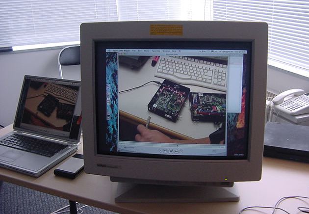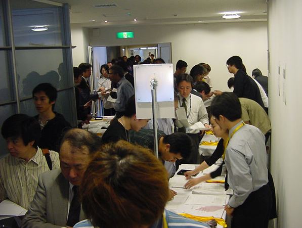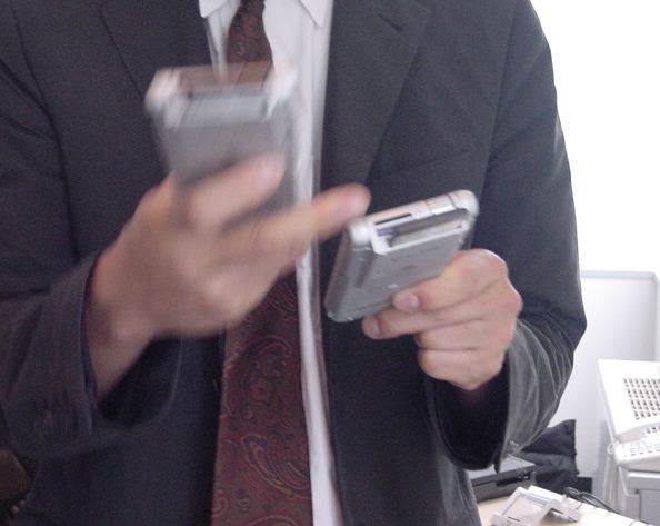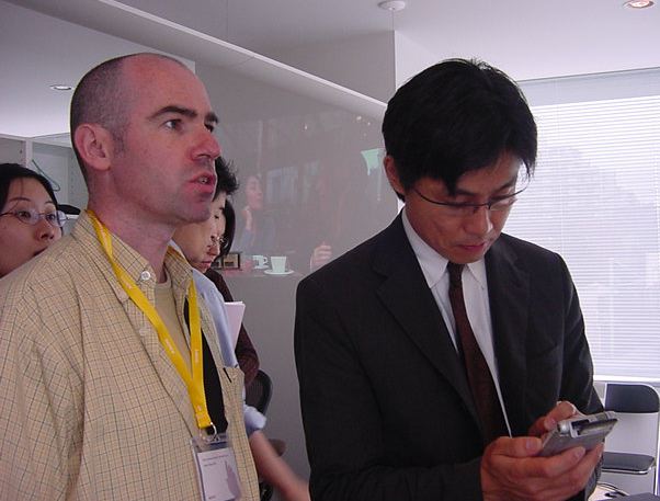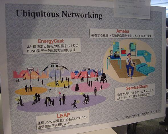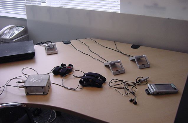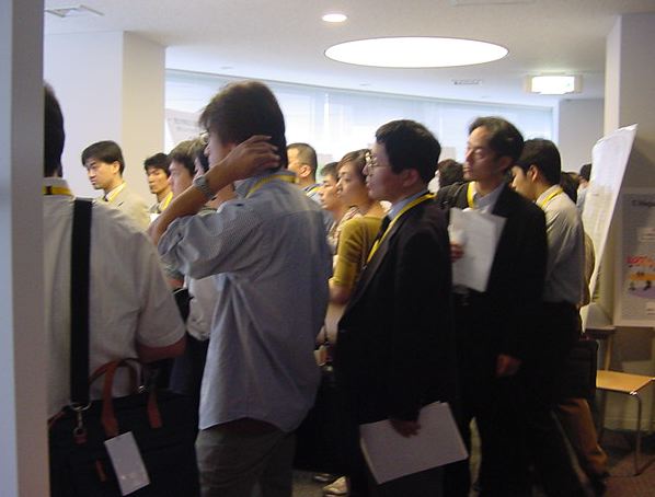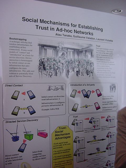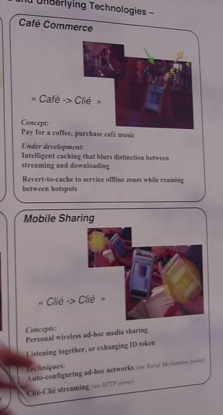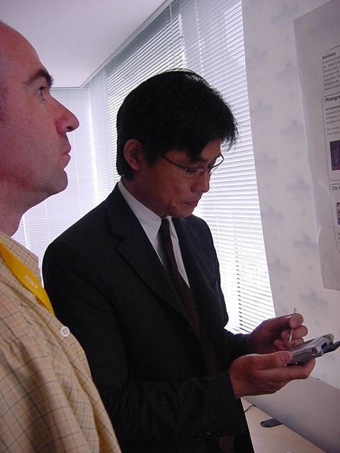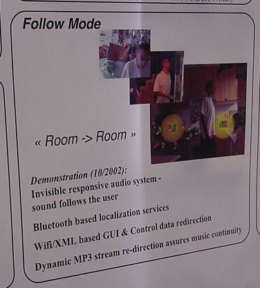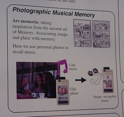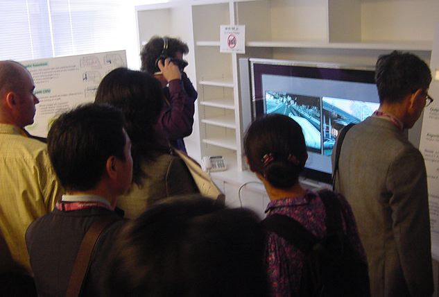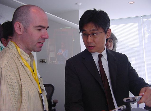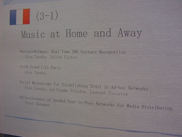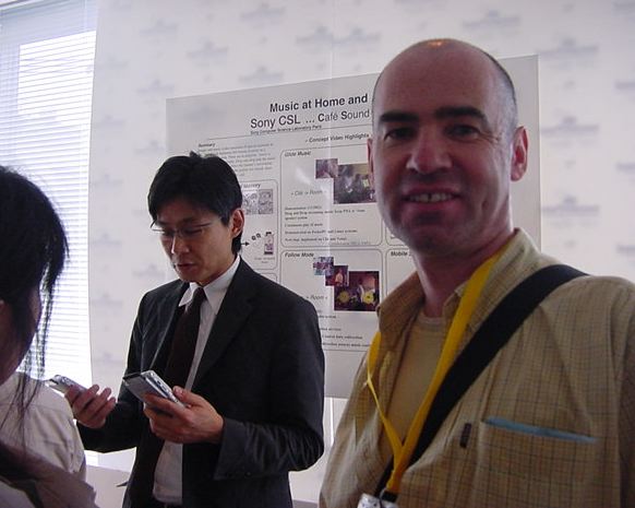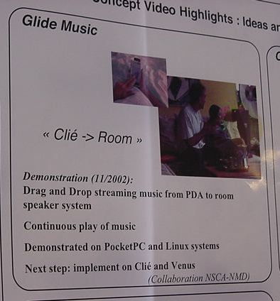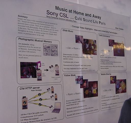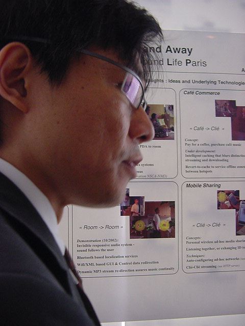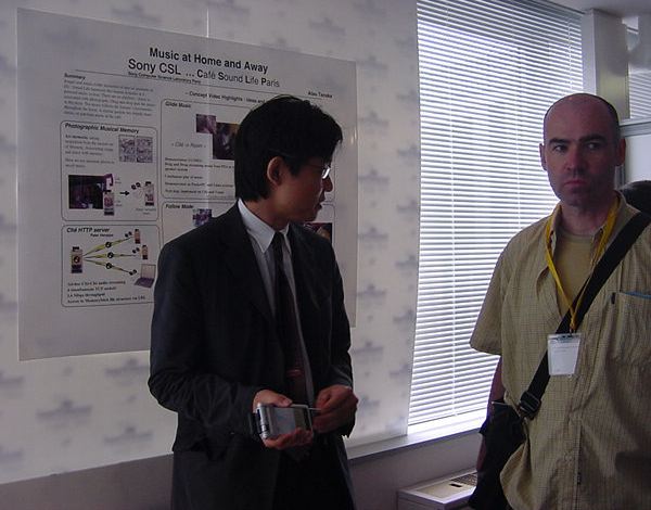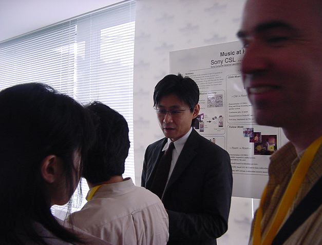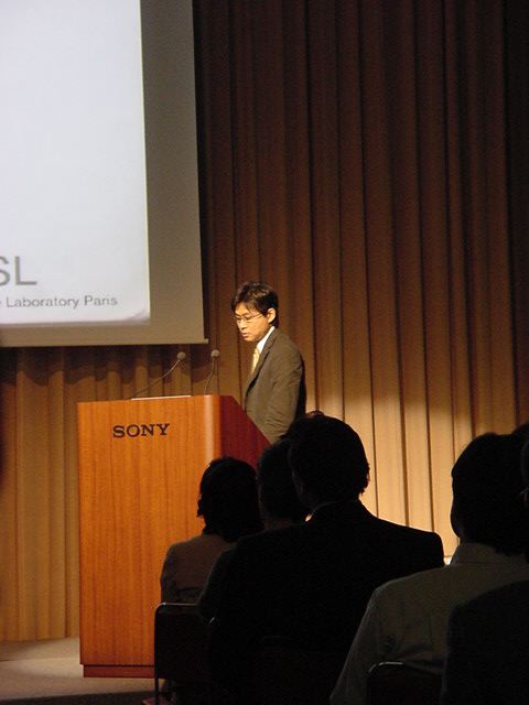 Sony CSL OpenLab 2003年6月 長嶋洋一 Sonyのコンピュータサイエンスラボラトリ(CSL)のオープンラボに行きました。 初日6/12にはパリCSLのAtau Tanakaの講演などを聞きました。 翌日6/13にはATRのMicheal Lion氏を秋月電子などに案内して、そのあとCSL研究デモを見ました。 最初にアタウの研究デモを見て、そのあとカメラ撮影は駄目、と気付くまでに撮ったものです。 ということでこれは見なかったことにして下さい。(^_^;)