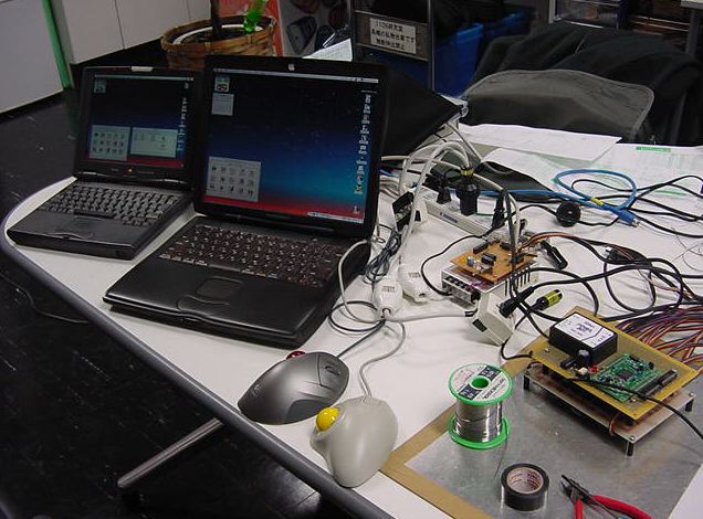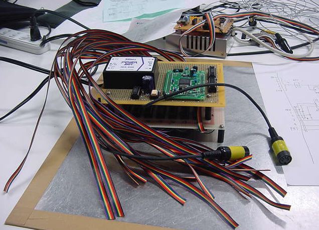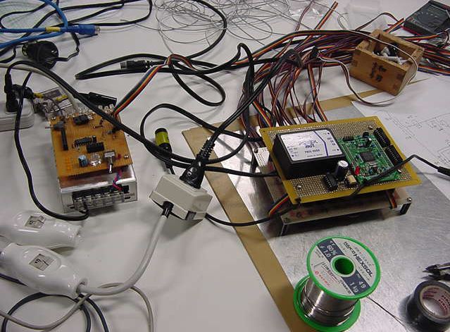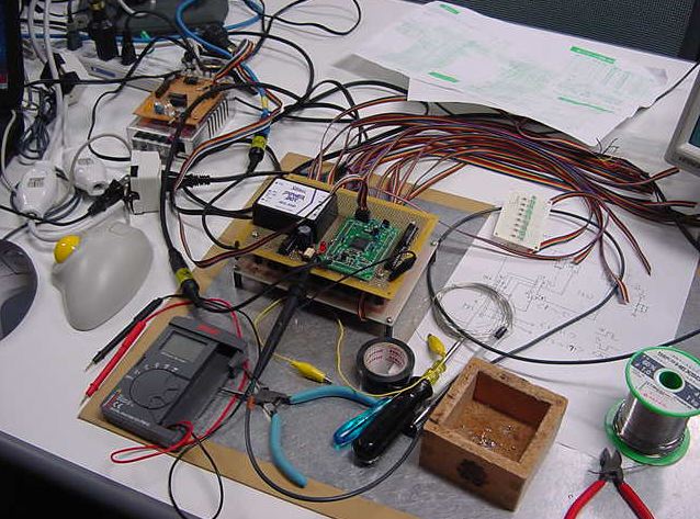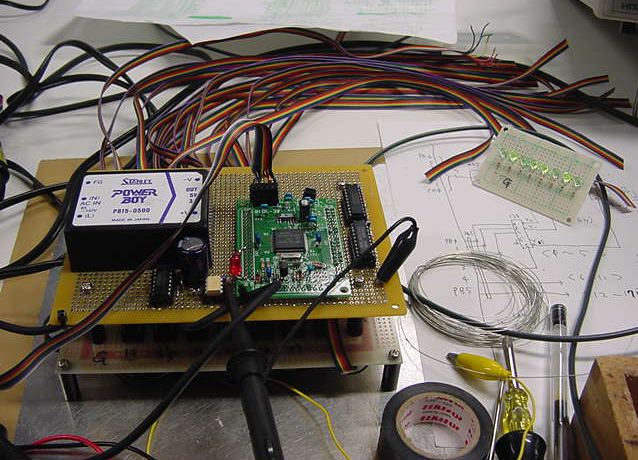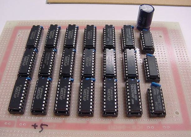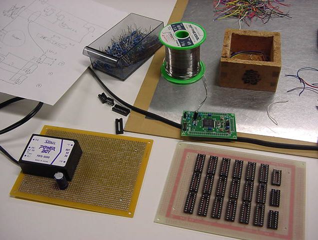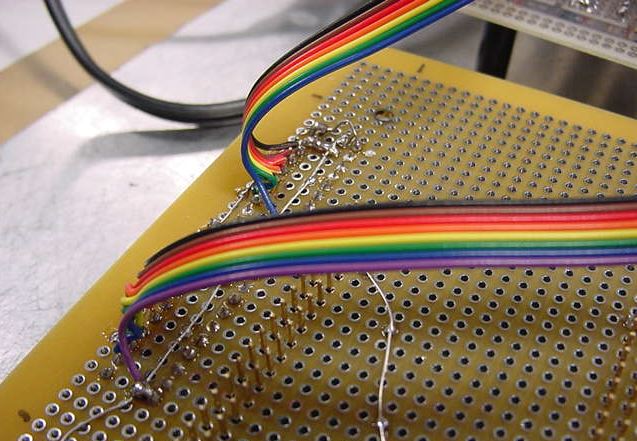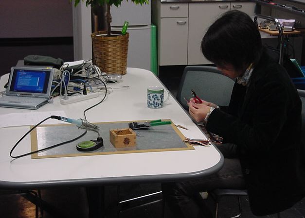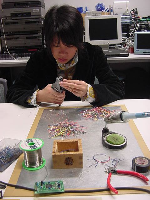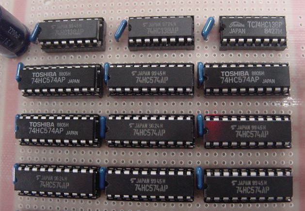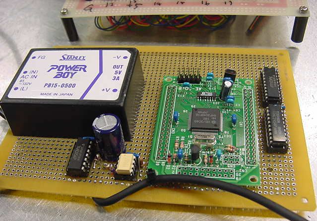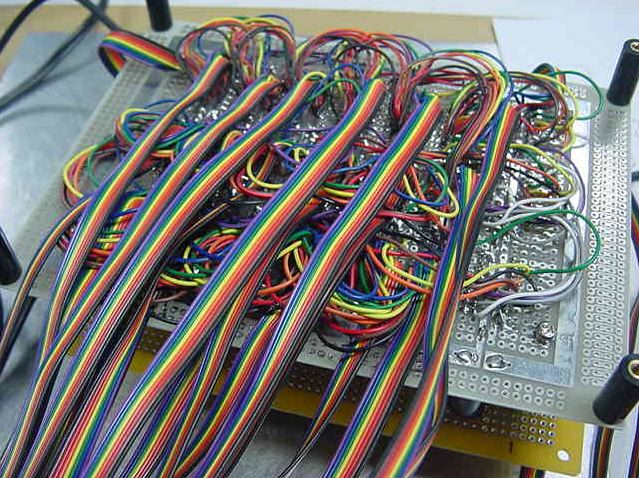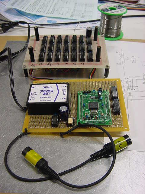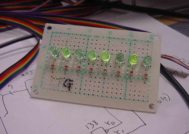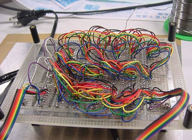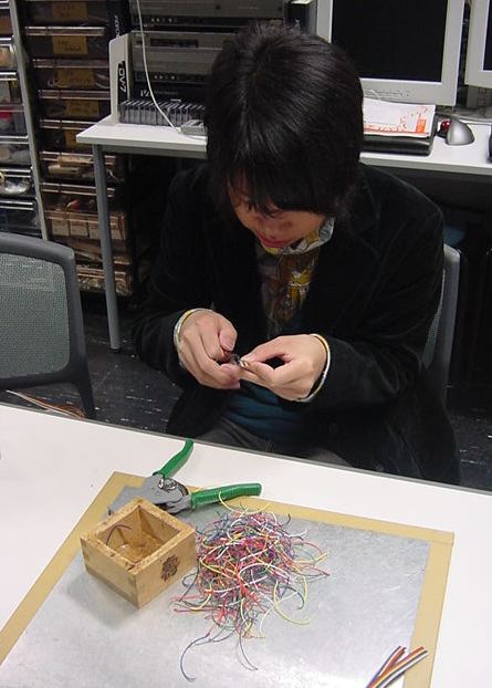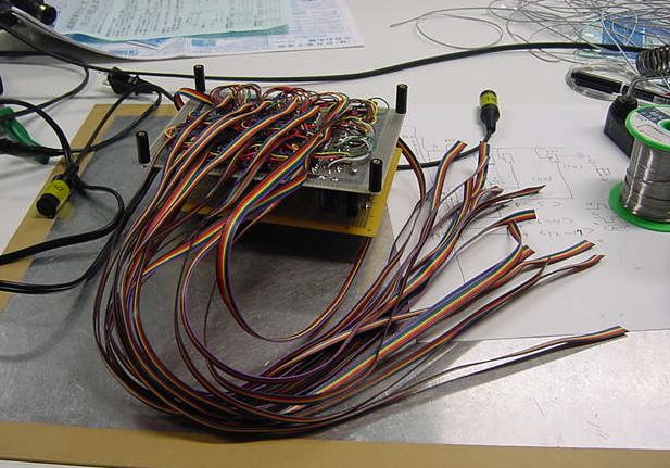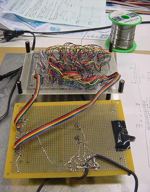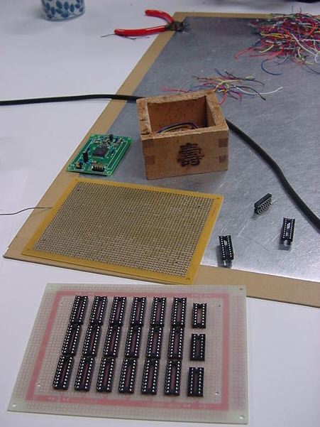 ゼミ学生の一人、鈴木飛鳥さんが制作しているインスタレーションの 一部として、「123個の青色LEDをMIDIで制御」というシステムが 必要となり、それを製作している途中の風景です。 多数のICと配線が必要ということで、内職として多数のリード線 (両端を線剥きしてハンダメッキ)を作ってもらい、あとはいつもの ようにAKI-H8で作りました。以下はその模様です。完成した作品は インターカレッジでお披露目です。