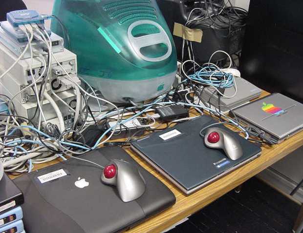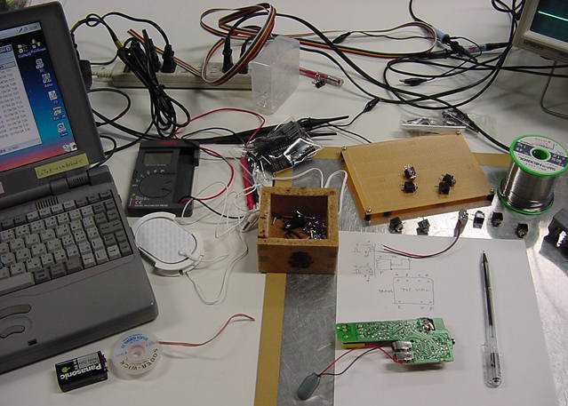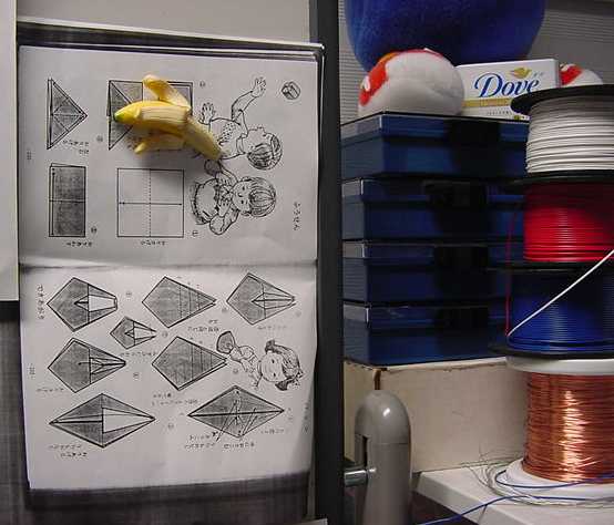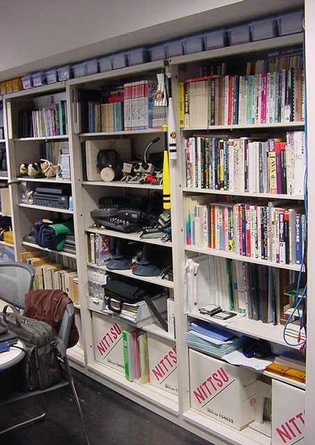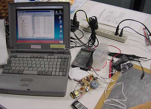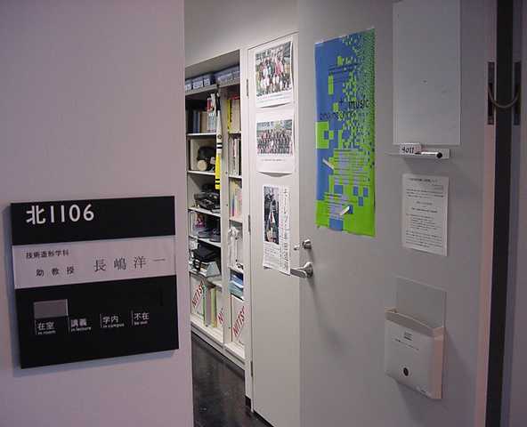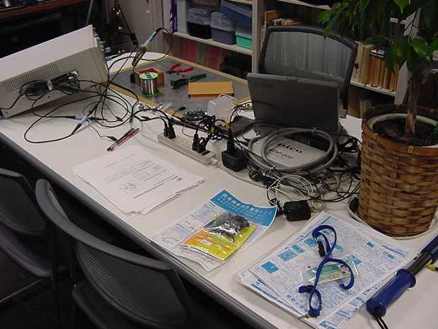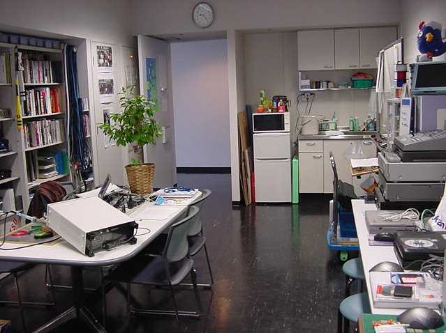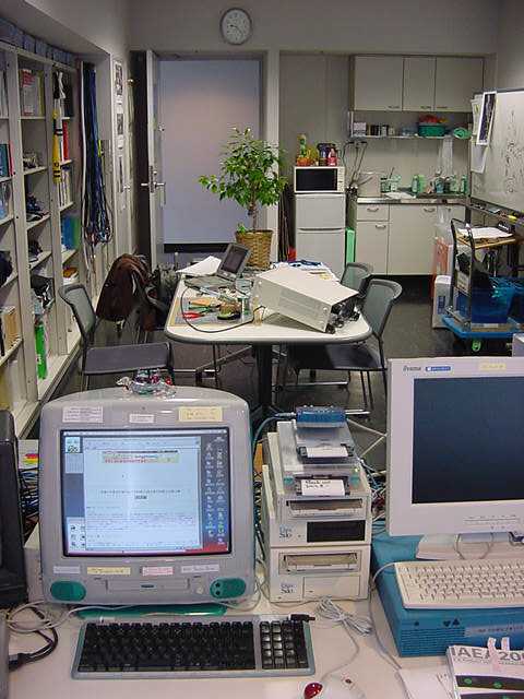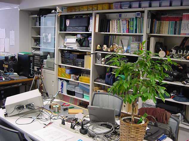 2001年12月9日 SUAC1106研究室の風景 長嶋洋一 ある日の1106研究室の風景です。「癒し系」、もとい、 「怪し系」の雰囲気がそこはかとなく漂っている、落ち着きのある 部屋です(^_^;)。 この日はSUACが工事のためインターネット途絶して邪魔も入らず、 こんなことをしていました。解説省略。(^_^;)