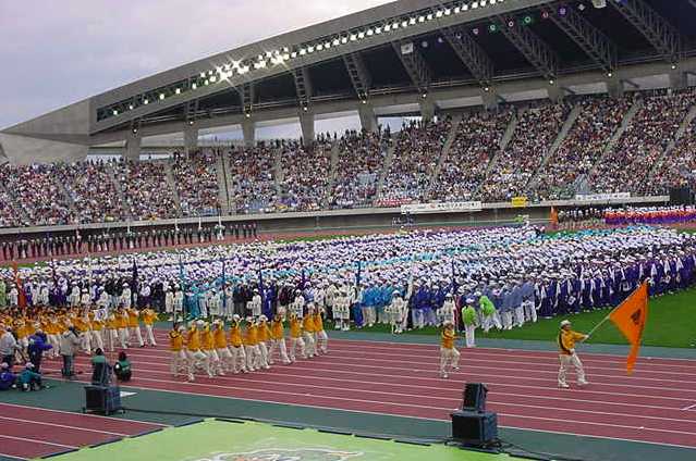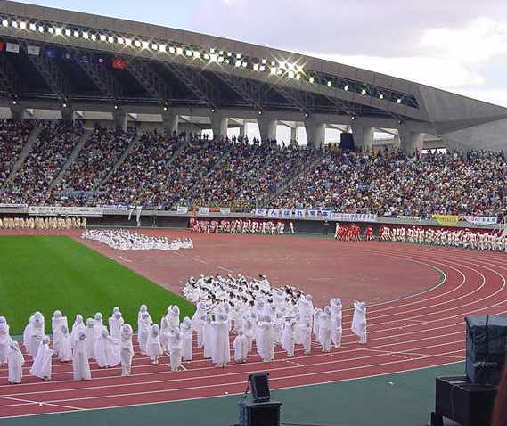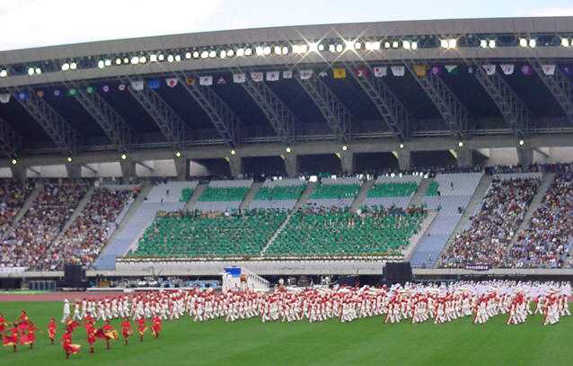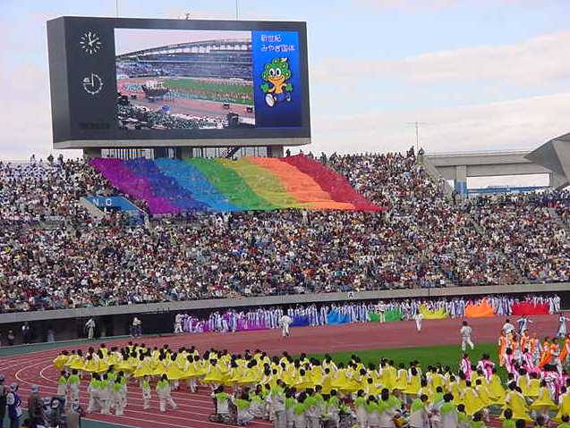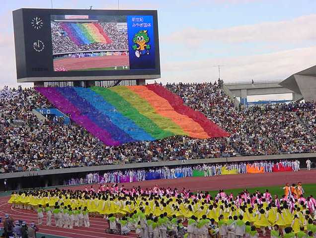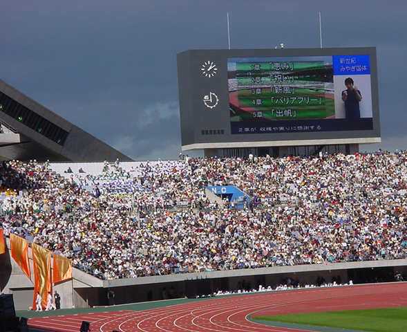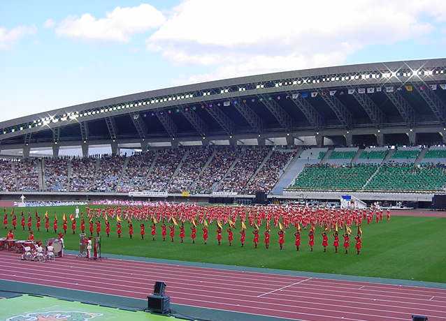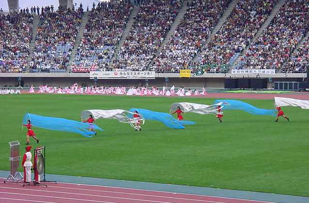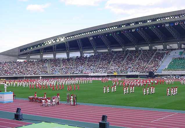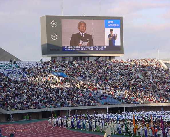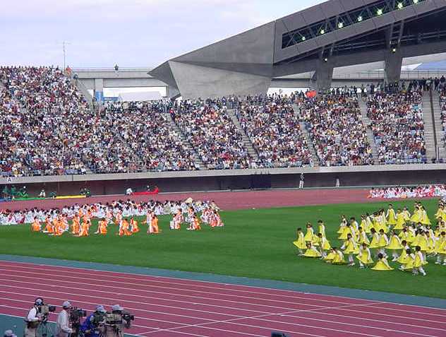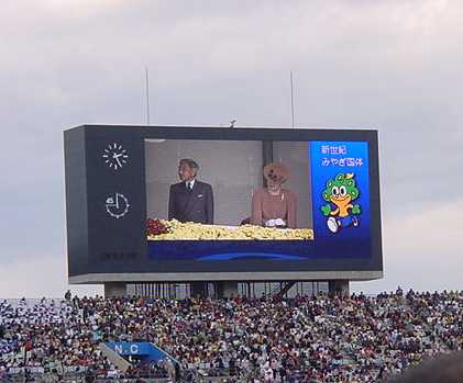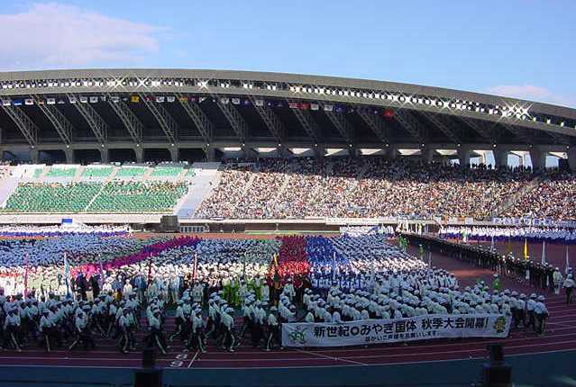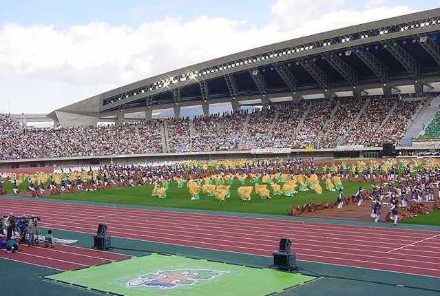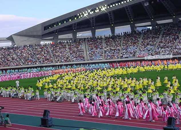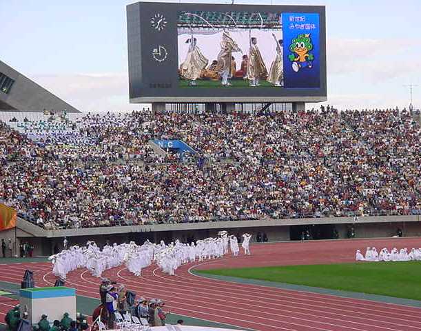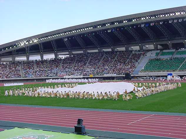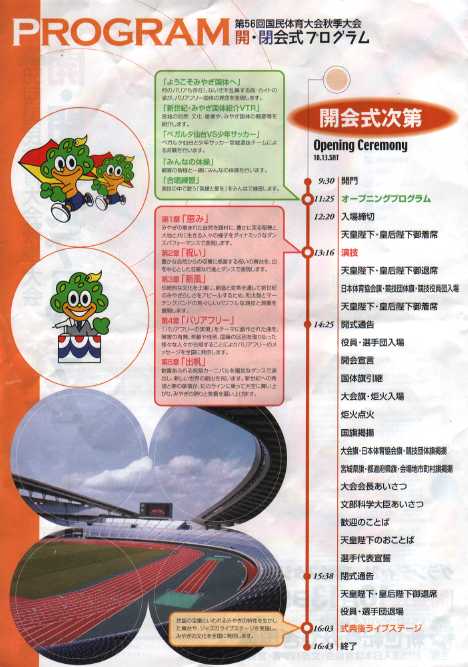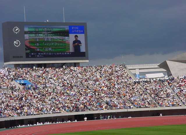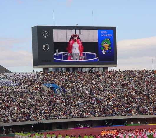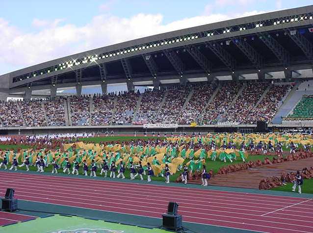 宮城国体秋期大会開会式視察レポート2001年10月 長嶋洋一2003静岡国体・SUAC式典プロデュースチームの一員として、去年の富山国体 の4回の視察に続いて、今年も宮城国体に計4回、視察に行くことになりました。 今回は、10/13の秋期大会開会式の模様です。
