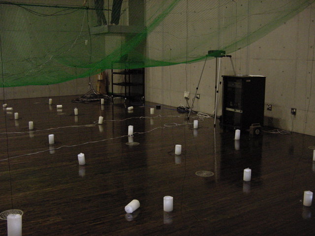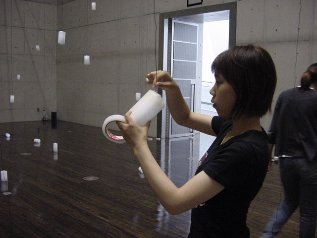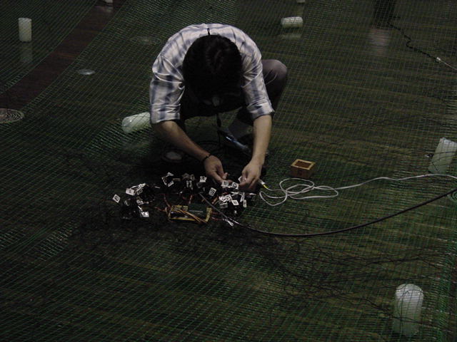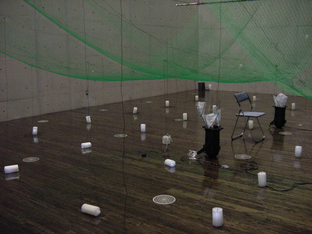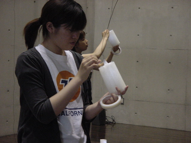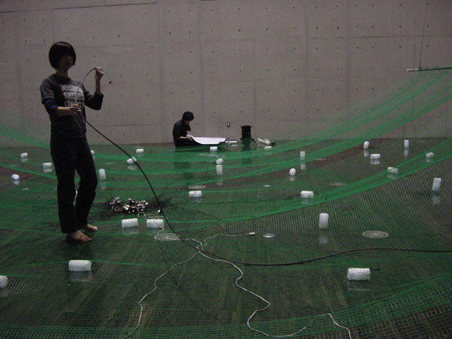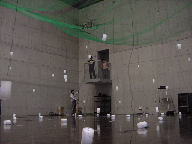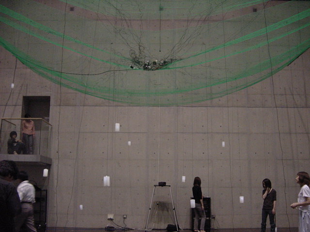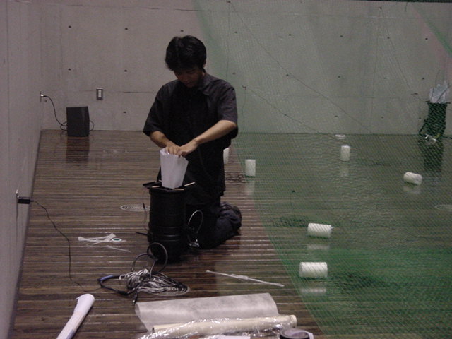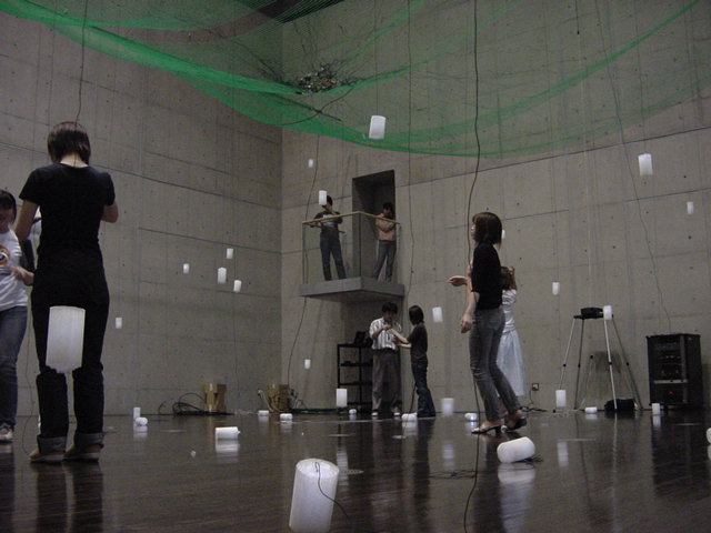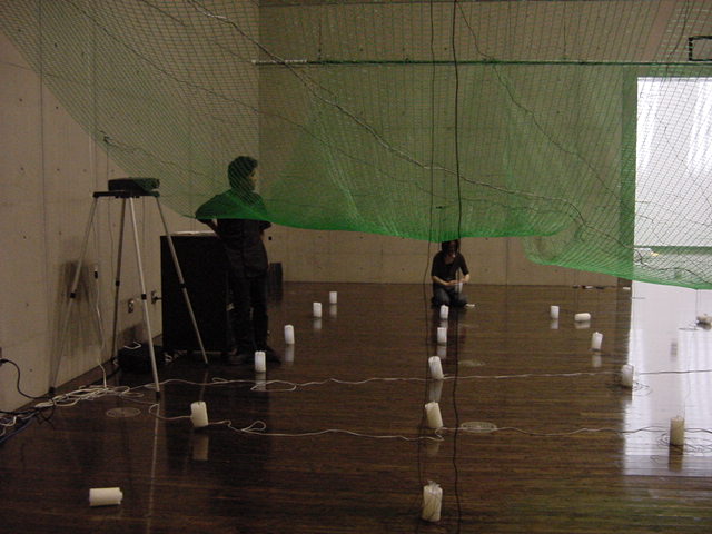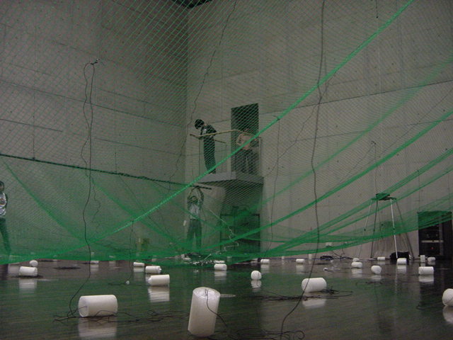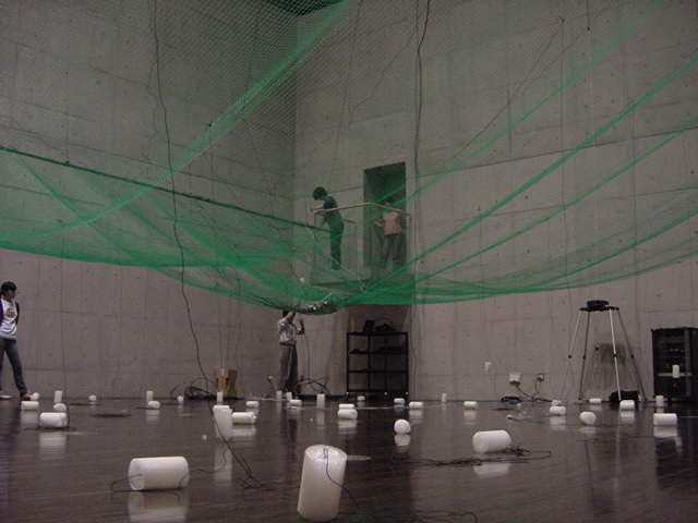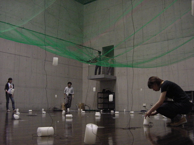 「第13期虎の穴」のメンバーによる「靄夜II」(もや)の メイキング風景です。 6月9日の設置2日目は、「靄夜II」でパフォーマンスをしていただく 川村武子さんを迎えて、センサの検証などもからめていろいろ実験 しました。