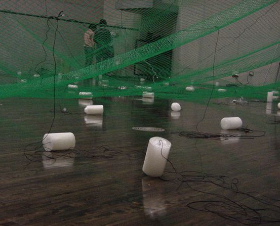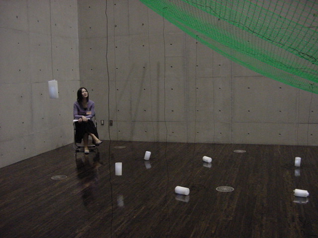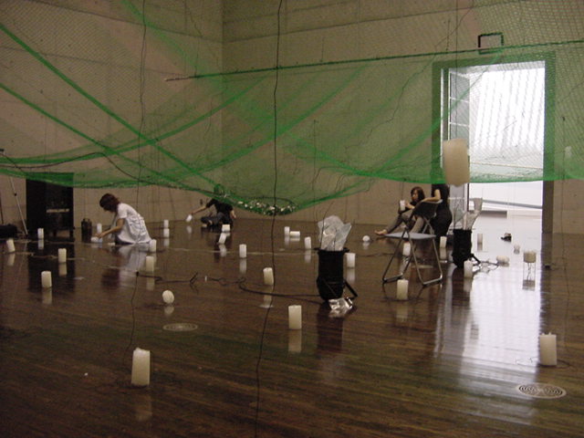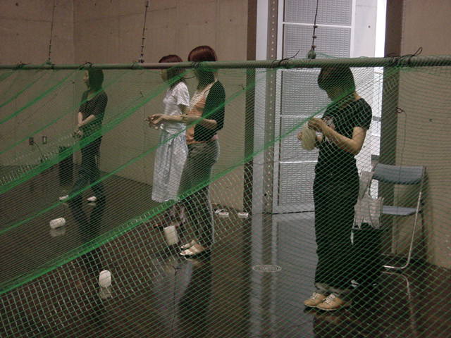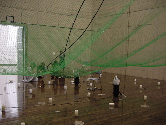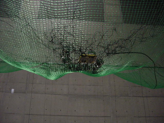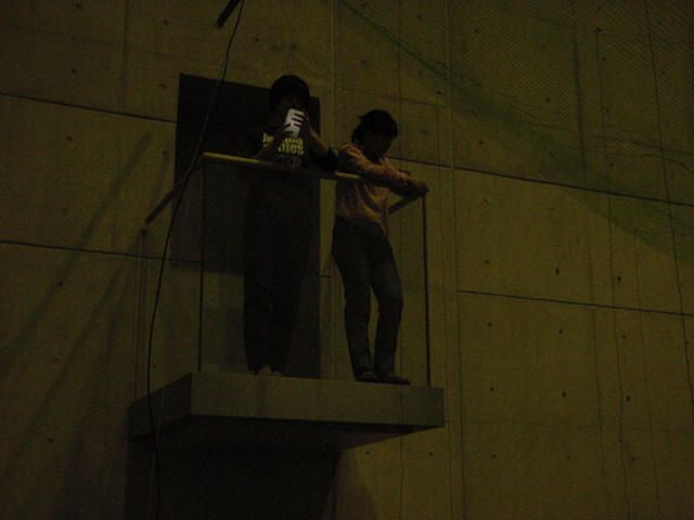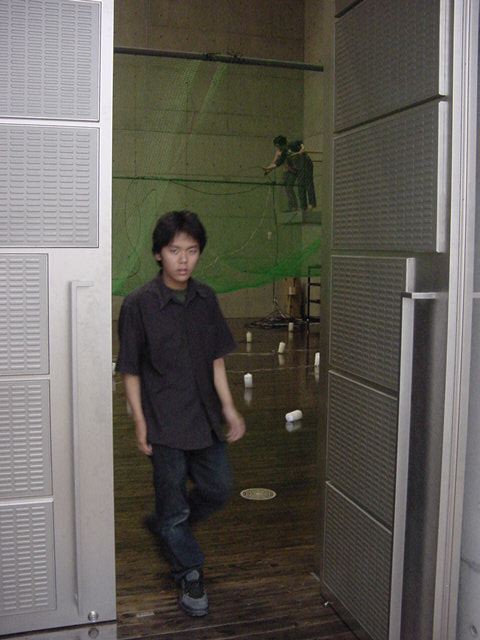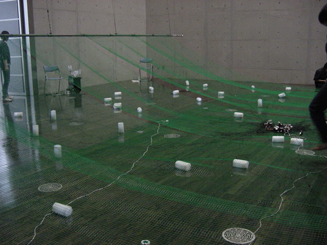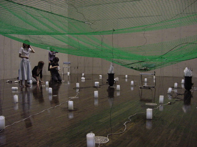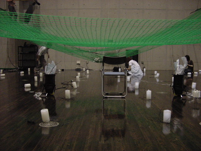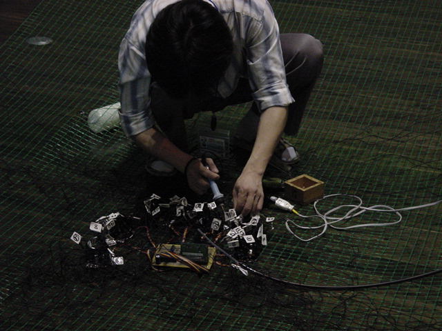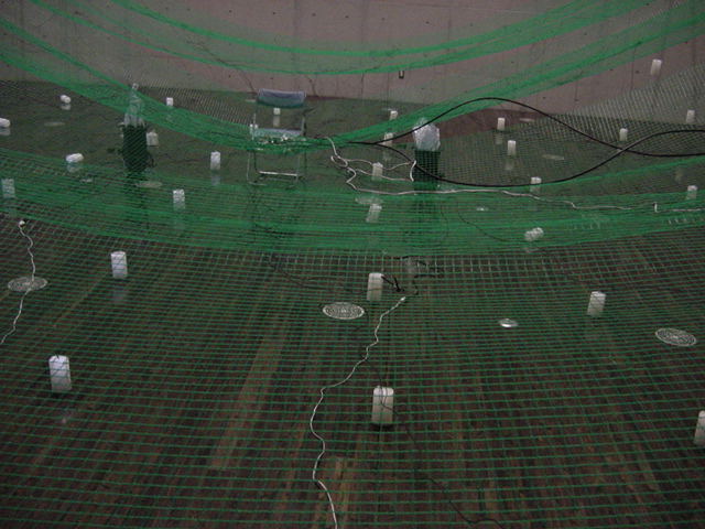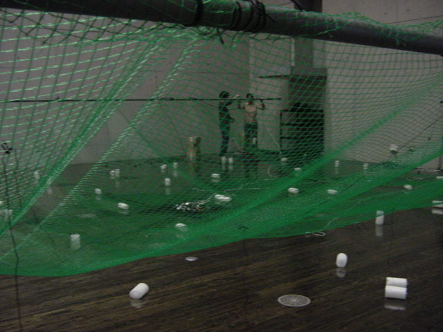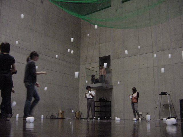 「第13期虎の穴」のメンバーによる「靄夜II」(もや)の メイキング風景です。 6月9日の設置2日目は、「靄夜II」でパフォーマンスをしていただく 川村武子さんを迎えて、センサの検証などもからめていろいろ実験 しました。