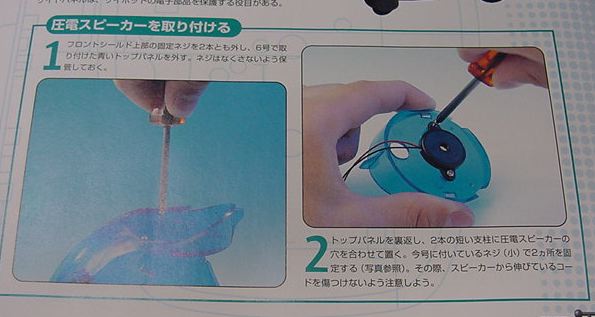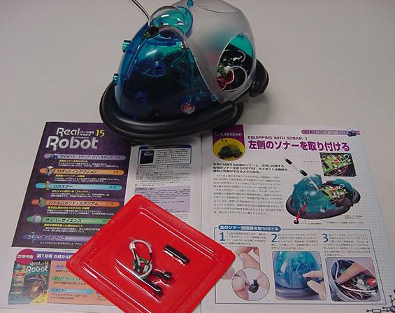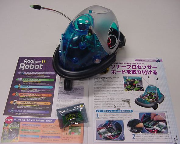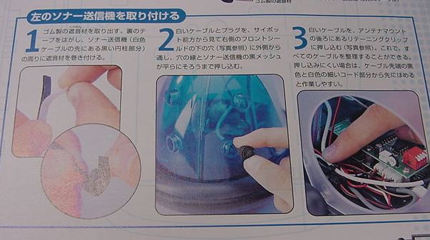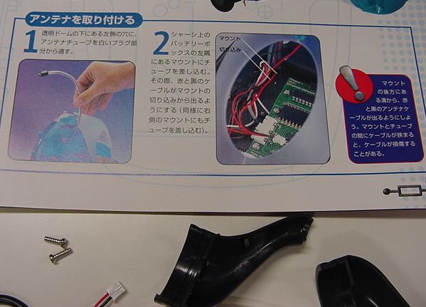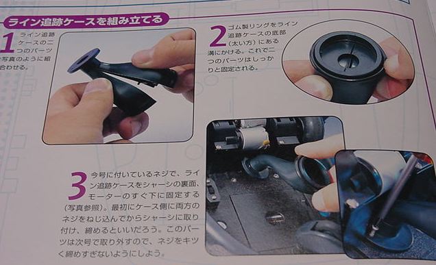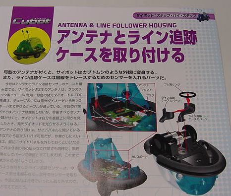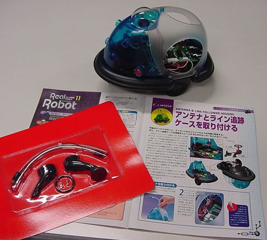 ★ ★ ★ ★ ★ ★ ★ ★ ★ ★ ★ ★ ★ ★ ★ ★ ★ ★ ★ ★ ★ ★ ★ ★ 次は第11号の分です。 「アンテナとライン追跡ケースを取り付ける」とありますが、 アンテナというのは嘘で、チューブの先にはLEDが付いていて、まぁ昆虫の「ヒゲ」みたいにものでした。 追跡ケースというのも、とりあえず取り付けたのですが、また翌週には外して分解して組み立てる、という ことで、どうも時間稼ぎっぽい段取りでした。