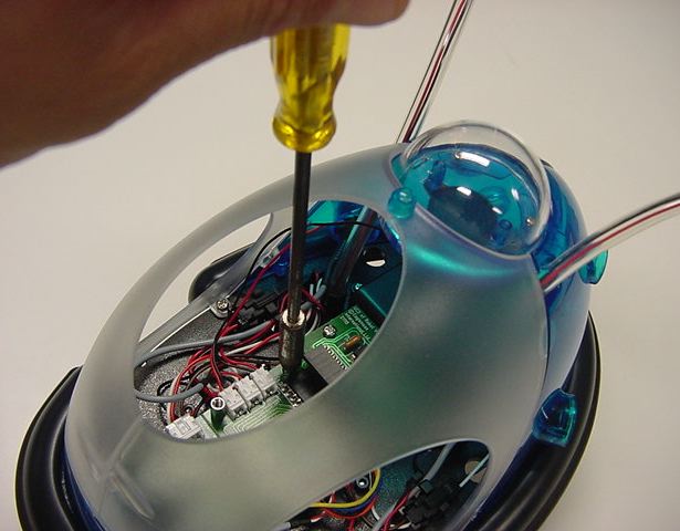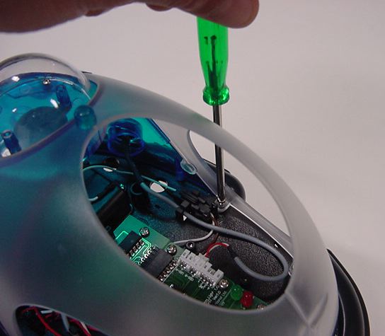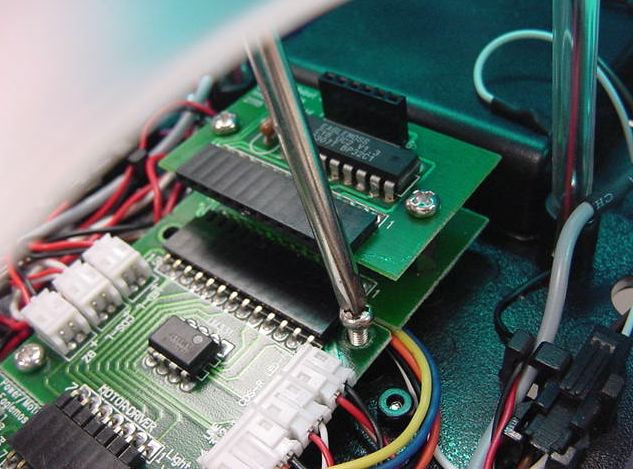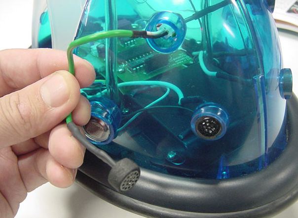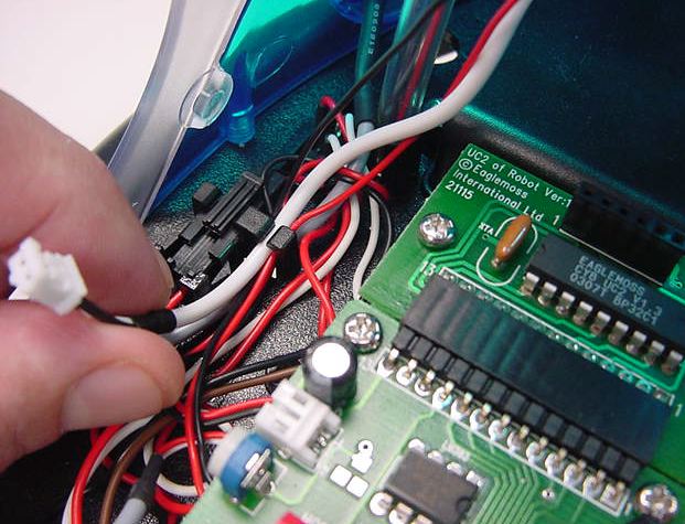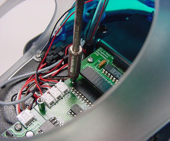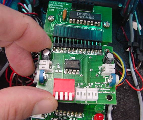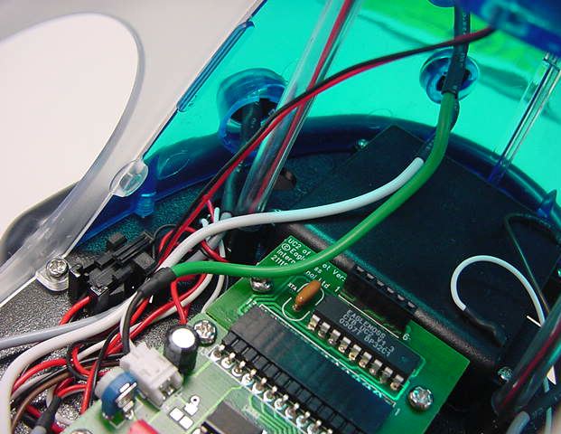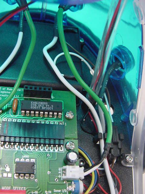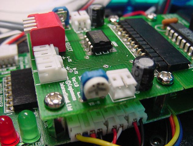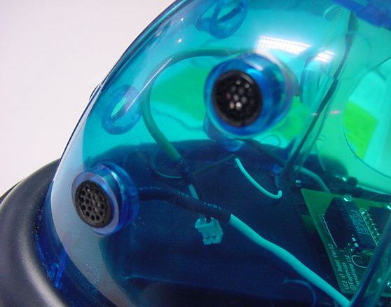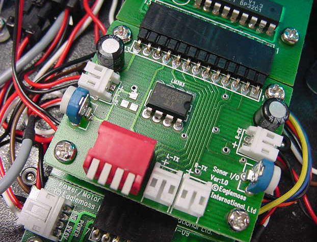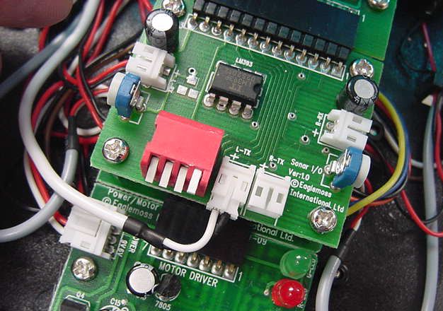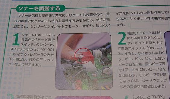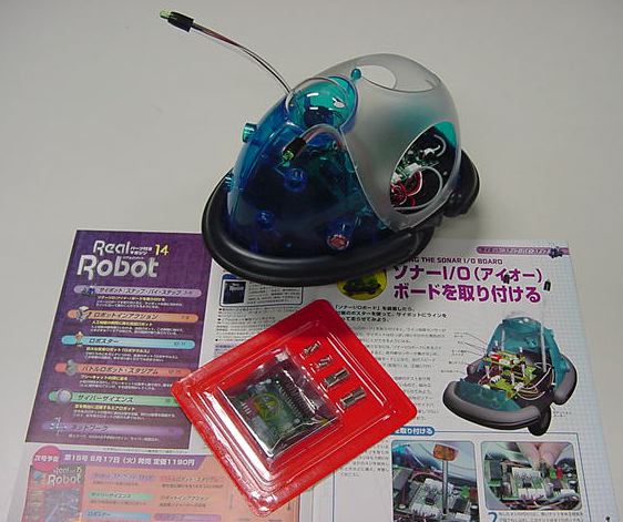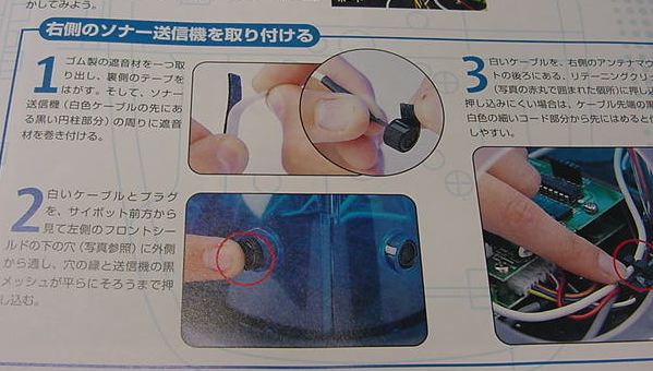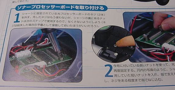 ★ ★ ★ ★ ★ ★ ★ ★ ★ ★ ★ ★ ★ ★ ★ ★ ★ 次は第16号の分です。 超音波センサの残った片側を、送信と受信のペアで取り付けました。 ところが、「センサの感度調整」をしてみると、どうもモーターからのノイズでセンサが 誤動作してしまい(^_^;)、サイボットは発狂したようにグルグル回るだけでなんとも使えない 状態になりました。 これは改めて、別途に対策を講じるいい教材となった模様です。
