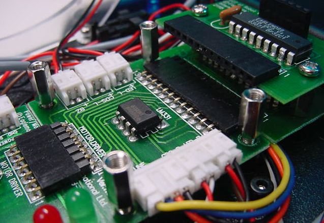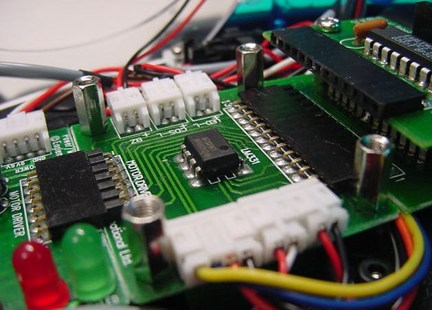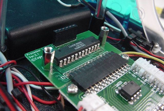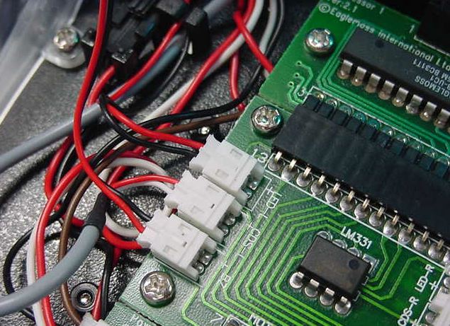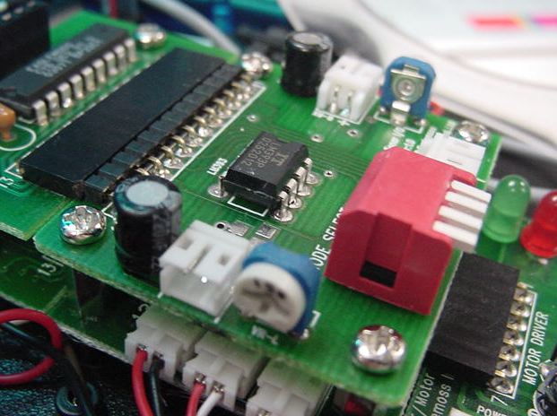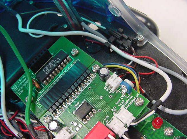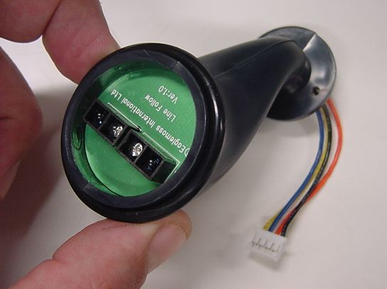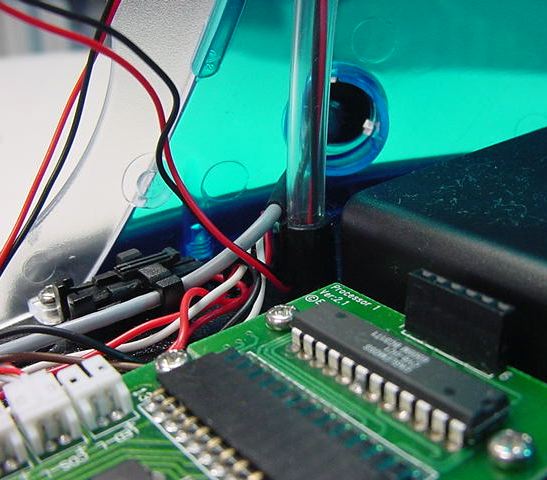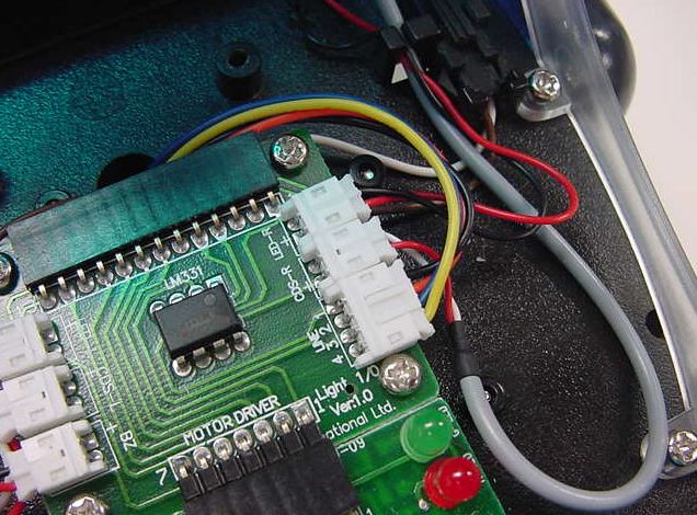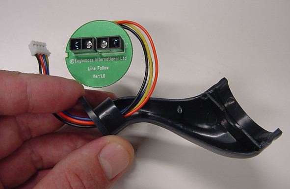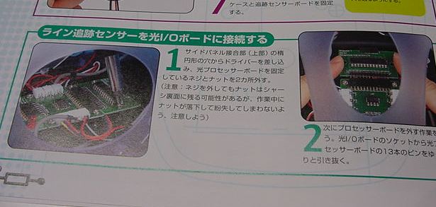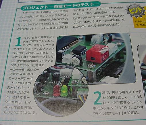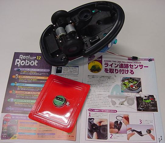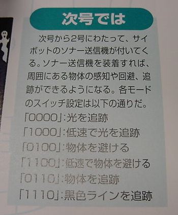 ★ ★ ★ ★ ★ ★ ★ ★ ★ ★ ★ ★ 次は第12号の分です。 前号の「ライン追跡ケース」に、LEDとフォトダイオードのセットになった光センサのペアの載った 基板を取り付け、サイボットの底部に取り付けました。 これで、黒いラインに追従して動くということで、楽しみです。