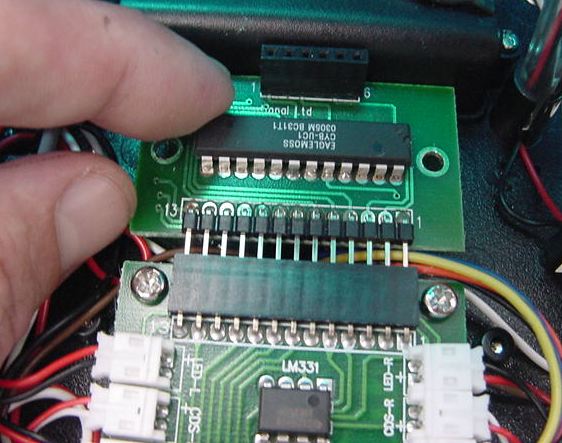 ★ ★ ★ ★ ★ ★ 次は第14号の分です。 2階の基板をさらに追加して、これで動作モード設定のDIPスイッチが付いたので、 これまでのCdSの「光追跡モード」だけでなく、前に付けた光センサによる路面追従が できるようになりました。 付属してきた、黒いラインのシートの上を、驚くほどの遅さで(^_^;)、サイボットは ちゃんと追従して進んでいきました。