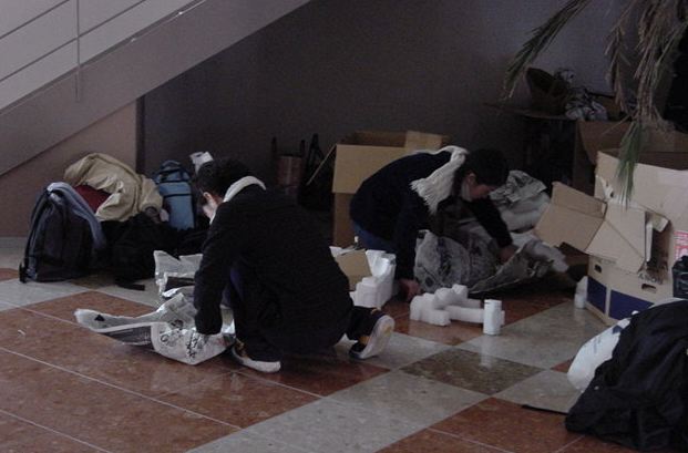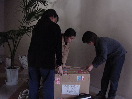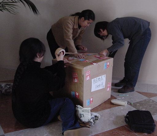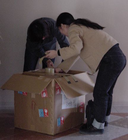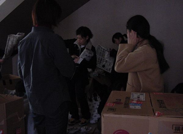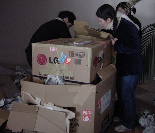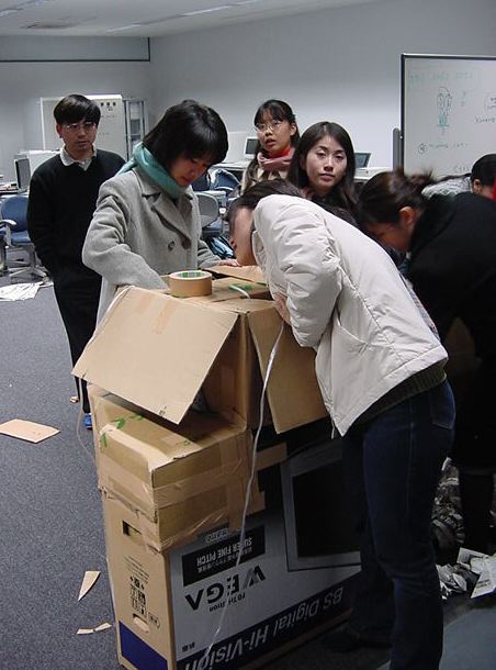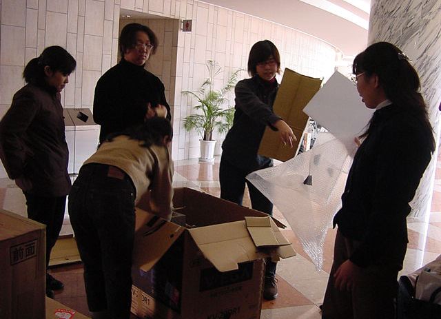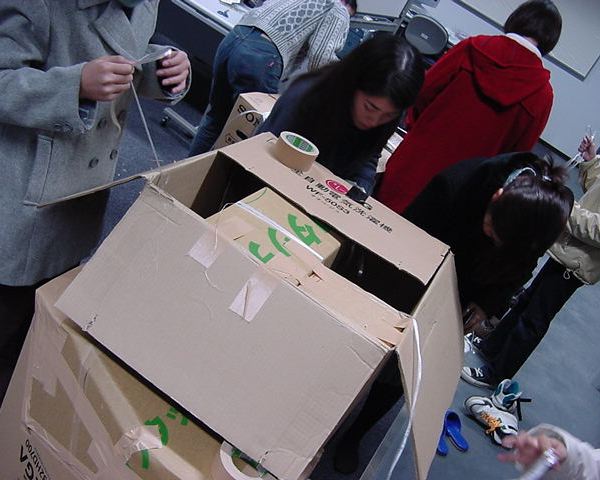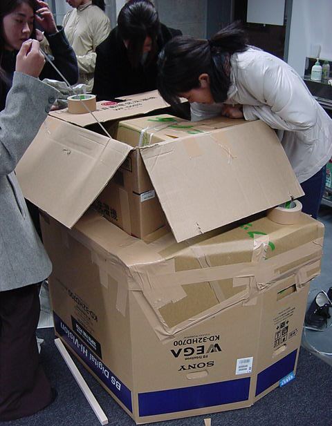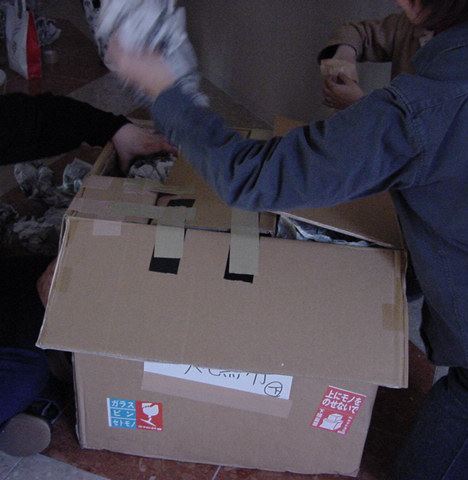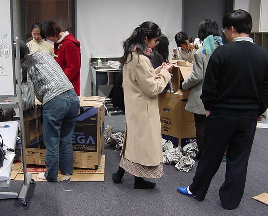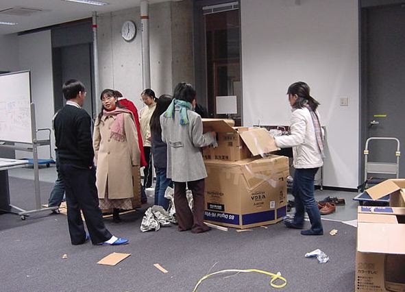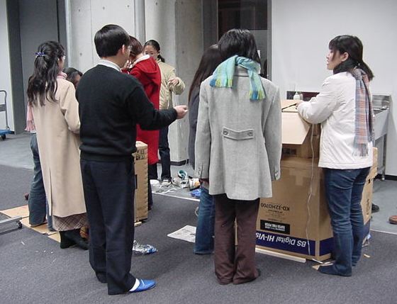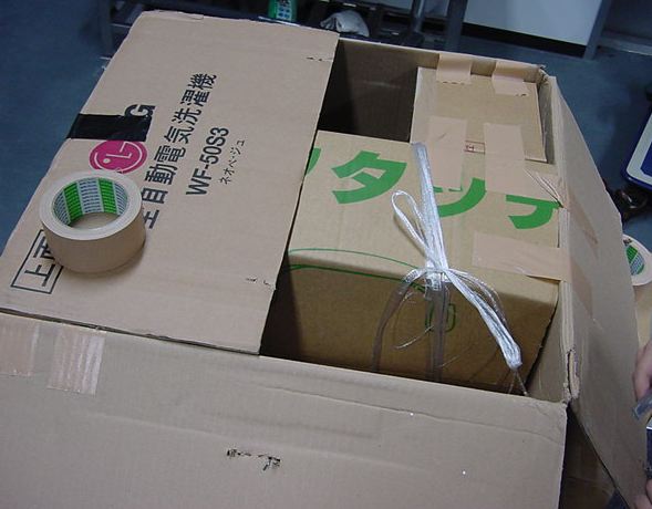 まずは、公演のためのインスタ等の機材をCAM室で梱包です。 前日に皆んなで集めてきた段ボールに美しく(^_^;)梱包しました。