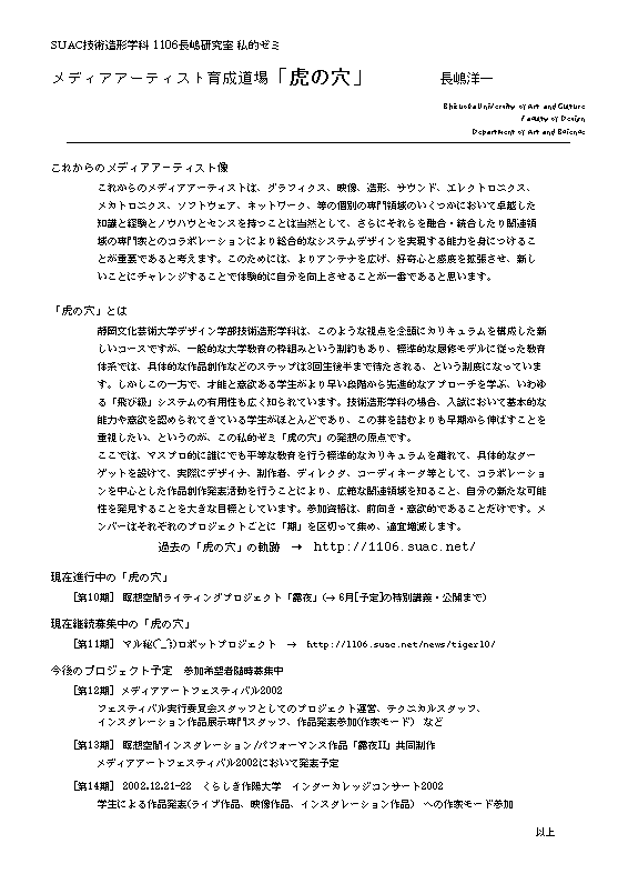 - 5月ないし6月に計画している長嶋の「現代芸術論」特別講義(瞑想空間に笙演奏家の