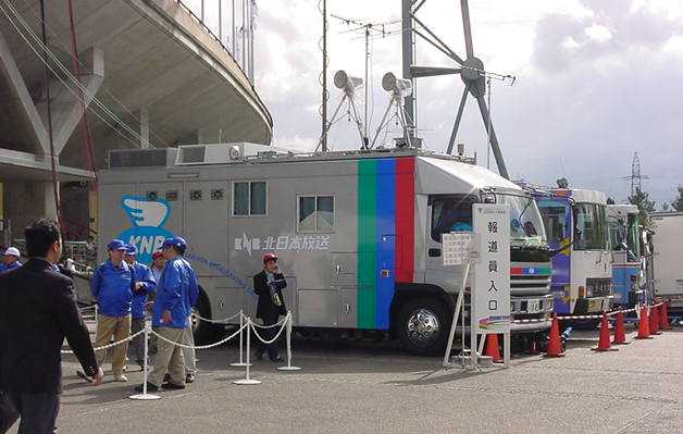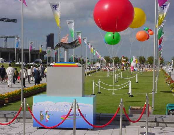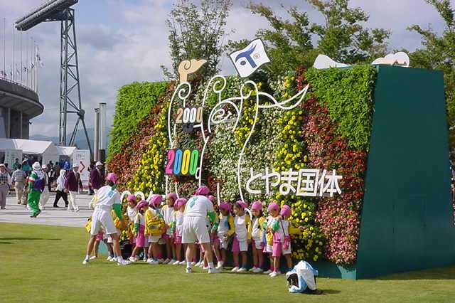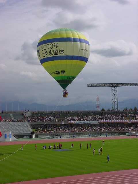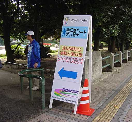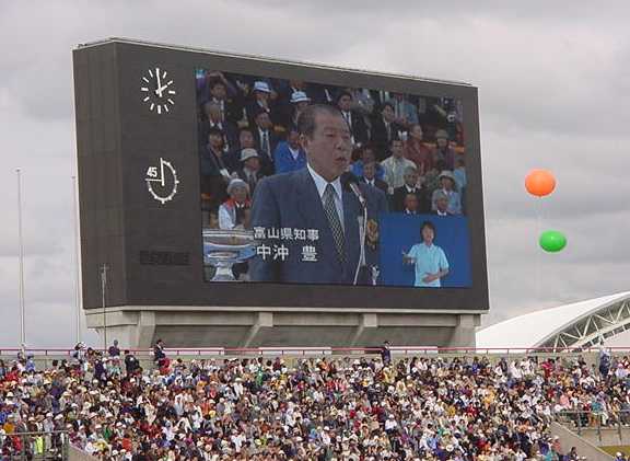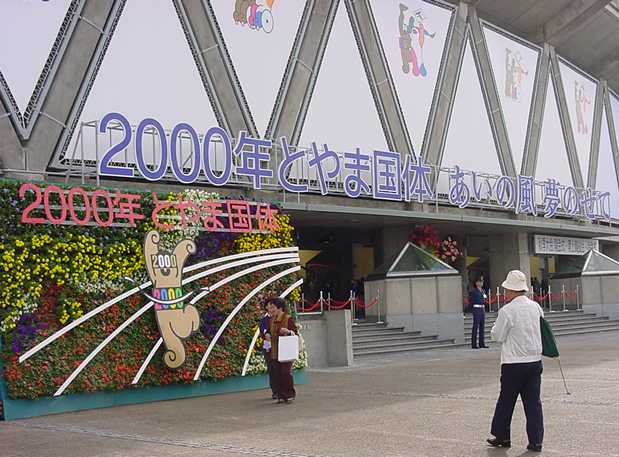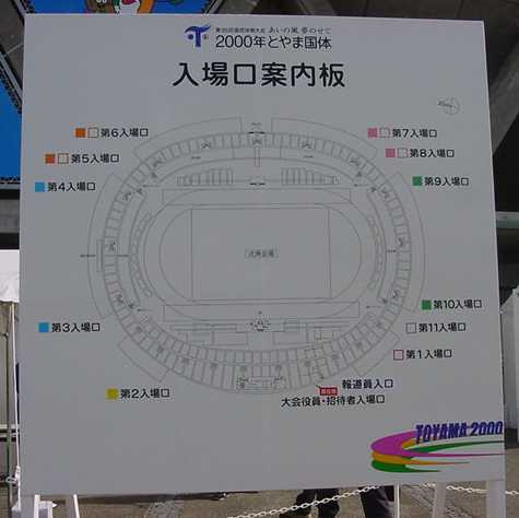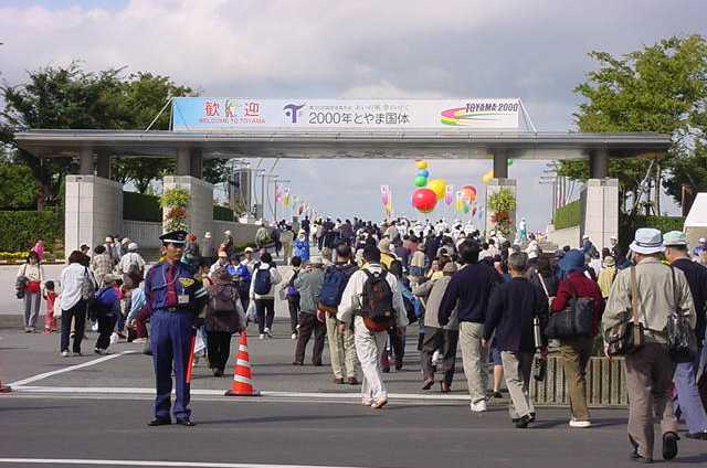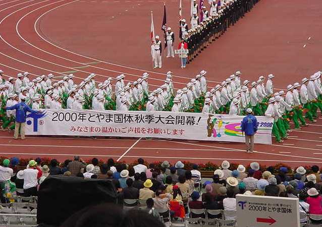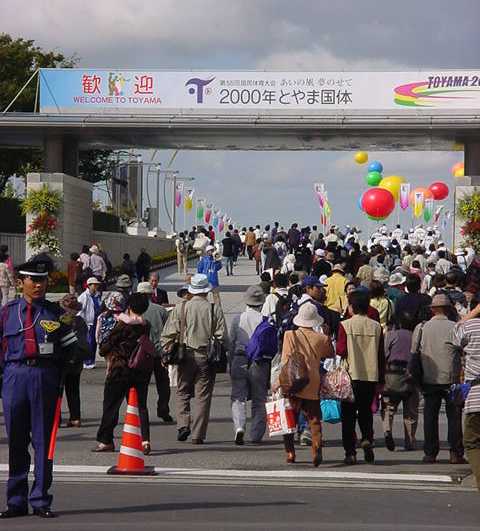 富山国体秋季大会開会式視察2000年10月 長嶋洋一2003静岡国体式典プロデュースを静岡県から委嘱された静岡文化芸術大学 国体プロジェクトの一員として、2000富山国体秋季大会開会式(富山市)に 視察に行きました。後期が始まったので、浜松から講義のために神戸に 行き、大阪から特急「サンダーバード」で前泊の金沢に行きました。 前回の高岡市の夏期大会では、金沢日航ホテルを朝5:50に出るという 早朝強行軍、さらに生憎の雨模様で雨合羽でズブ濡れになりましたが、 今回は朝方に雨が降ったらしいものの、8:00にホテルを出るとまずまずの 好天で、なんとか雨にはなりませんでした。