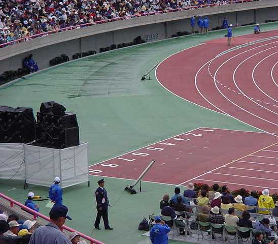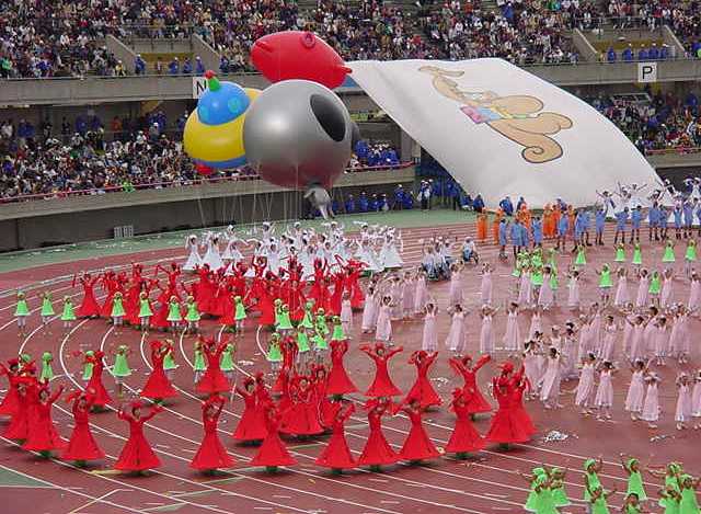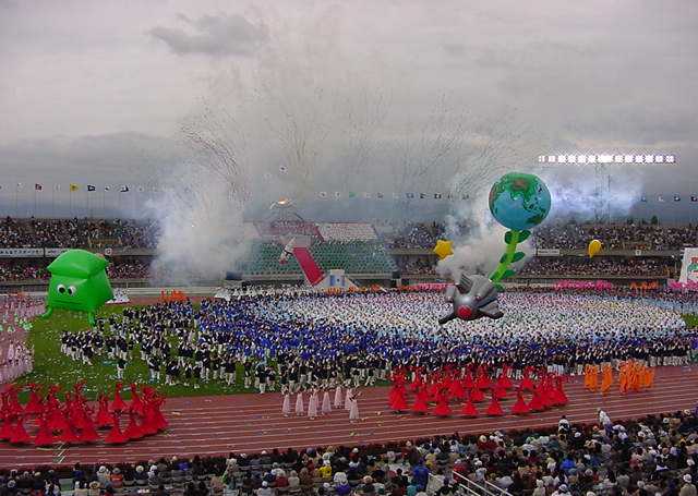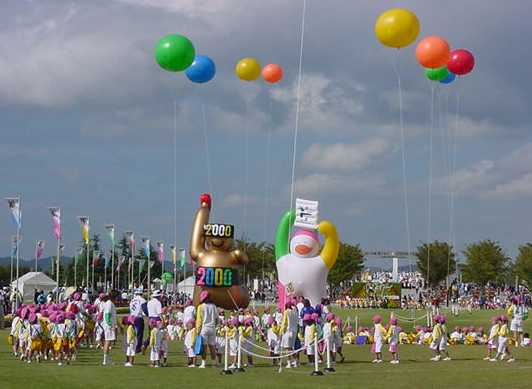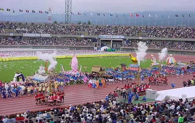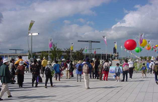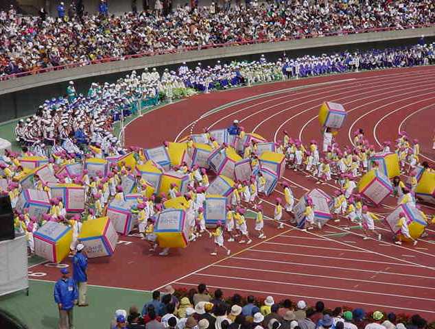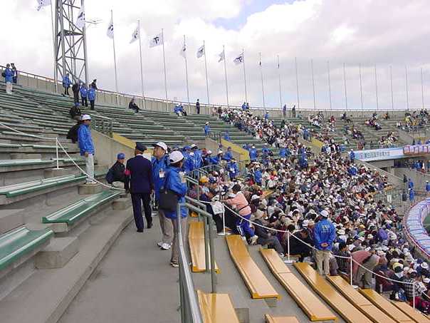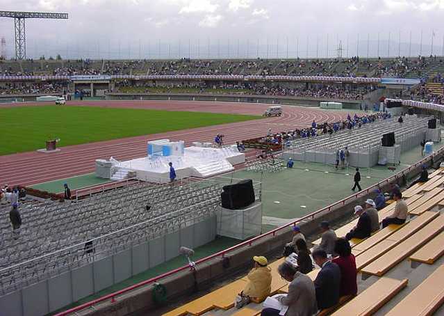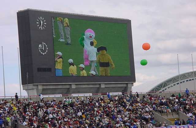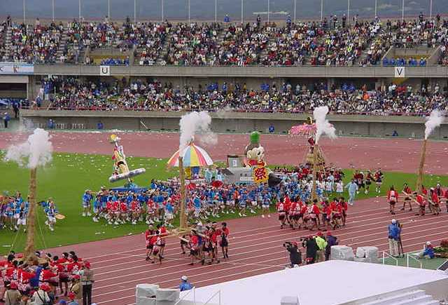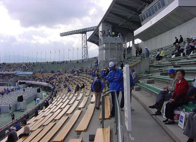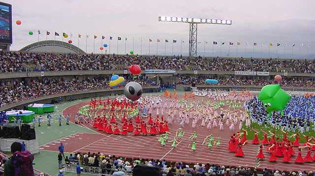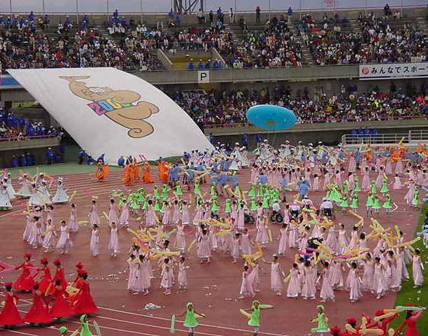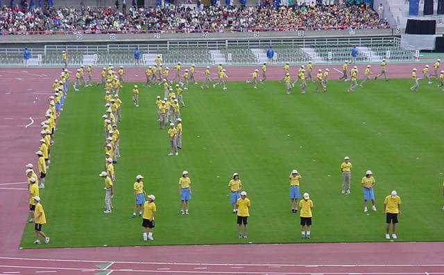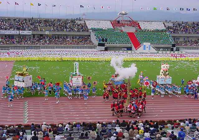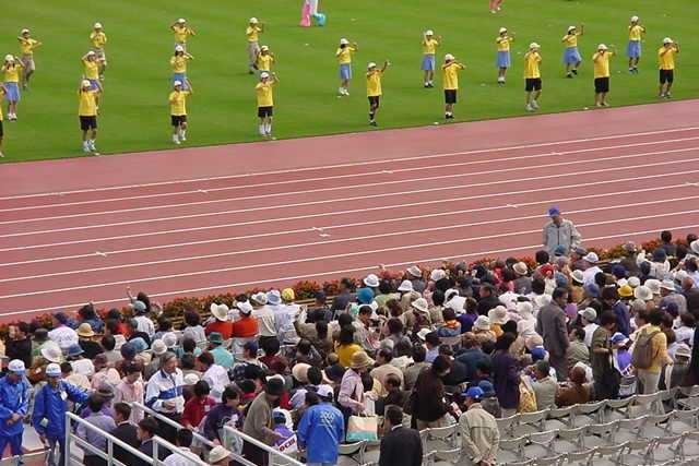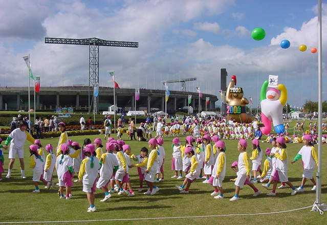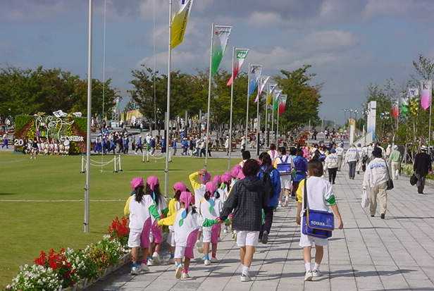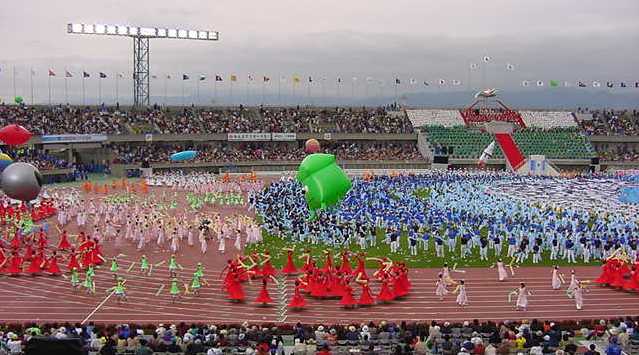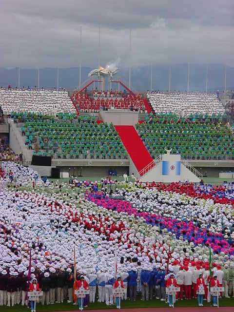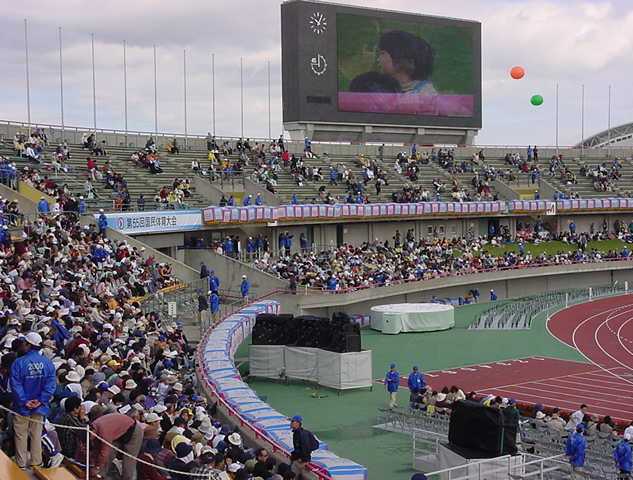開会式会場で、スタジアムの席に着くまのでの風景です。 売店とか記念写真用のオブジェ、アトラクションのための 多くの子供たちなど、まぁ国体開会式の風景です。(^_^;)