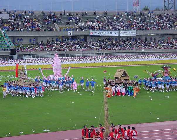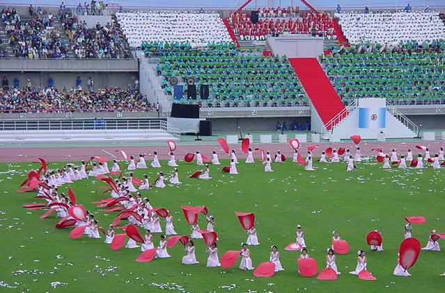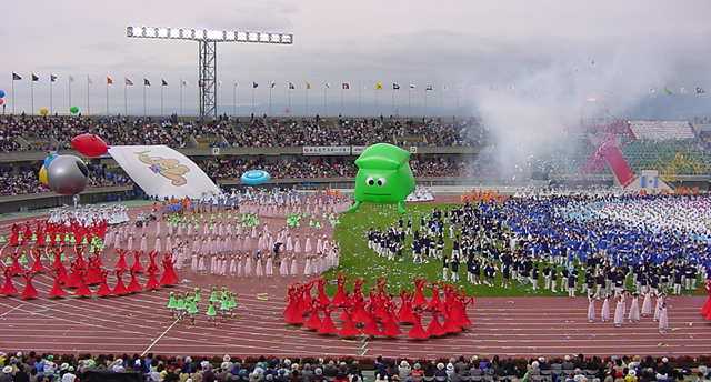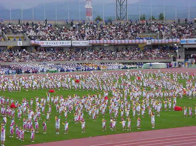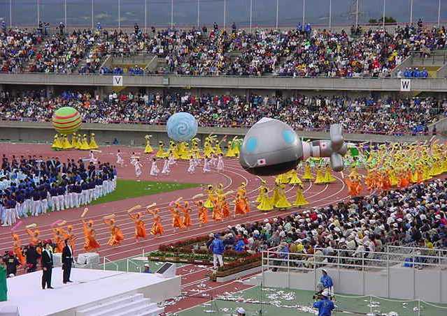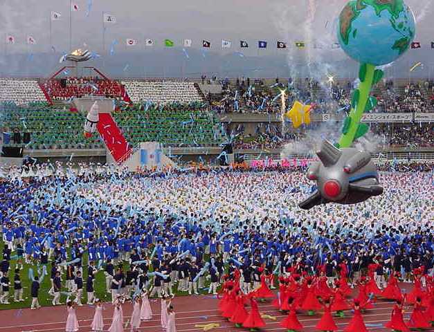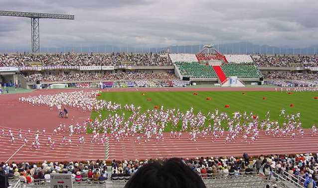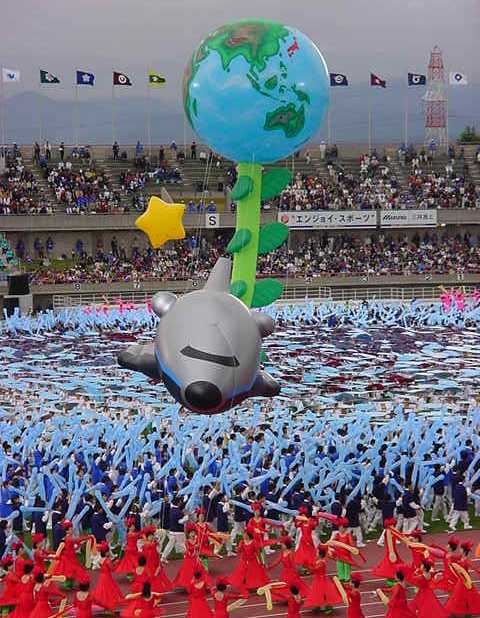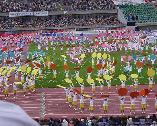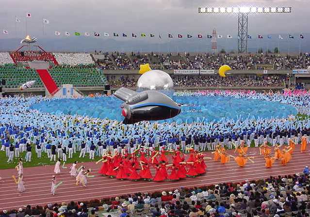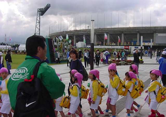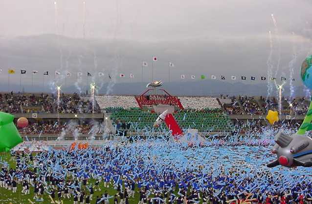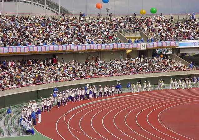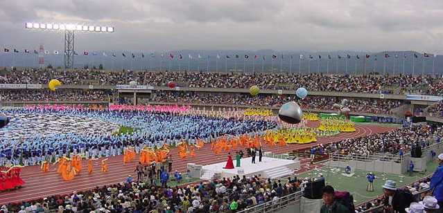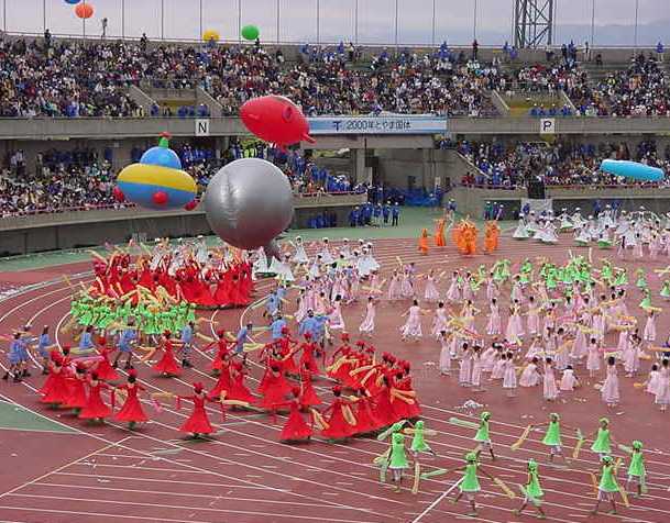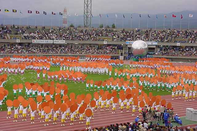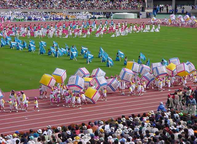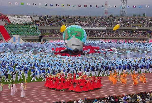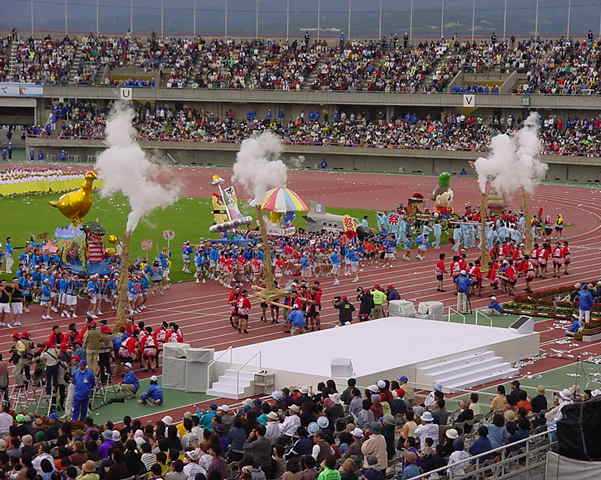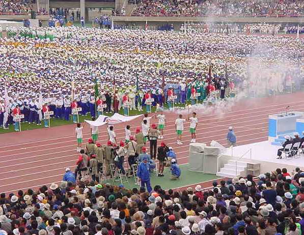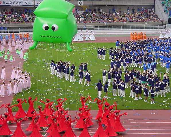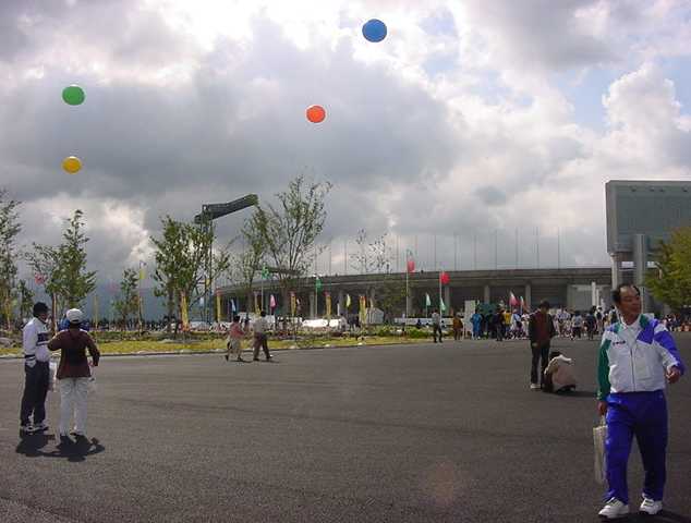 開会式会場で、スタジアムの席に着くまのでの風景です。 売店とか記念写真用のオブジェ、アトラクションのための 多くの子供たちなど、まぁ国体開会式の風景です。(^_^;)