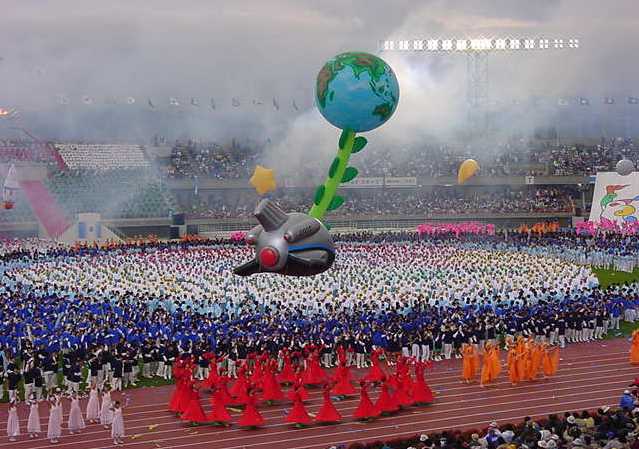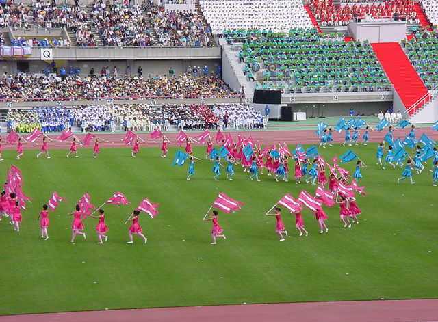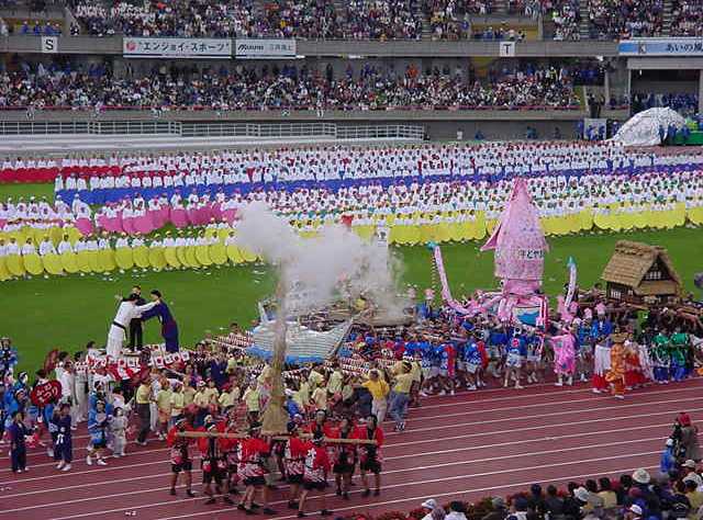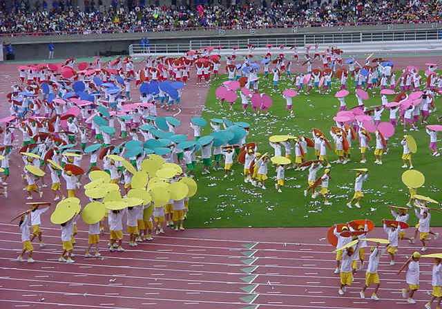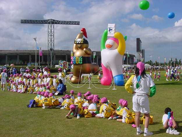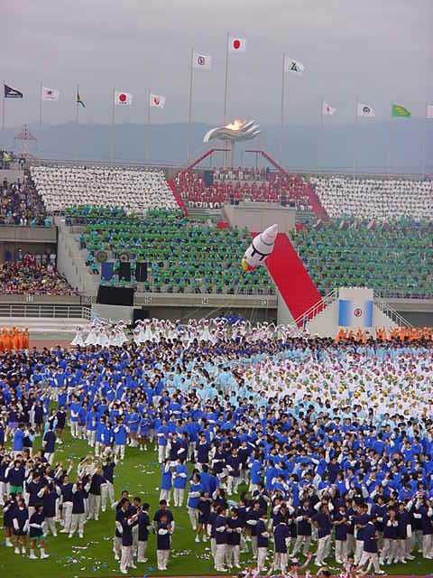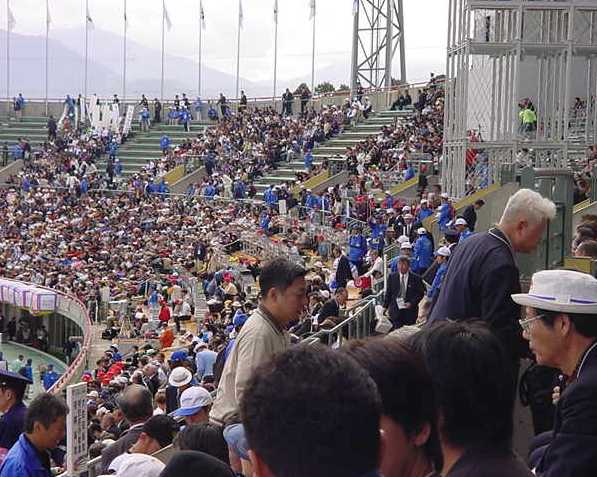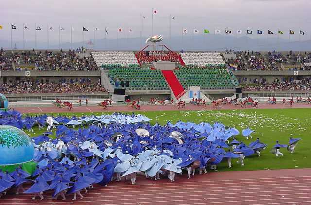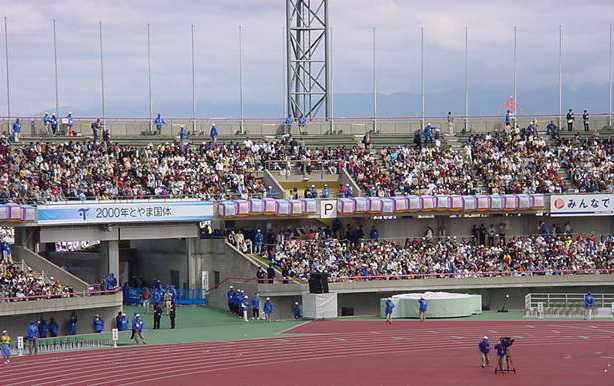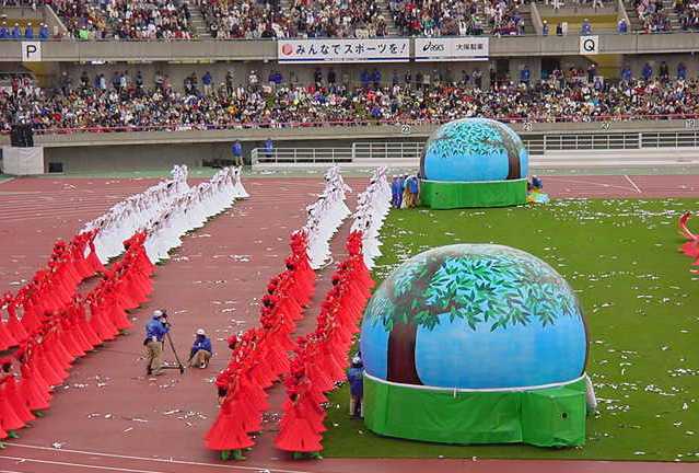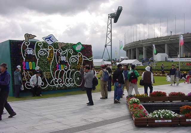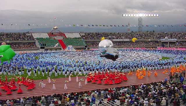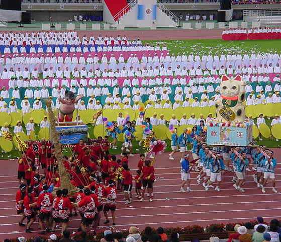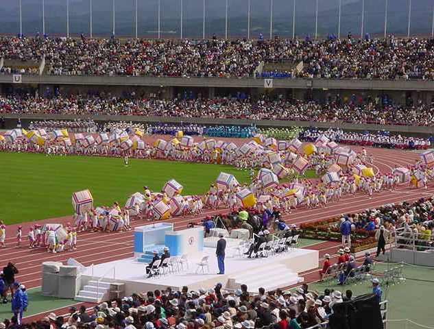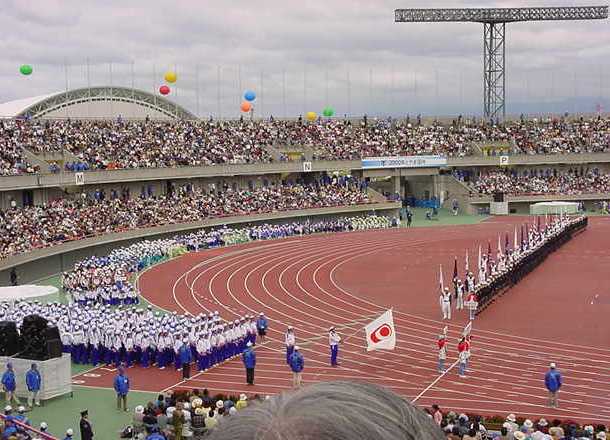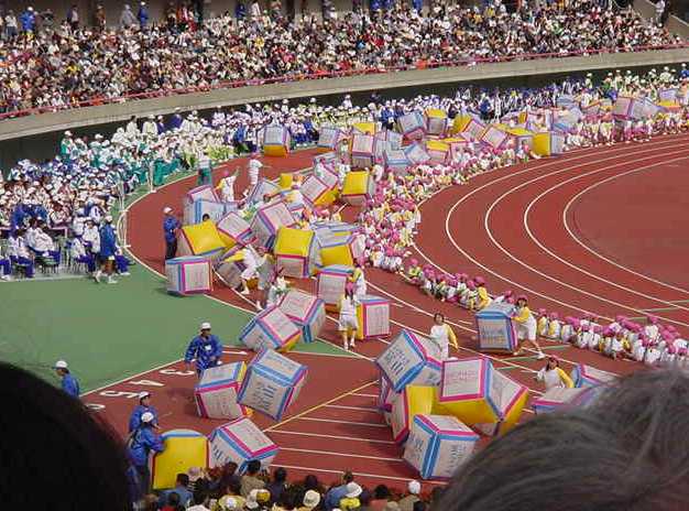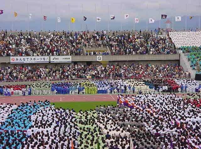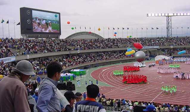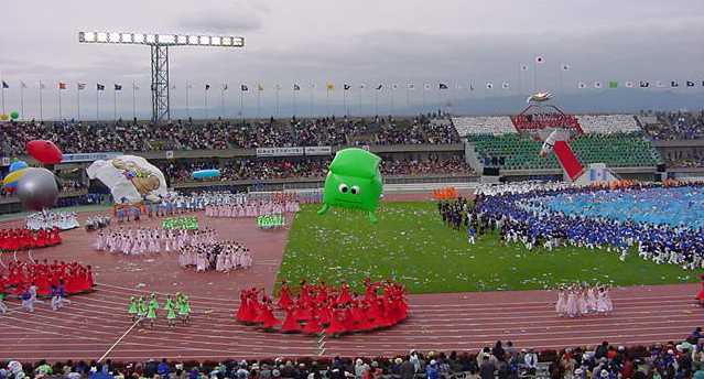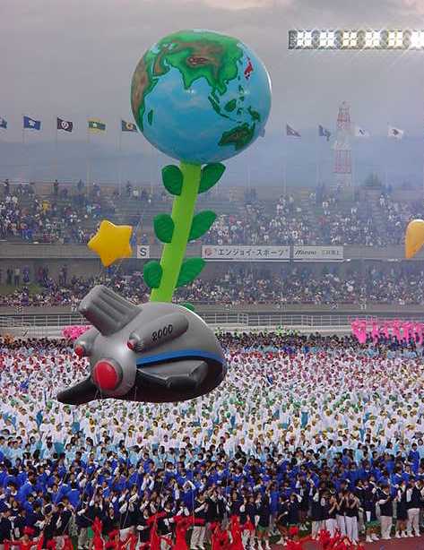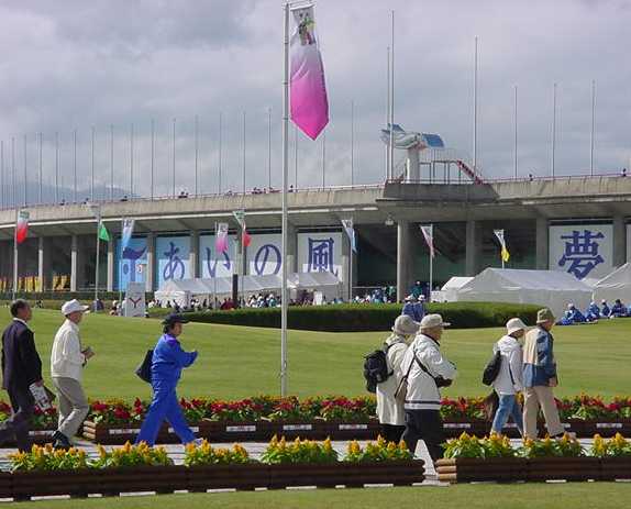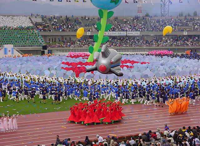開会式会場で、スタジアムの席に着くまのでの風景です。 売店とか記念写真用のオブジェ、アトラクションのための 多くの子供たちなど、まぁ国体開会式の風景です。(^_^;)