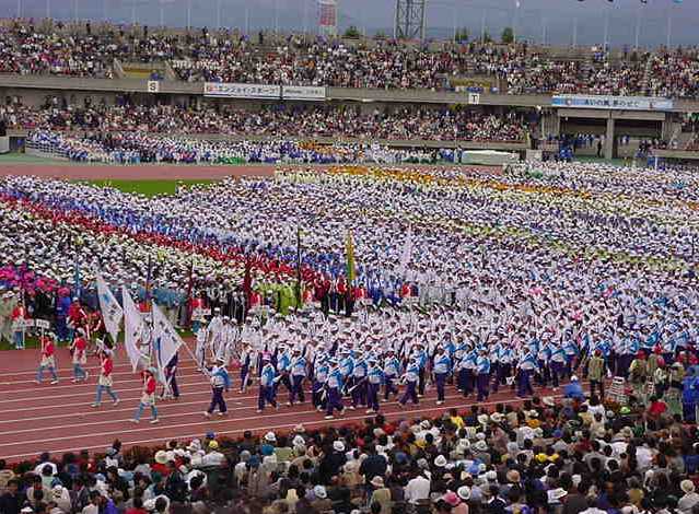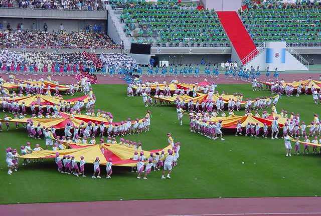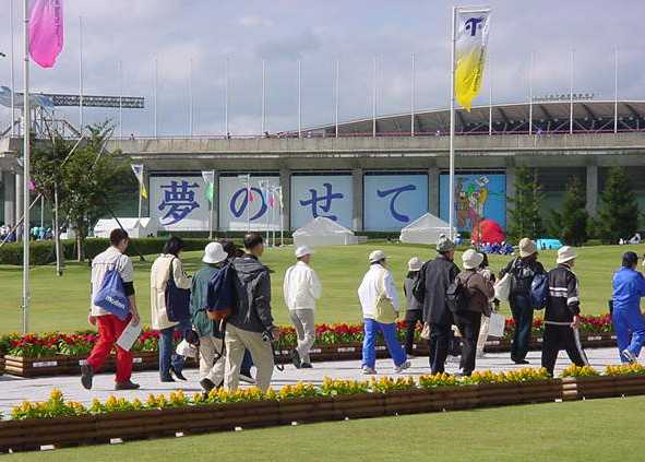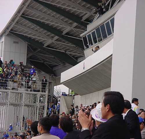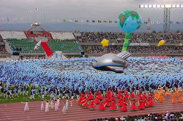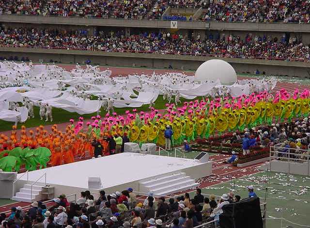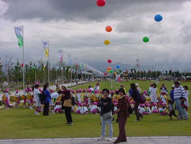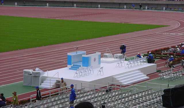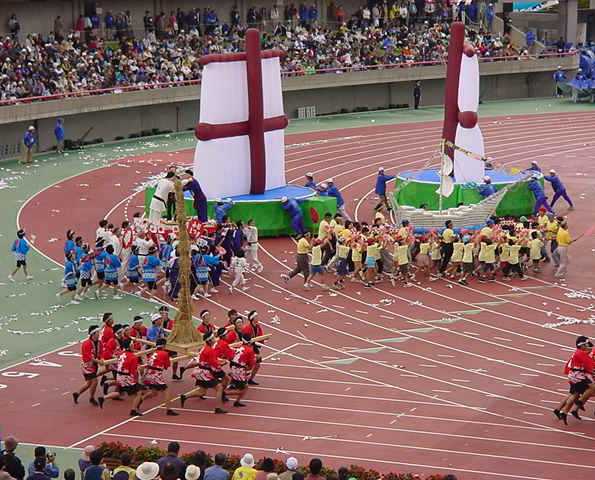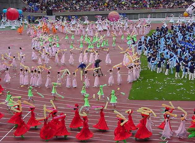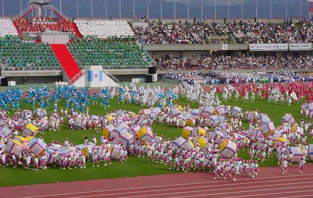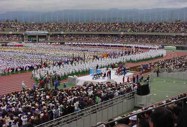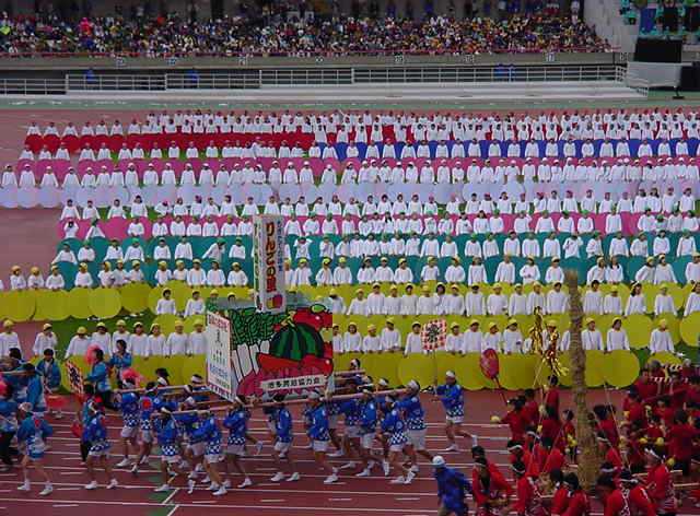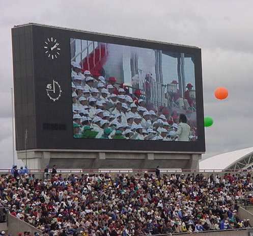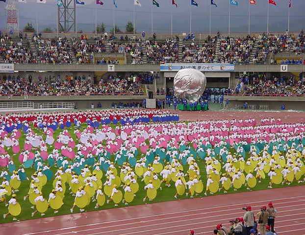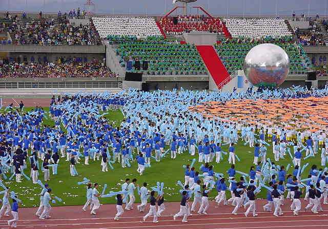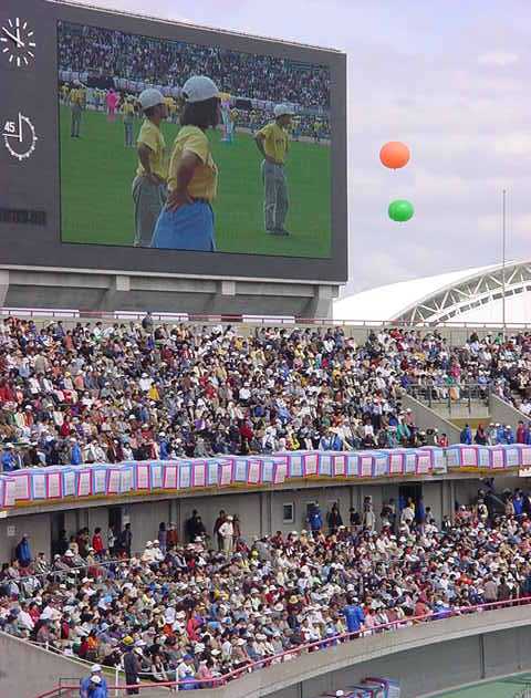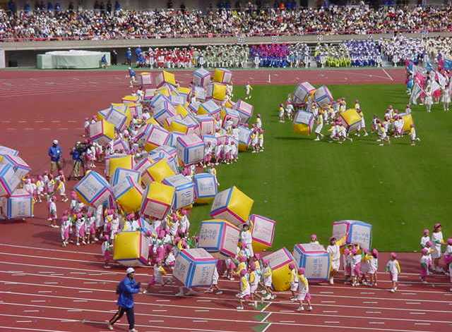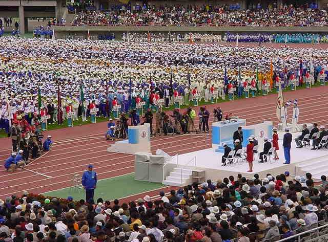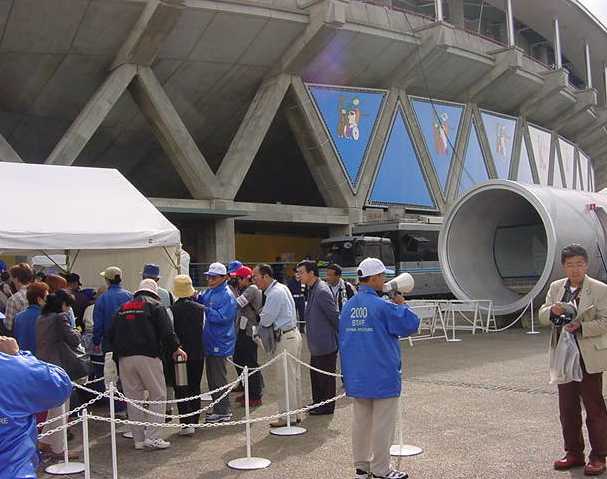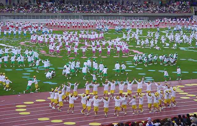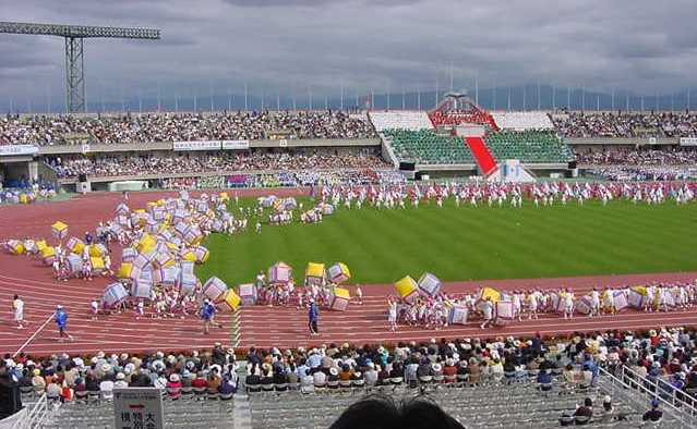 開会式会場で、スタジアムの席に着くまのでの風景です。 売店とか記念写真用のオブジェ、アトラクションのための 多くの子供たちなど、まぁ国体開会式の風景です。(^_^;)