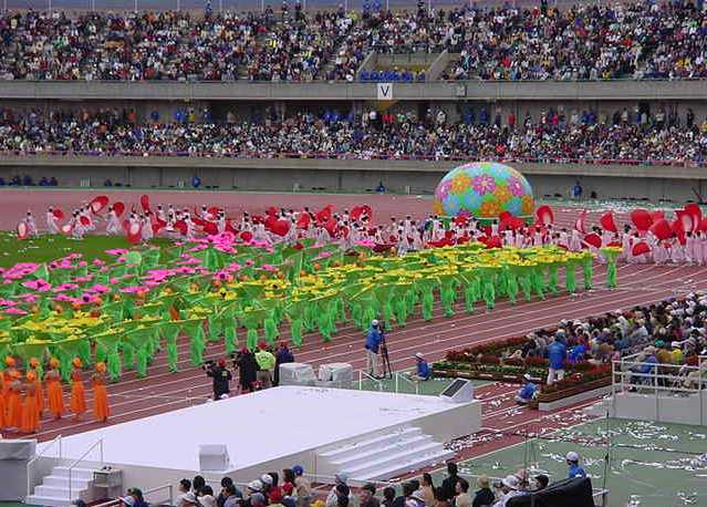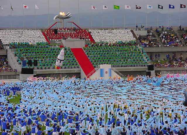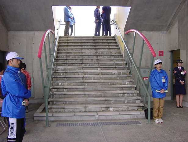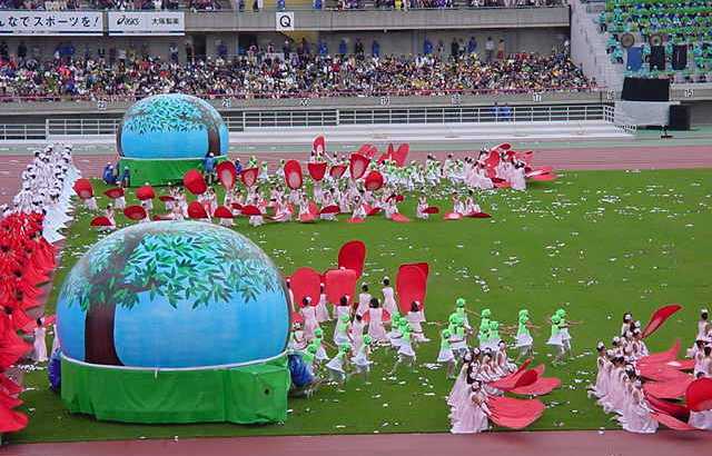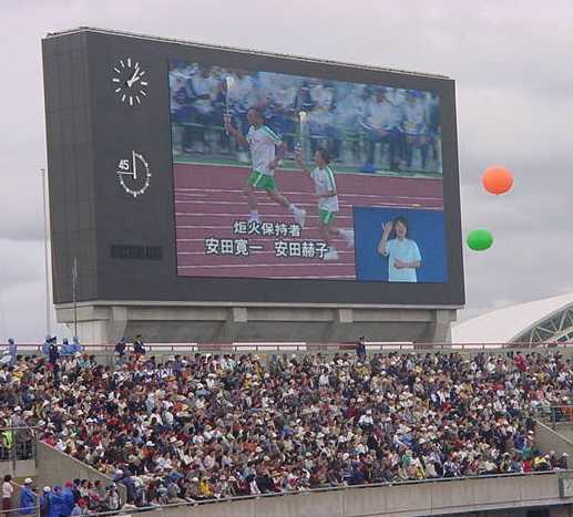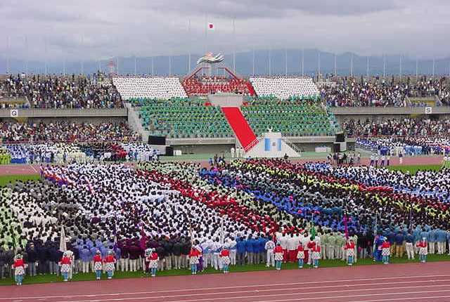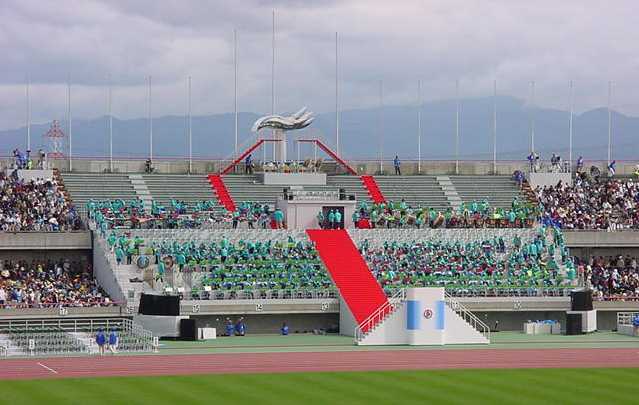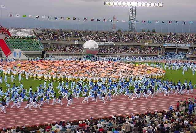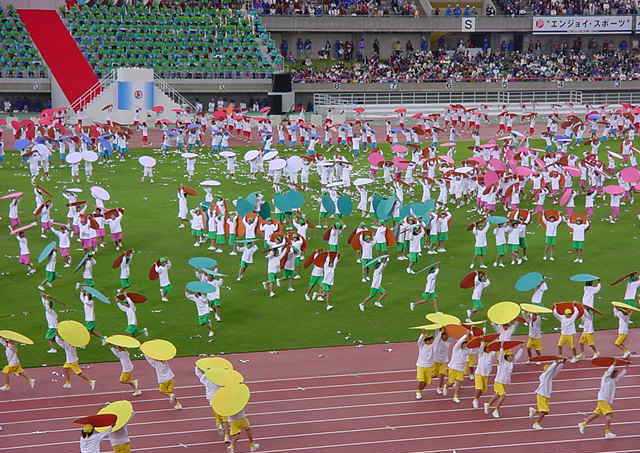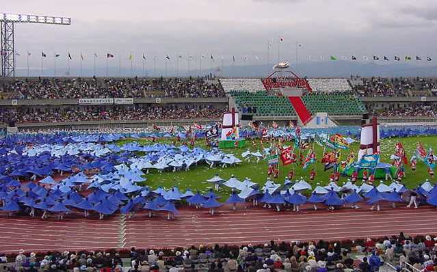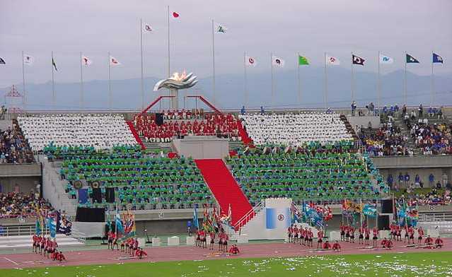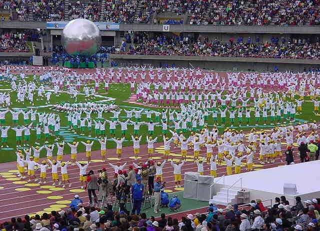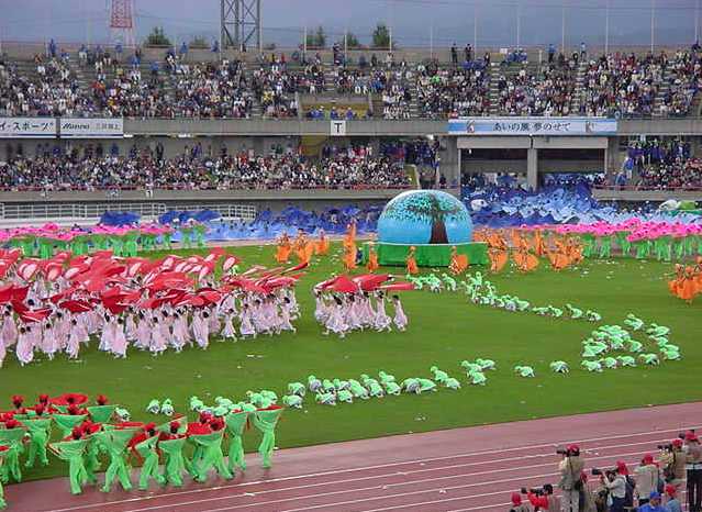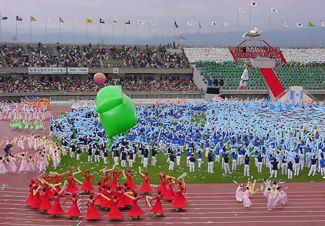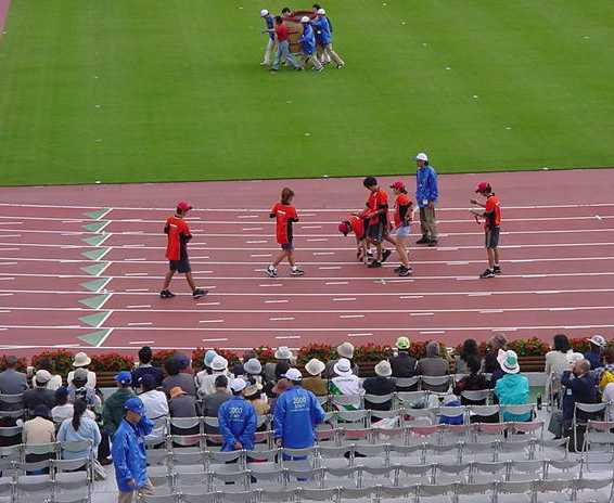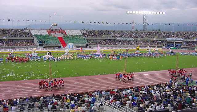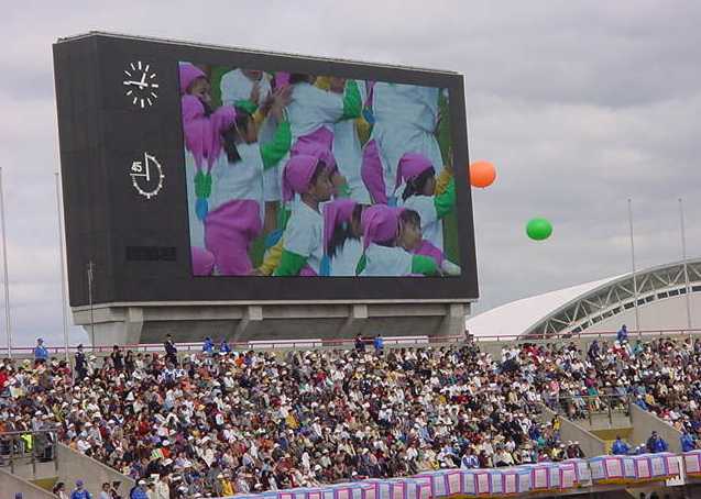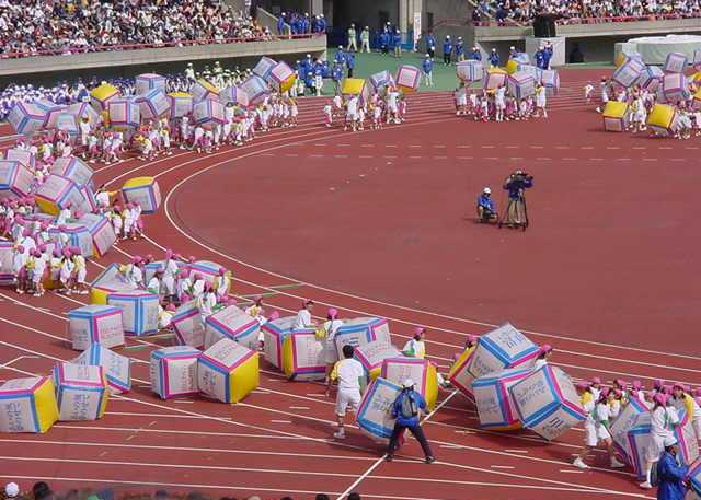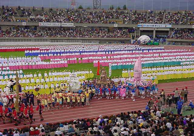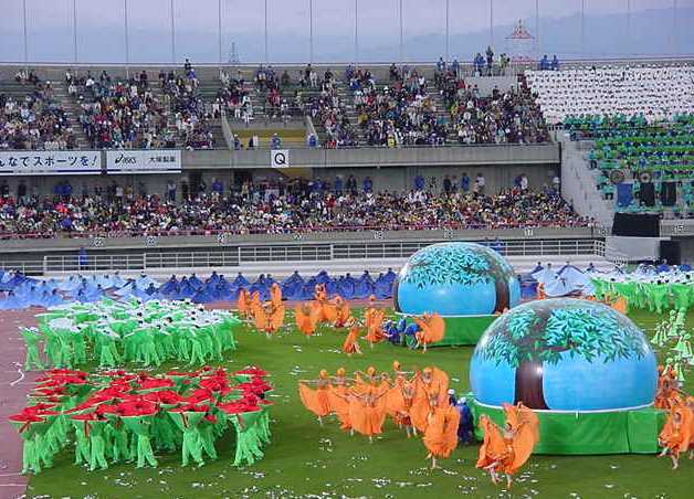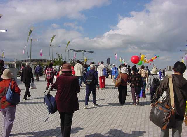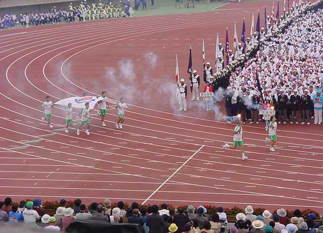 開会式会場で、スタジアムの席に着くまのでの風景です。 売店とか記念写真用のオブジェ、アトラクションのための 多くの子供たちなど、まぁ国体開会式の風景です。(^_^;)