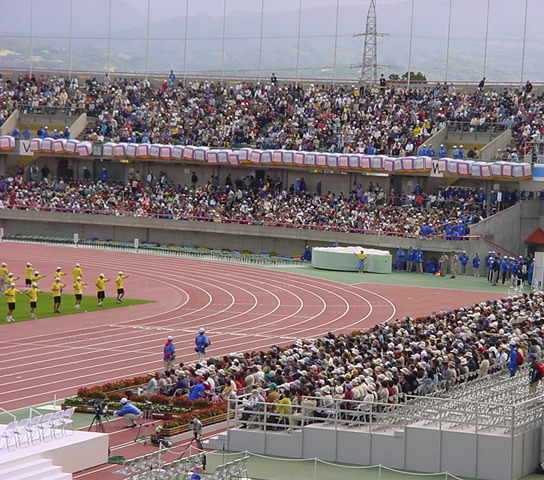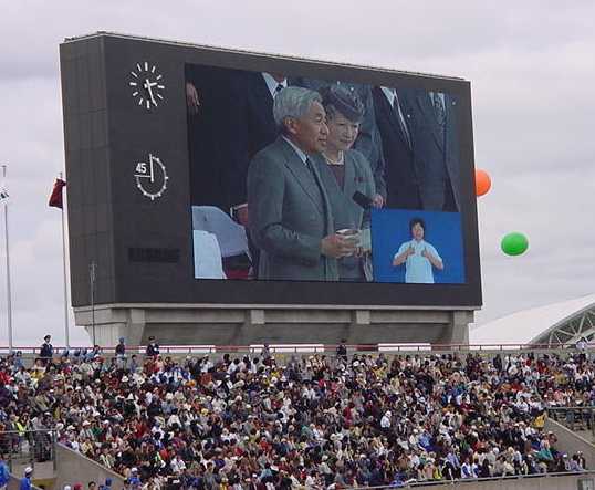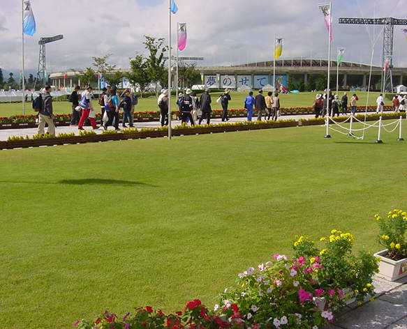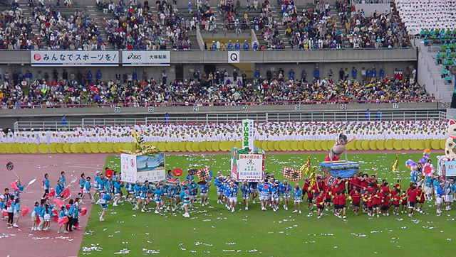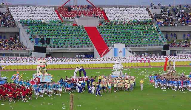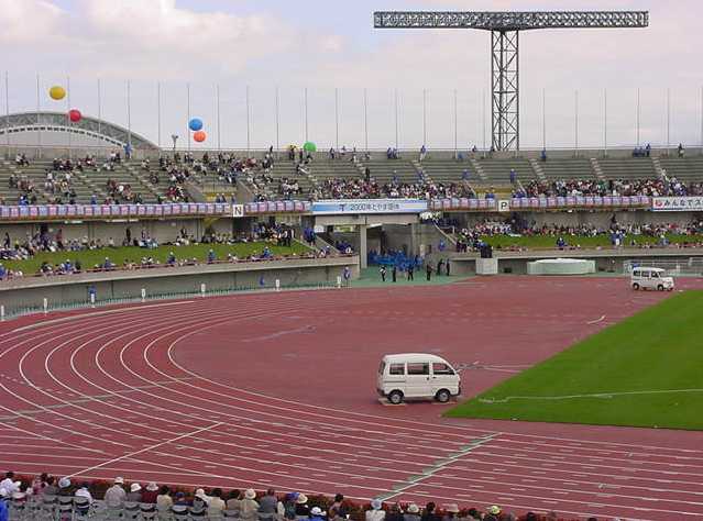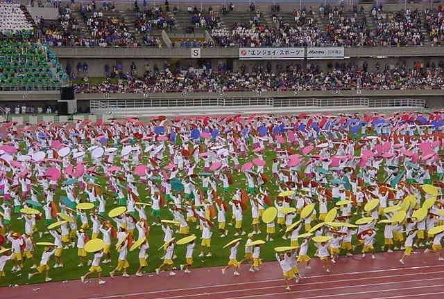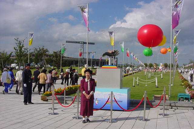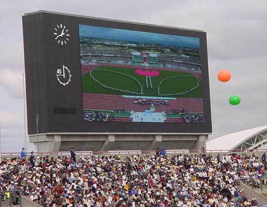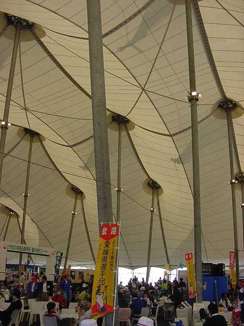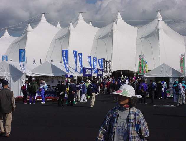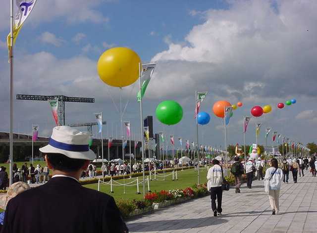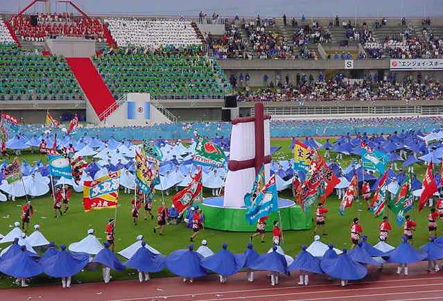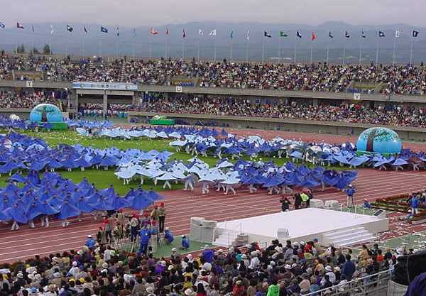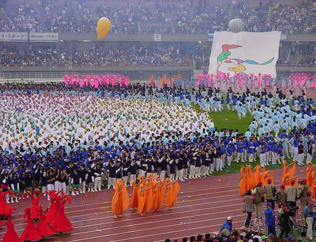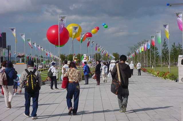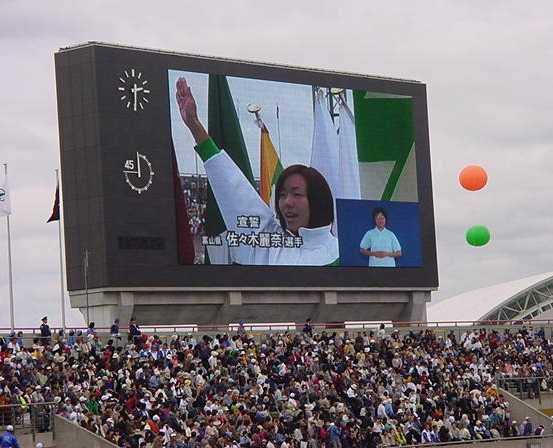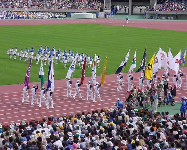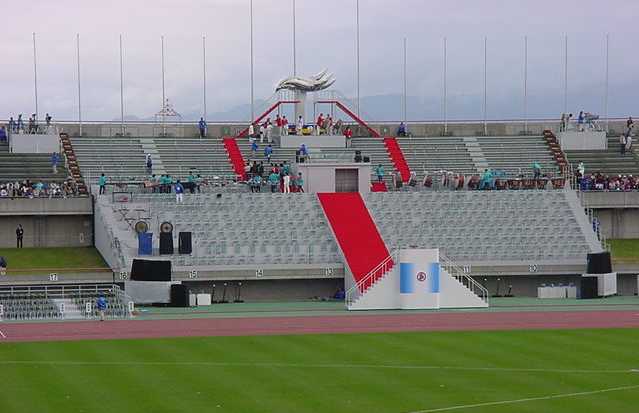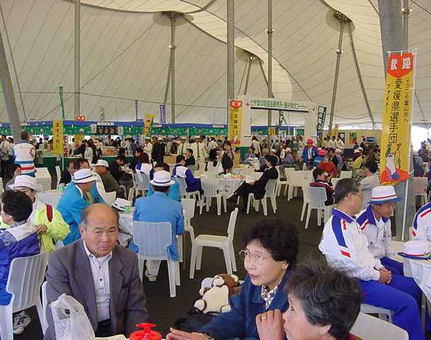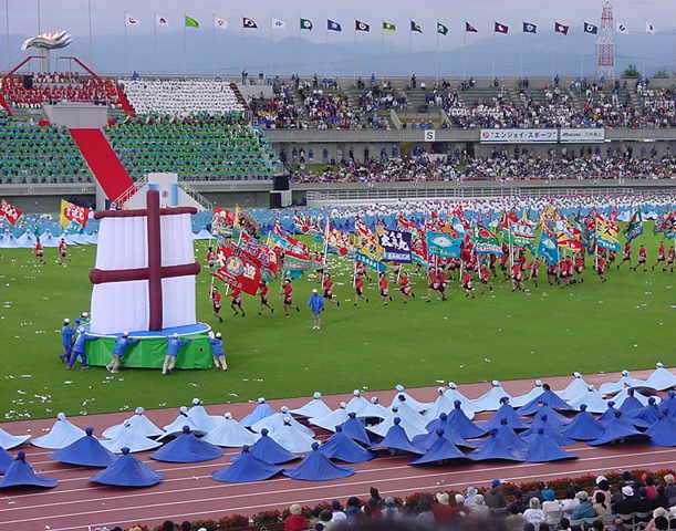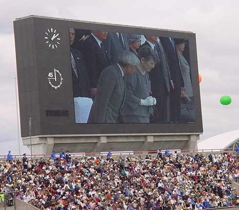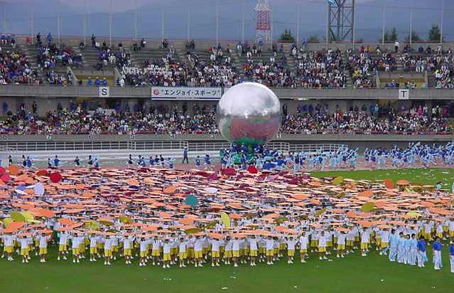 開会式会場で、スタジアムの席に着くまのでの風景です。 売店とか記念写真用のオブジェ、アトラクションのための 多くの子供たちなど、まぁ国体開会式の風景です。(^_^;)