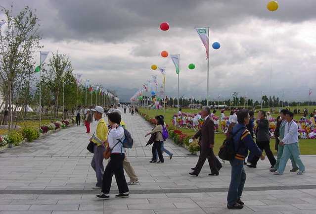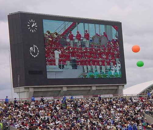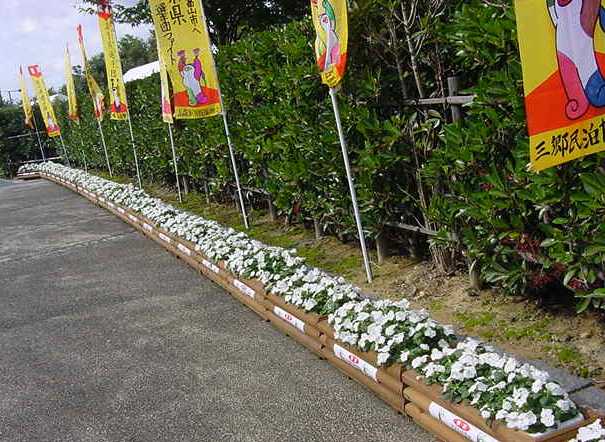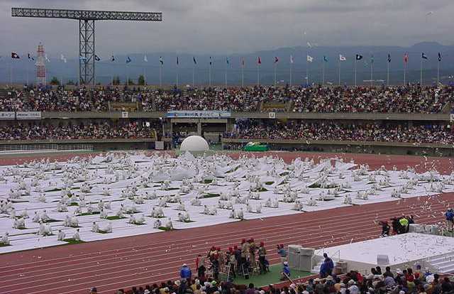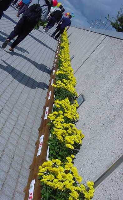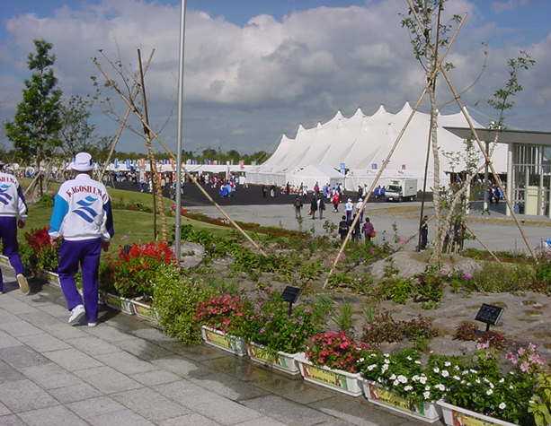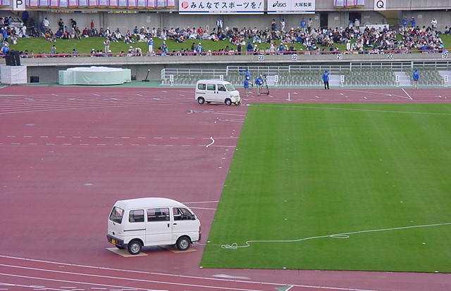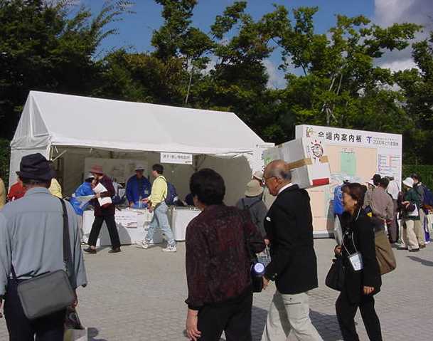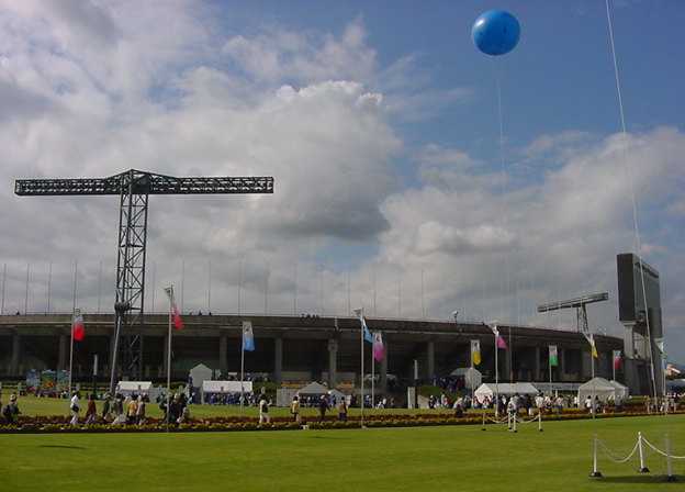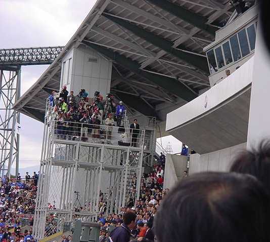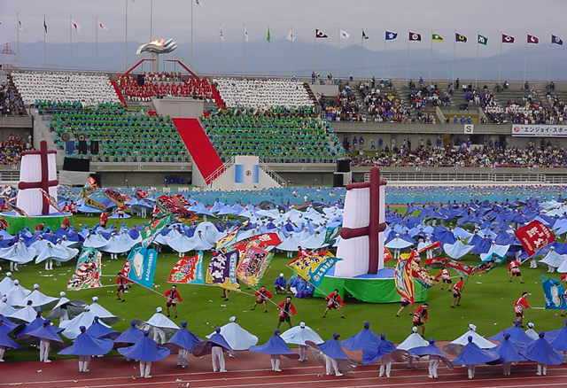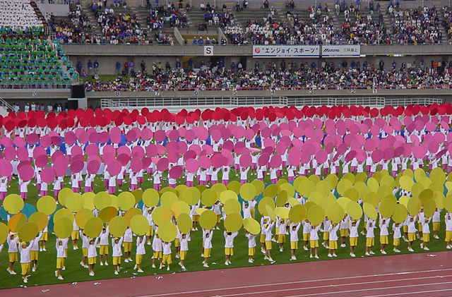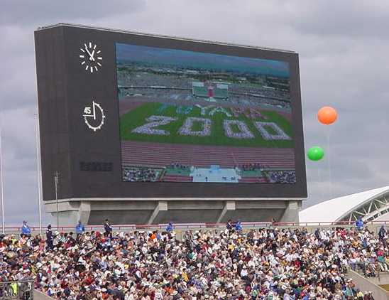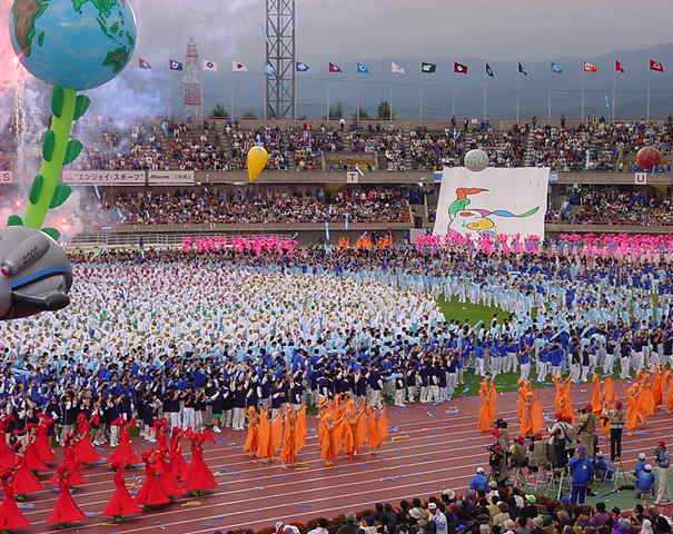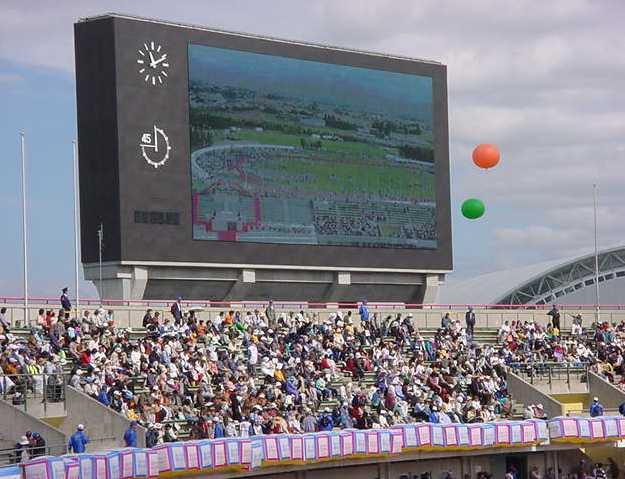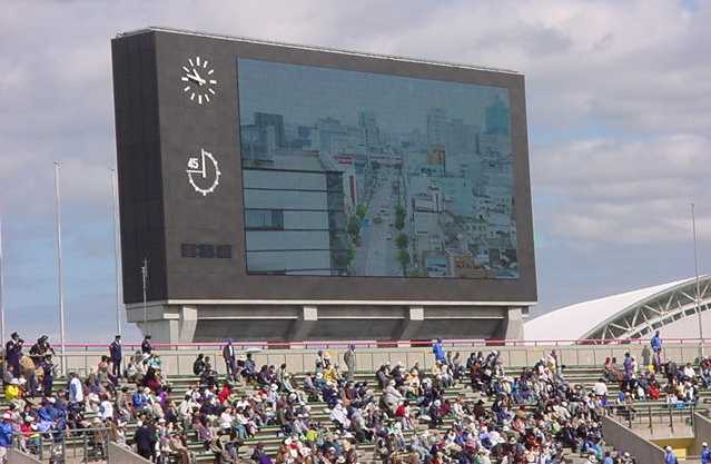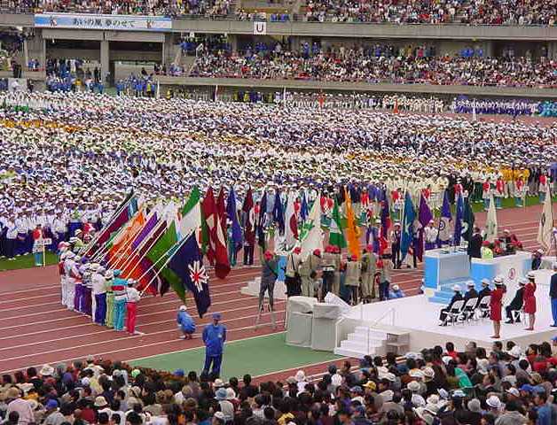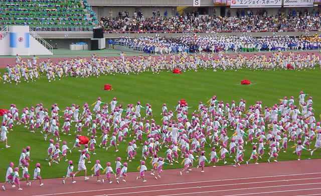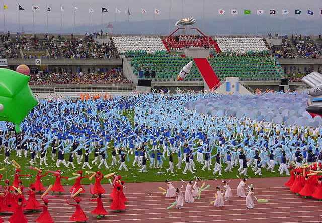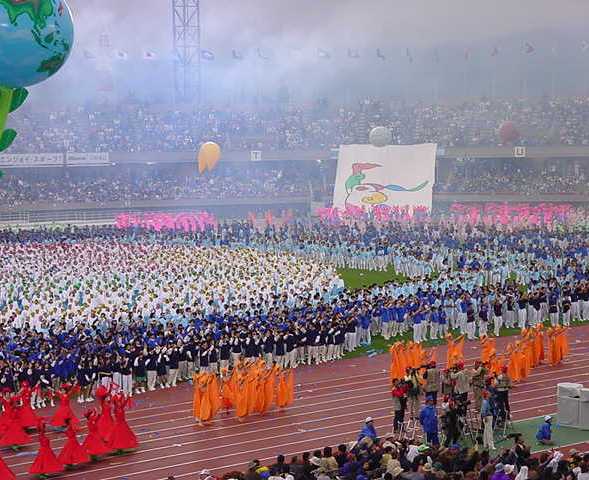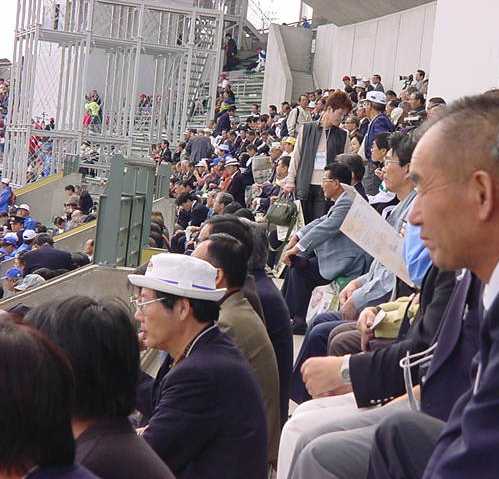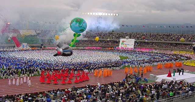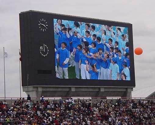 開会式会場で、スタジアムの席に着くまのでの風景です。 売店とか記念写真用のオブジェ、アトラクションのための 多くの子供たちなど、まぁ国体開会式の風景です。(^_^;)