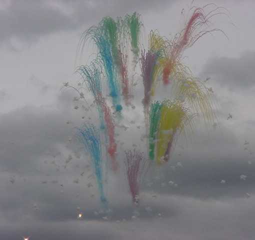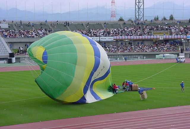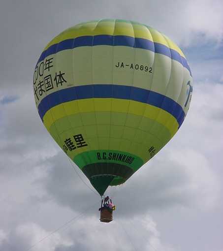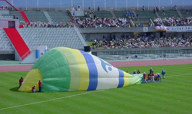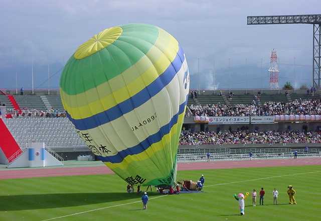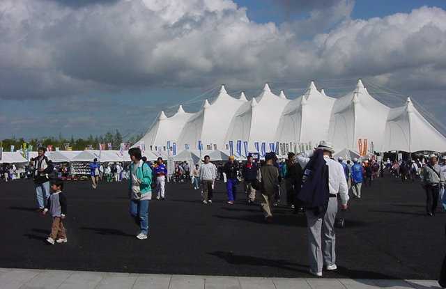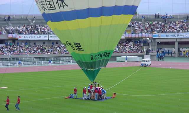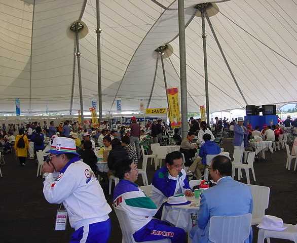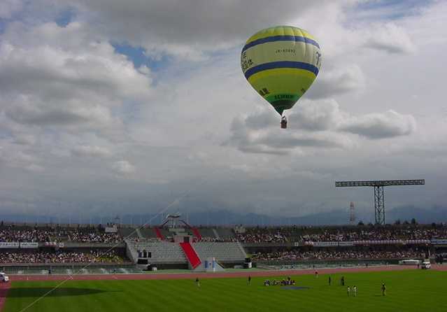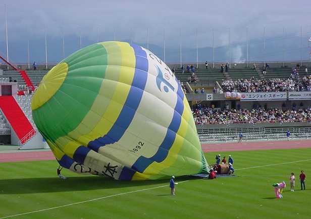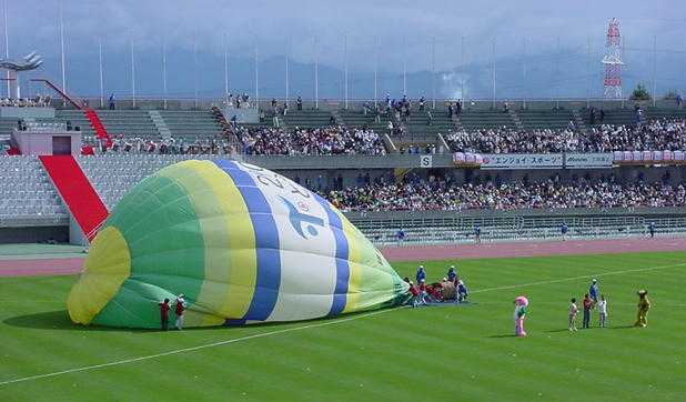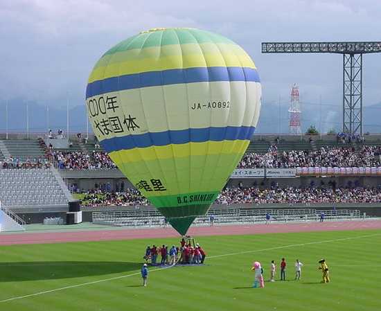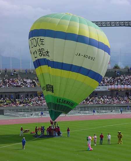 他の先生がたは売店でお茶とかしていたのですが、写真を 撮るうちにはぐれてしまって10:10には観覧席に着いて しまったので、ボーーーーーッと10:45まで一人で待ちました。 そして、午前の時間つぶし、もとい(^_^;)、アトラクション が始まりました。まだ「式典」ではありません。 熱気球、スポーツカイト、ウェーブと拍手と体操など があり、お昼のお弁当タイムの12:00まで続きました。 「ますのすし」弁当は美味しかったです。(^_^)